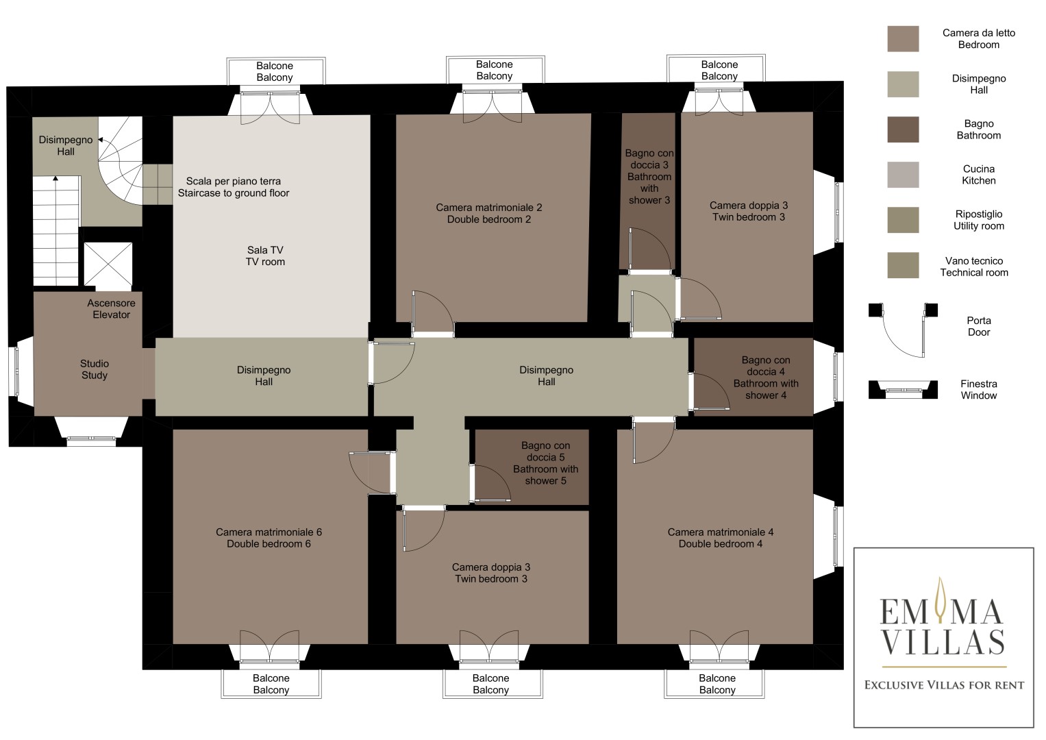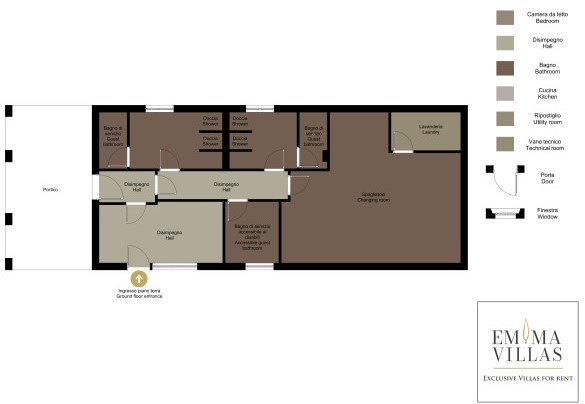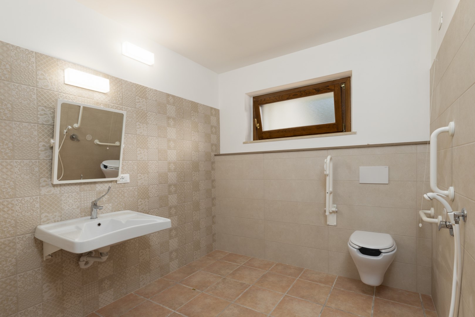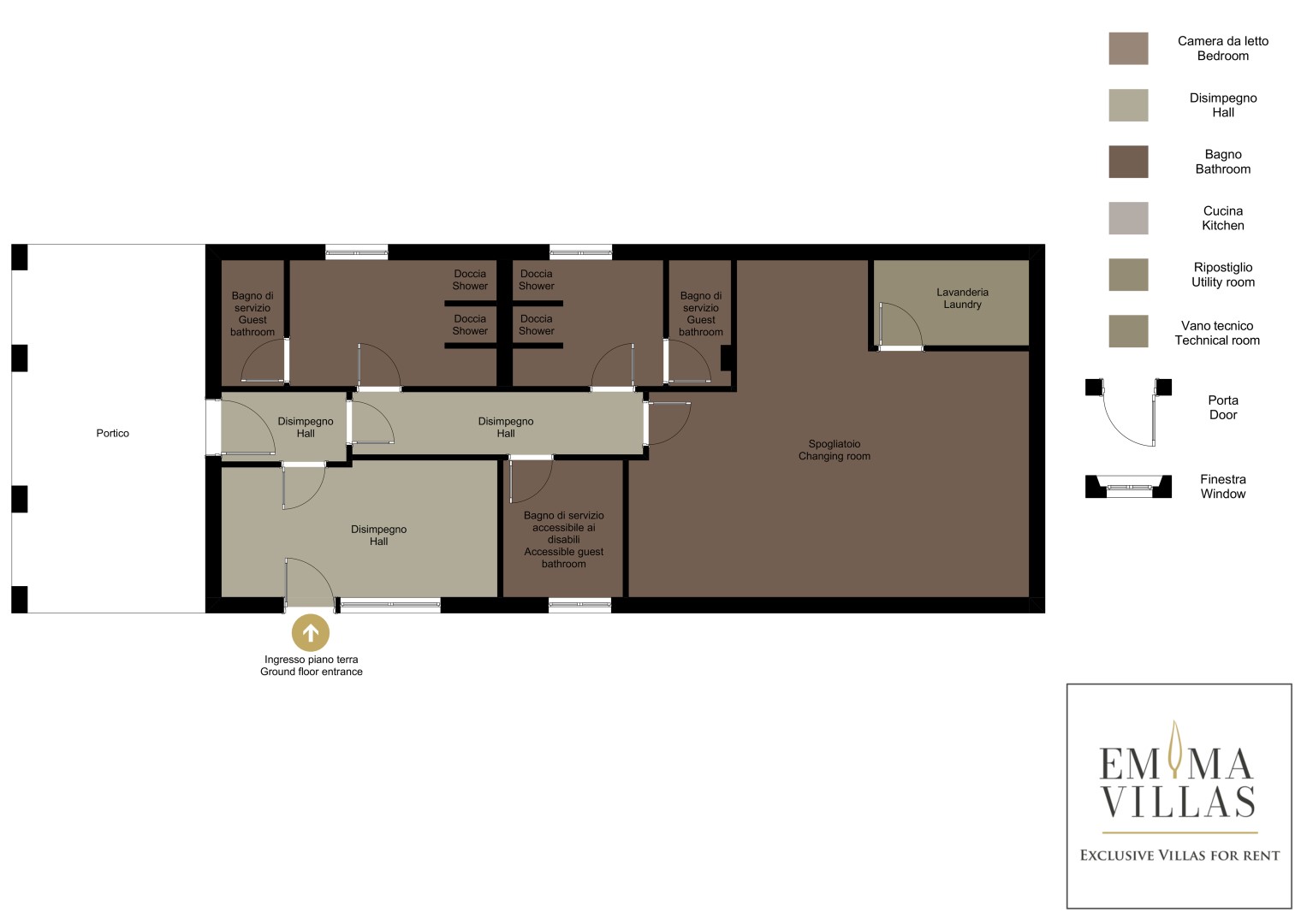 The property consists of the main villa and an annex, totalling approximately 365 sq m. VILLA (on two floors connected by internal stairs and lift) - GROUND FLOOR – Open-plan living room with kitchen and dining area; double bedroom with ensuite bathroom with shower; bathroom with tub (accessible via internal stairs), laundry room. FIRST FLOOR – TV room; study; three double bedrooms; two twin bedrooms; three bathrooms with shower. ANNEX (two floors connected by external stairs) – GROUND FLOOR – Changing room, two guest bathrooms, bathroom for disabled guests, four showers, laundry room. SECOND FLOOR – Living room with TV; bathroom with shower.
