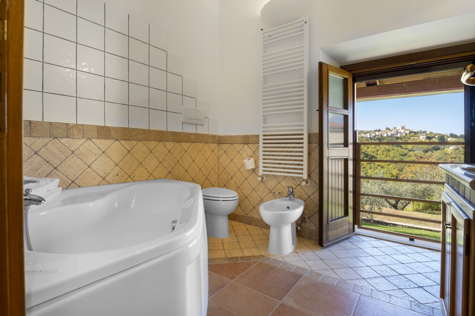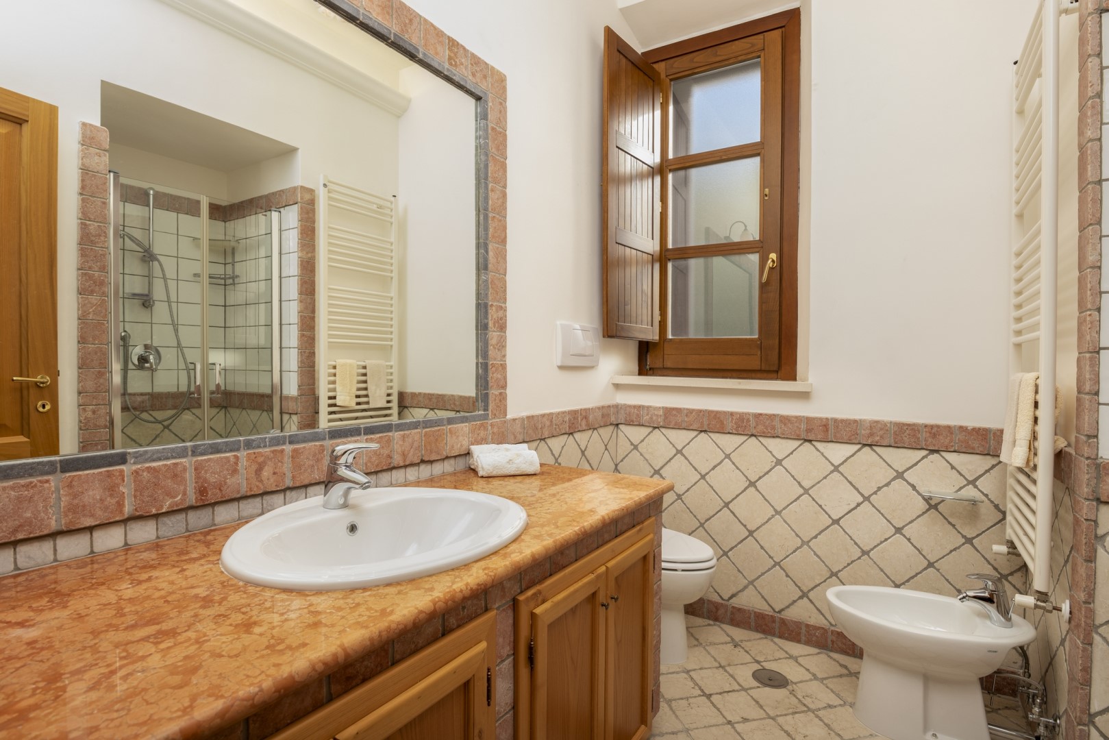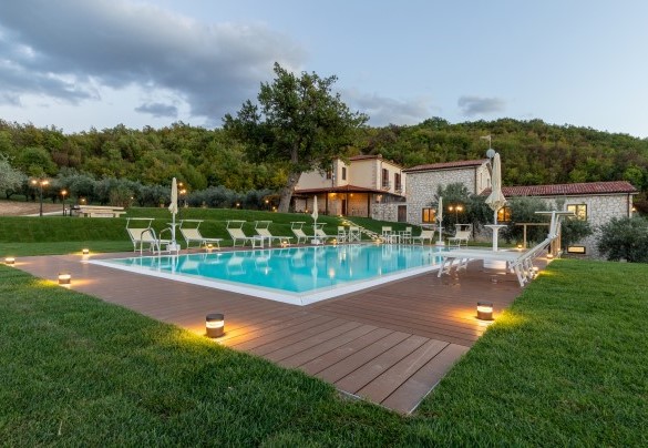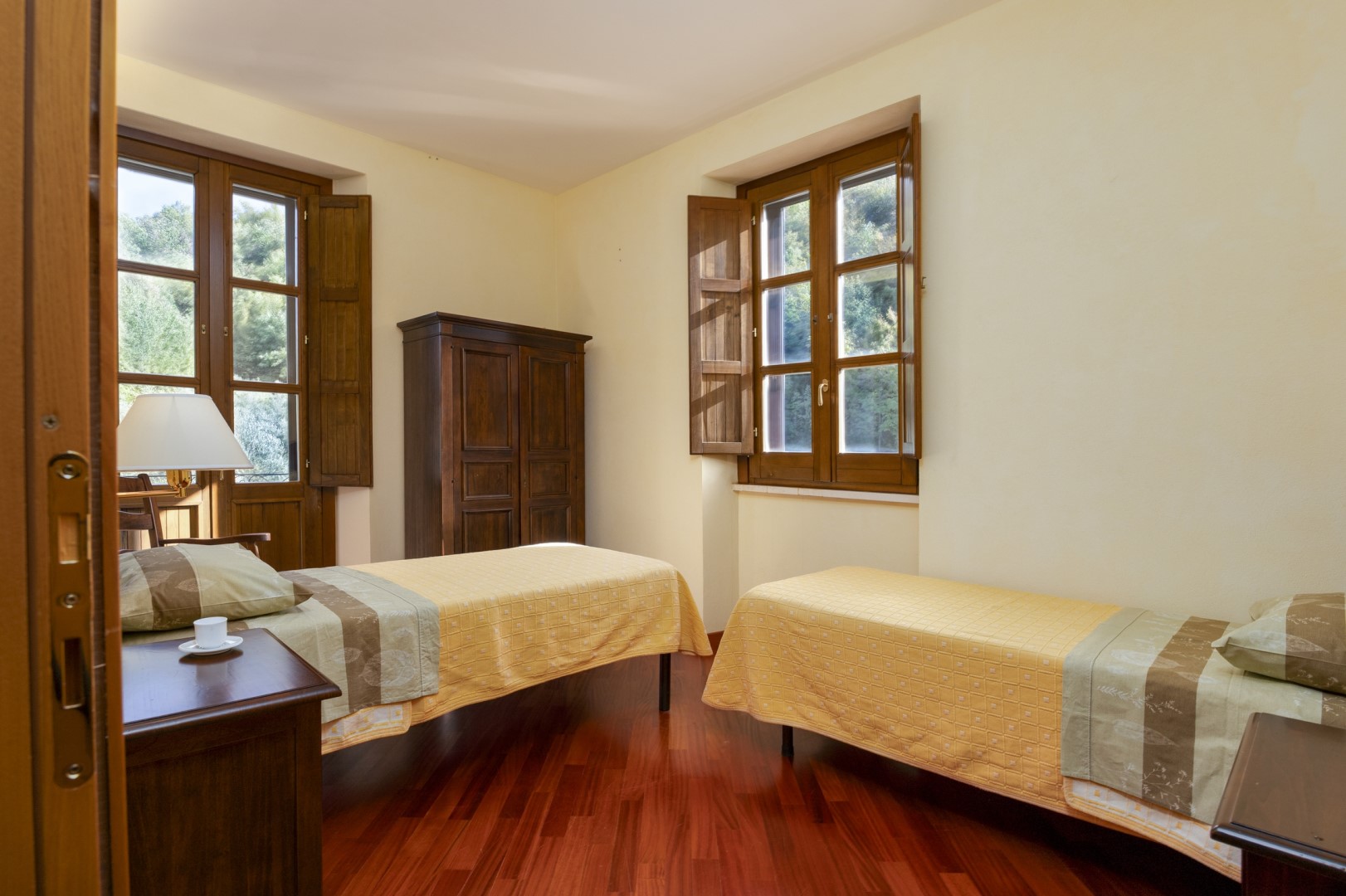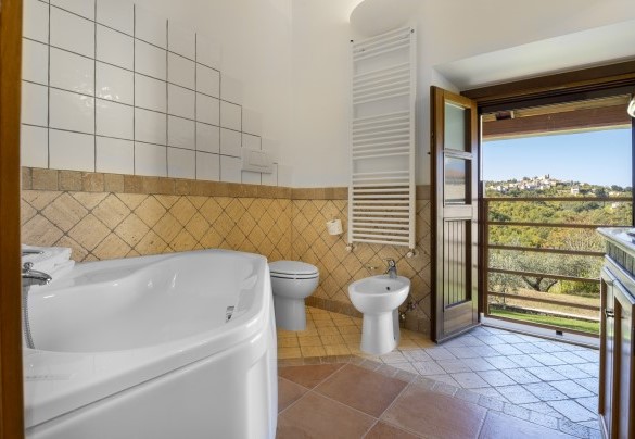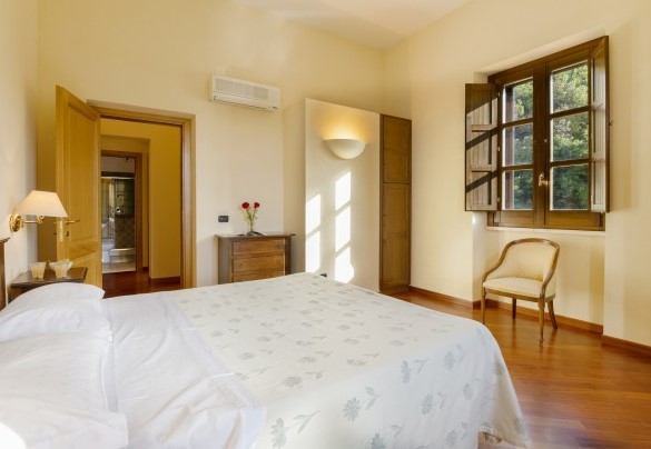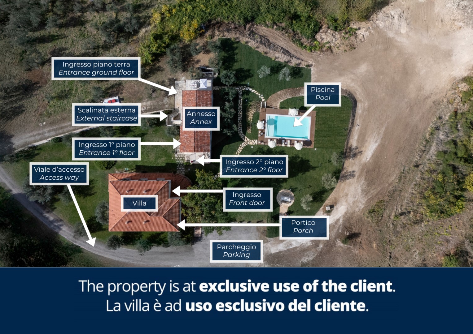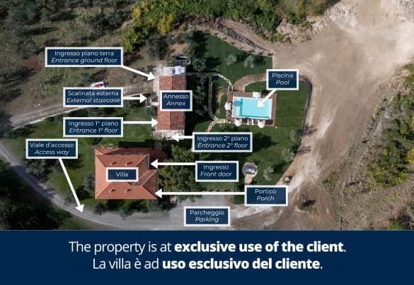 Villa Cusano is located at an altitude of 405 metres above sea level. The garden, of about 4,000 sq m, slopes gently down from the main villa towards the pool and annex, with green lawns and olive trees taking centre stage and framing the outdoor living areas. A furnished portico, located near the entrance to the villa, provides a shaded area ideal for outdoor dining with a barbecue located nearby. Various relaxation areas invite guests to relax and unwind, surrounded by nature. The property includes a large outdoor parking area that can accomodate about ten cars.