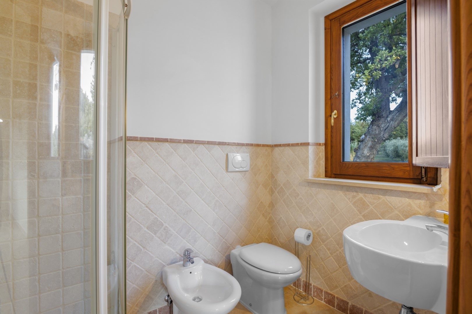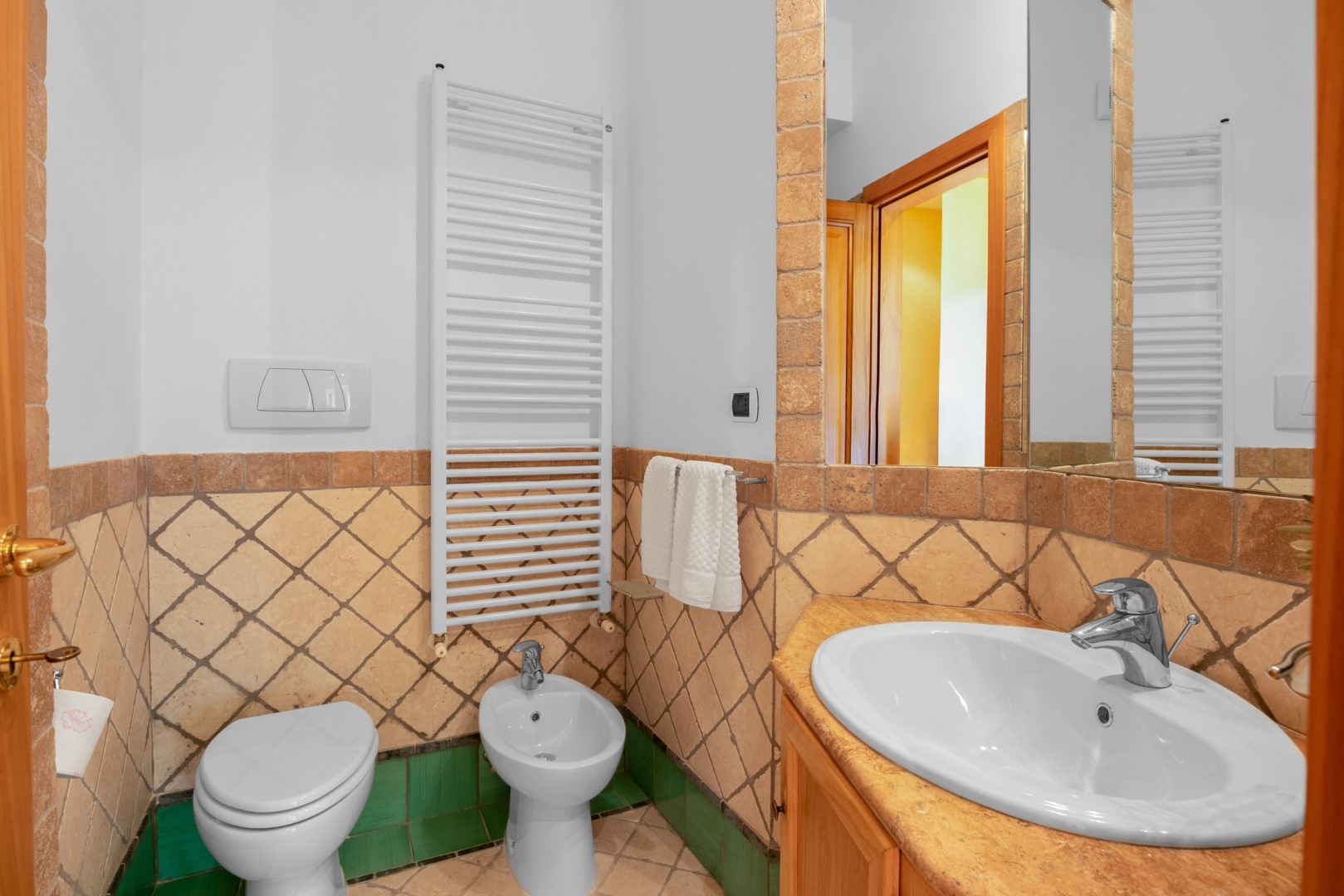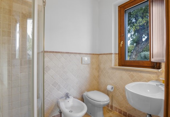 The panoramic infinity pool is located on a terrace slightly lower than the villa, about 25 metres away, and is reached along a path in grass and stone. Rectangular and measuring 12 x 6 m with a depth of 1.30 m, it features a “beach”, a gradually-sloping entry area for children of 6 x 1.60 m with a constant depth of 0.40 m. Lined in PVC with five submerged steps and a metal ladder for access; chlorine purification. The teak-effect solarium surrounding the pool is equipped with sunbeds, tables, chairs and umbrellas. Internal and external lighting allows for nighttime use. Available to guests in the annex is a changing room, three guest bathrooms and four showers. Open from the last Saturday in April to the first Saturday in October.