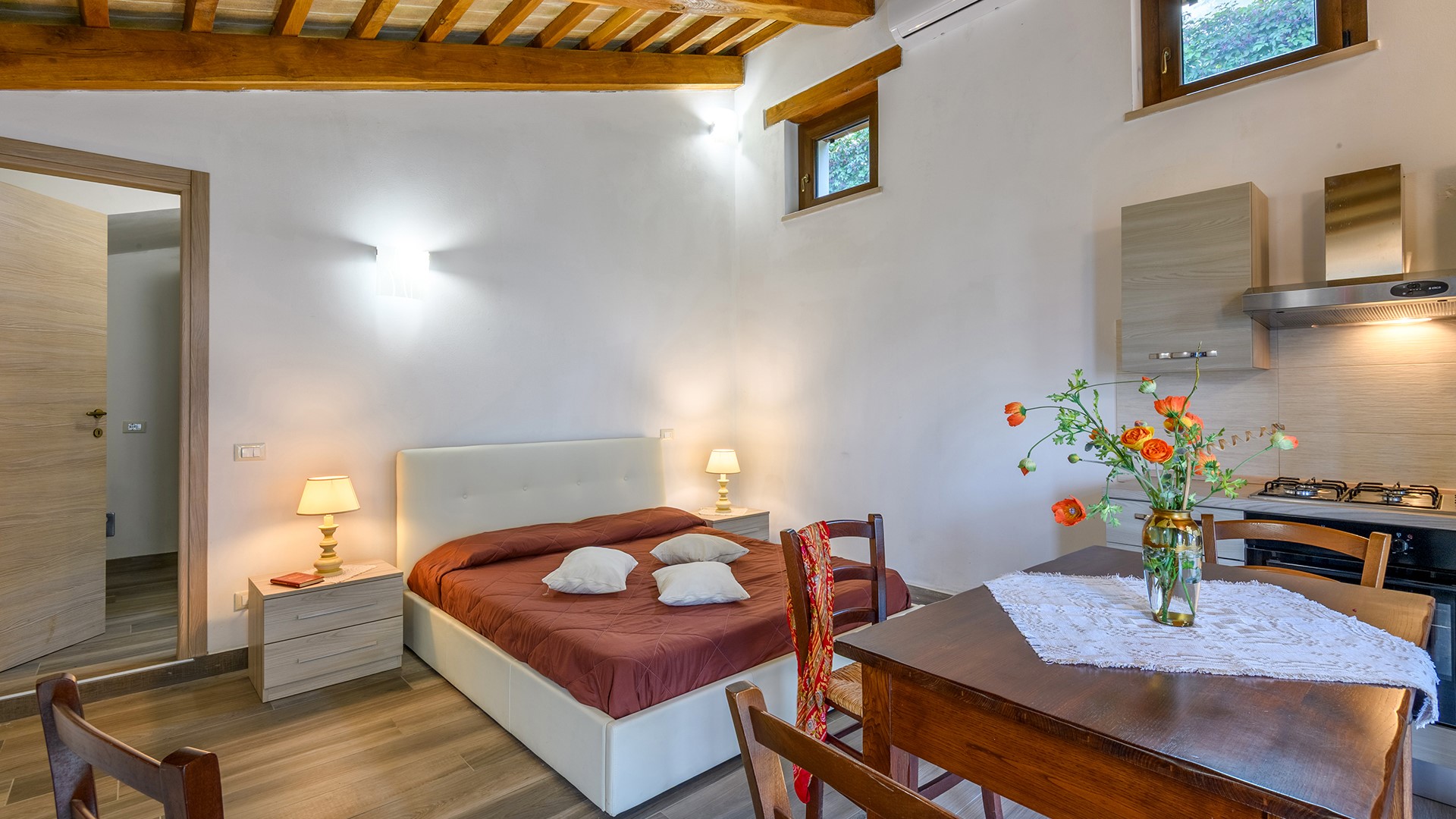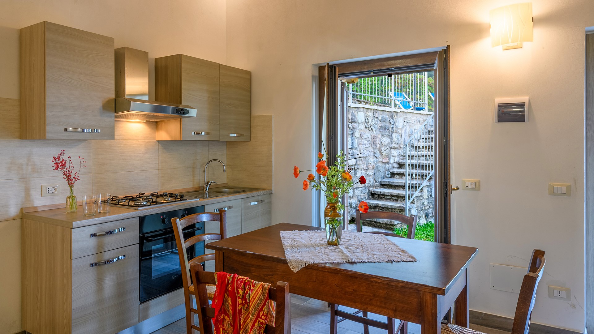 The house is spread over two floors with an independent ground-floor unit. GROUND FLOOR – Open-plan living area with a sofa and fireplace; modern kitchen with an island and dining area; large windows leading to a furnished outdoor terrace; one double bedroom. FIRST FLOOR – One double bedroom; bathroom with shower. INDEPENDENT UNIT (GROUND FLOOR) – Accessible via a separate entrance and suitable for guests with reduced mobility); includes a double bedroom, kitchenette, and an en-suite bathroom with a shower.