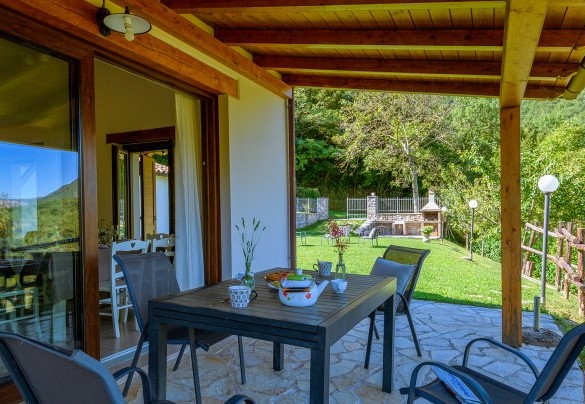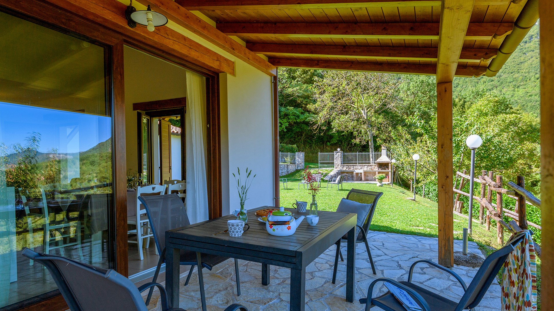 The lawned garden is terraced and each level is connected by steps and slopes. There is outdoor seating and sun loungers on each level. An outdoor dining area is located on a paved terrace adjacent to the kitchen, with views of the surrounding wooded hills, creating a natural setting for relaxation and al fresco meals.