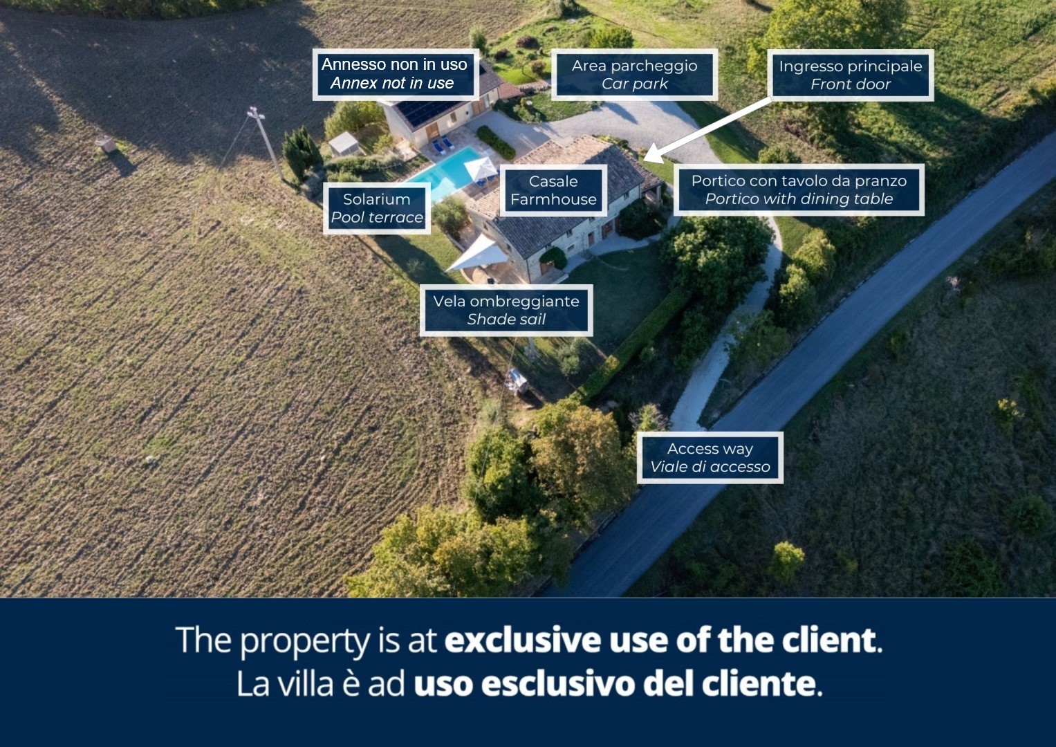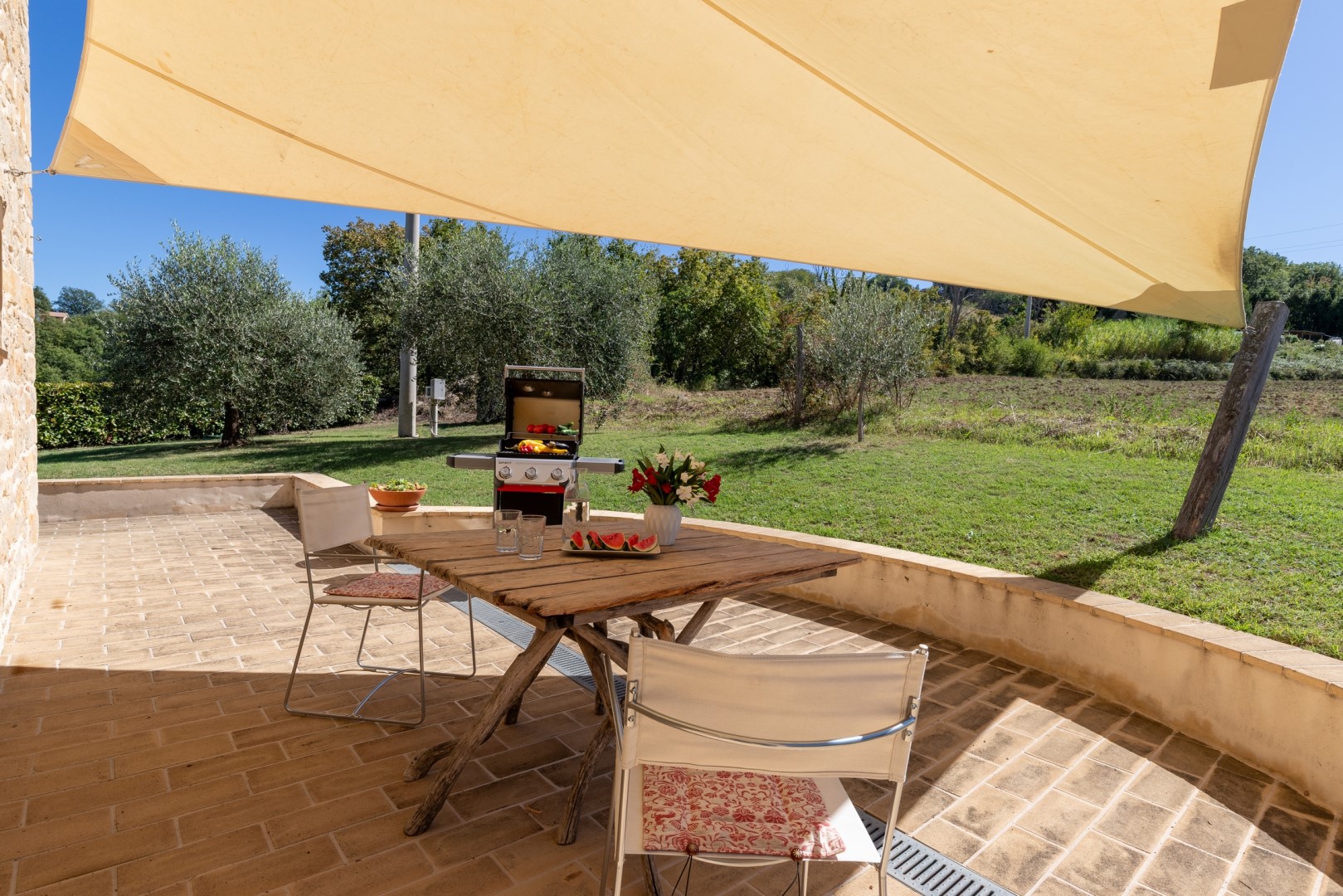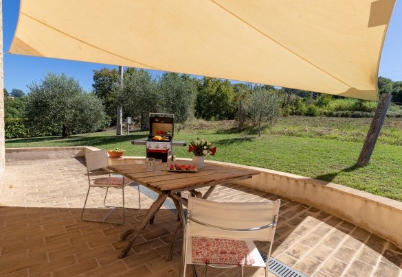 The farmhouse is surrounded by approximately 3,000 sq m of garden, located at an altitude of 540 m and bordered by hedges, fruit and olive trees. The garden is mostly flat around the house and the swimming pool, and then slopes gently down towards the ground below. A portico with a dining and sitting area offers splendid views of the surrounding countryside. On the opposite side of the house is a shaded area with a barbecue. Within the property is an uncovered parking area for up to three cars