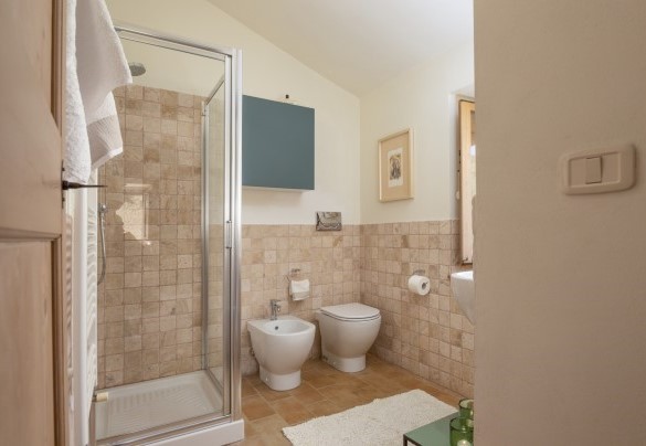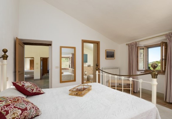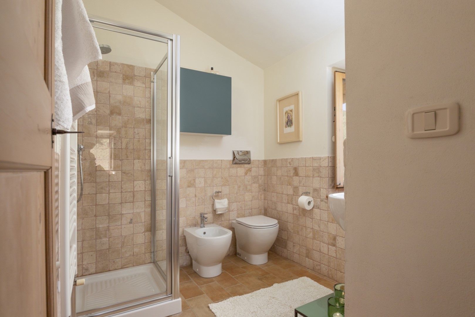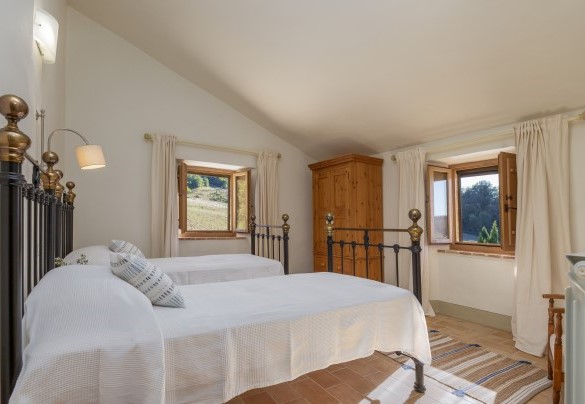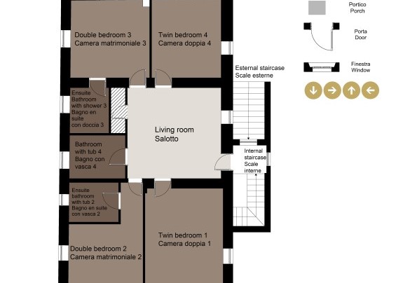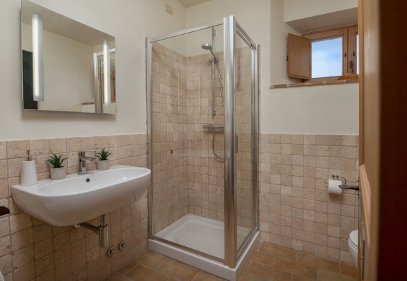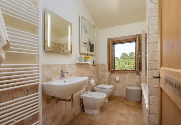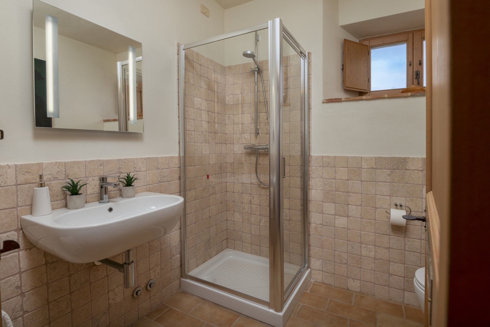 The farmhouse has an area of approximately 200 sq m spread over two floors, connected both internally and externally. GROUND FLOOR – Kitchen with dining area and access to the portico with dining table; sitting room; bathroom with shower; laundry room. FIRST FLOOR – Living room with TV, two double bedrooms (150 cm wide beds), one with ensuite bathroom with tub and the other with ensuite bathroom with shower; two twin bedrooms; bathroom with tub.