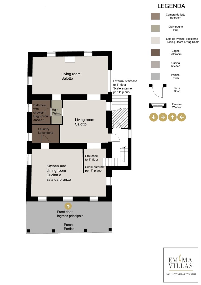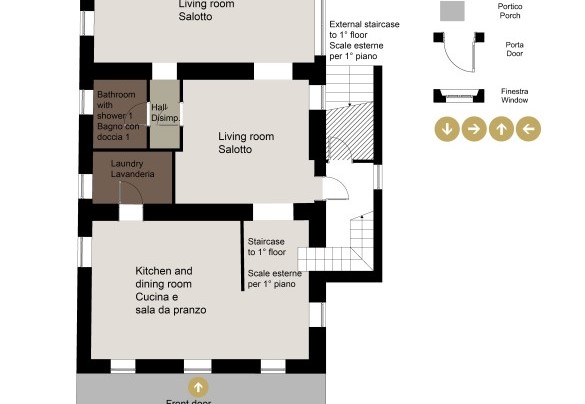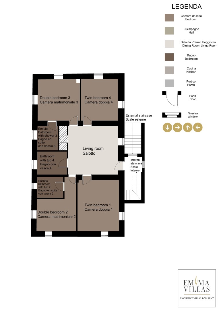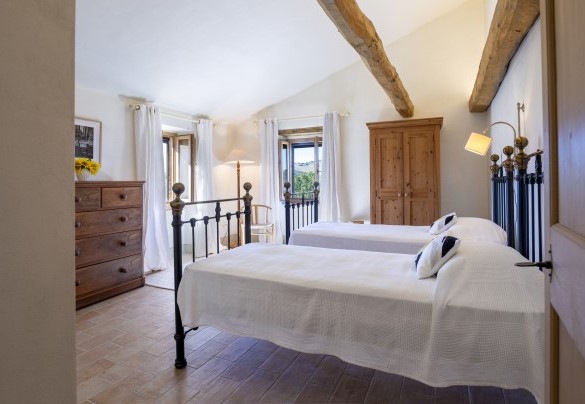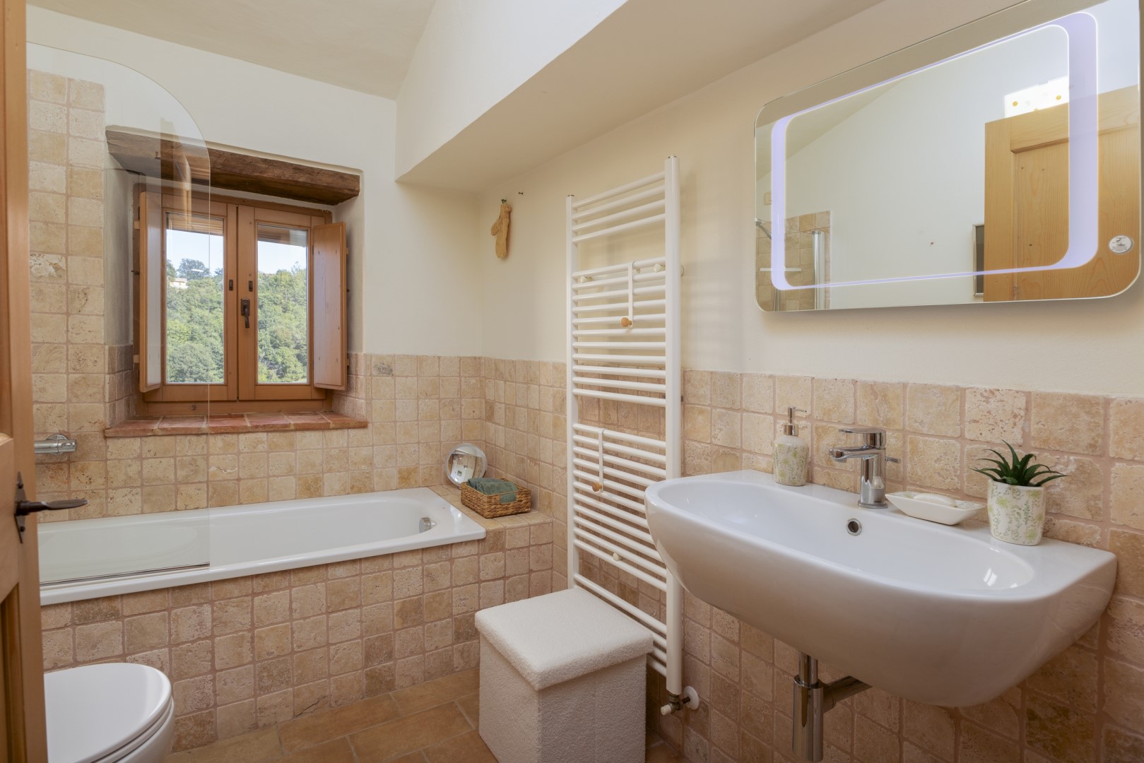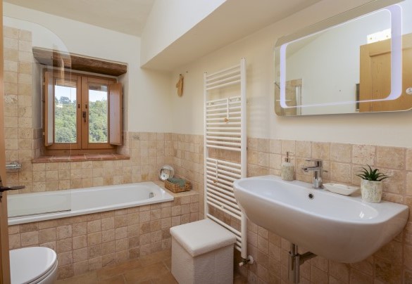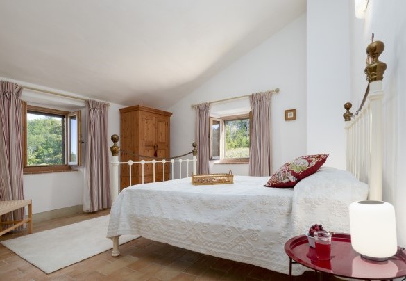 The farmhouse has an area of approximately 200 sq m spread over two floors, connected both internally and externally. GROUND FLOOR – Kitchen with dining area and access to the portico with dining table; sitting room; bathroom with shower; laundry room. FIRST FLOOR – Living room with TV, two double bedrooms (150 cm wide beds), one with ensuite bathroom with tub and the other with ensuite bathroom with shower; two twin bedrooms; bathroom with tub.