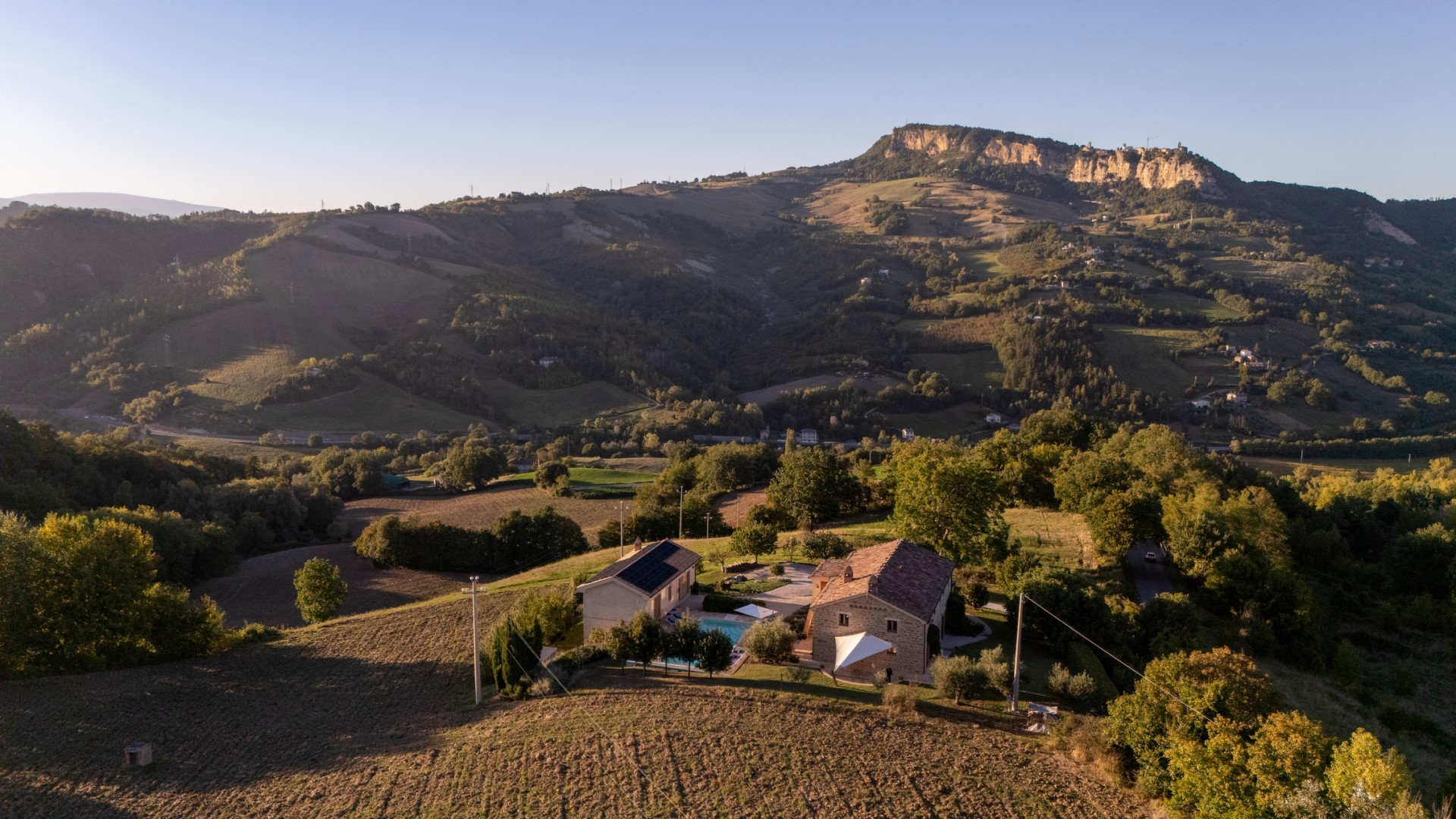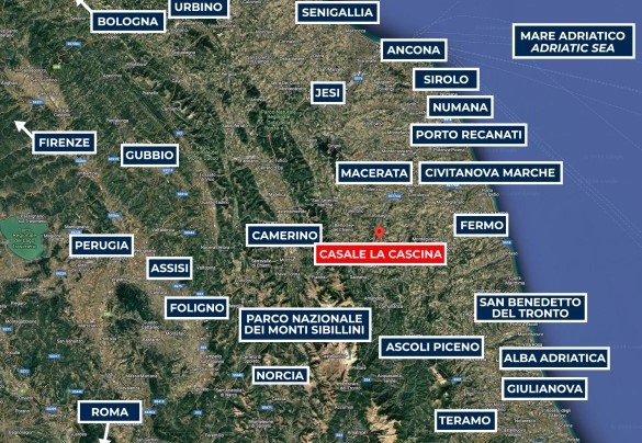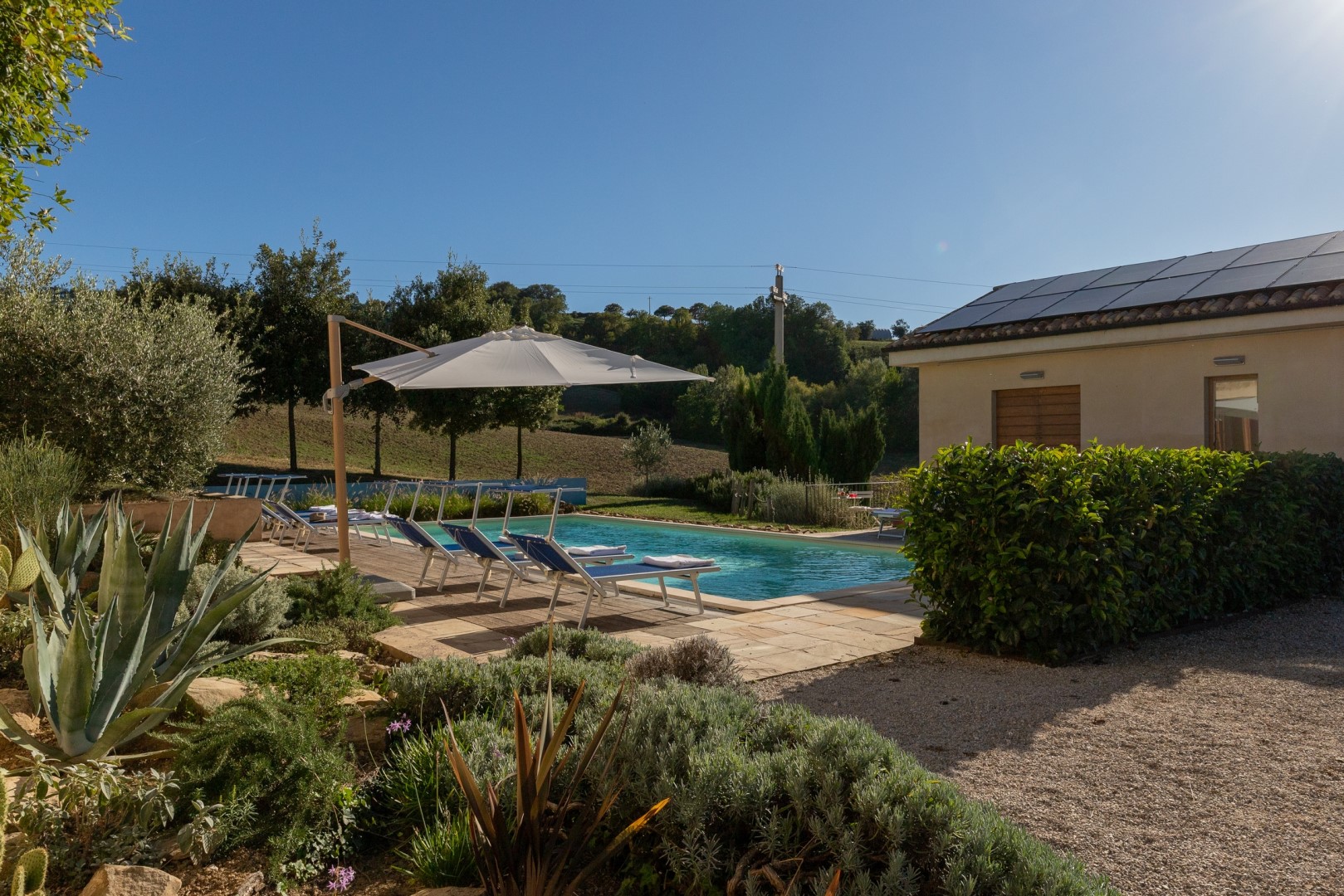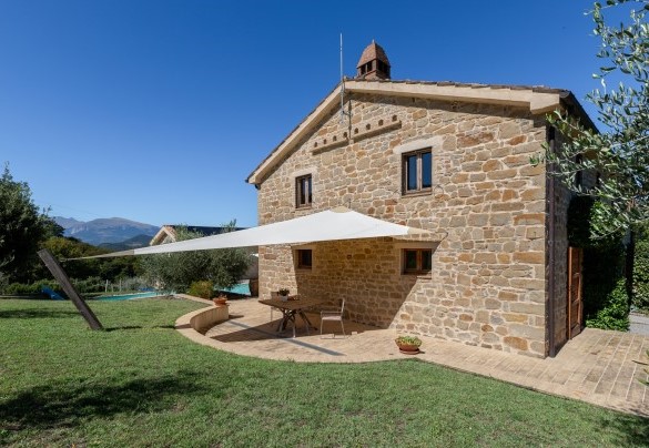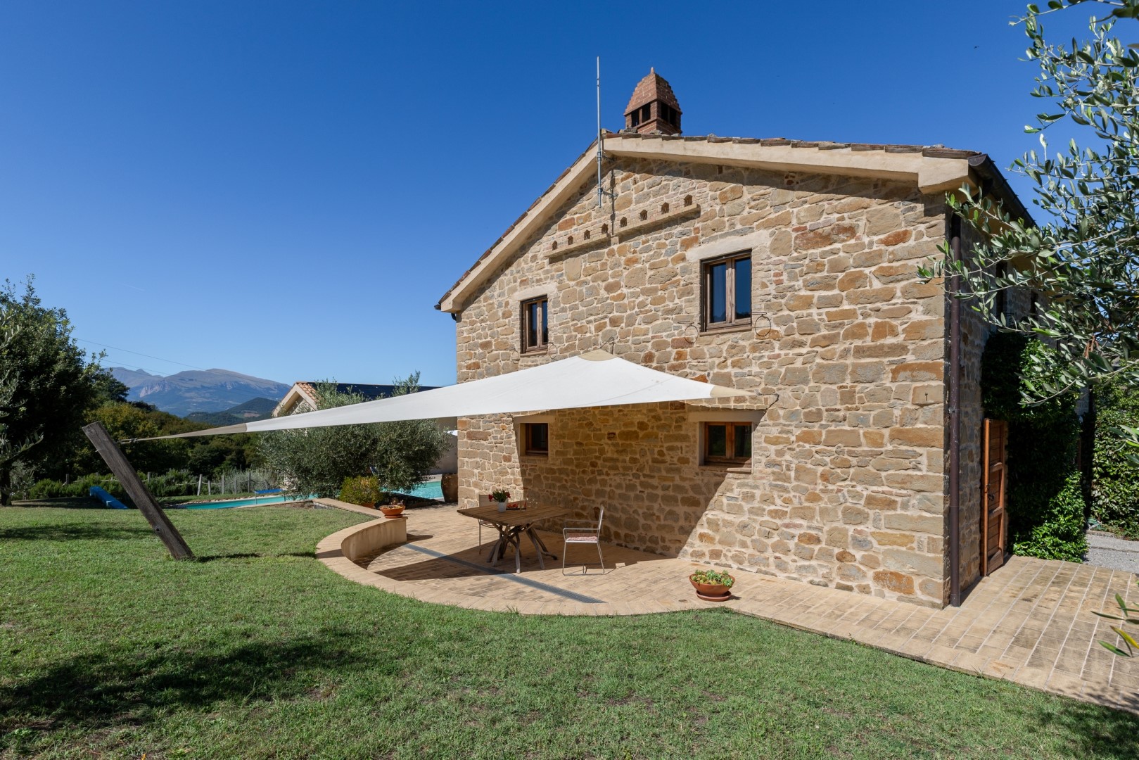 PRIVATE STRUCTURE (lease only). Casale La Cascina is an old and welcoming, renovated stone house situated on a hill with open views over the green Marche countryside and a breathtaking panorama of the Monti Sibillini. The two-storey farmhouse includes four bedrooms, a bright living area and a kitchen with dining area connected to a portico organised for al fresco dining. The well-kept garden surrounding the property features olive trees, hedges and tall trees. Completing this enchanting setting is a salt-purified swimming pool that invites guests to relax while admiring the endless view: a perfect setting for regenerating body and spirit, immersed in the rhythms of nature. The strategic location offers easy access to the cultural and natural attractions of the Marche region. Note: The property includes a private annex which will remain unoccupied during the guests' stay.