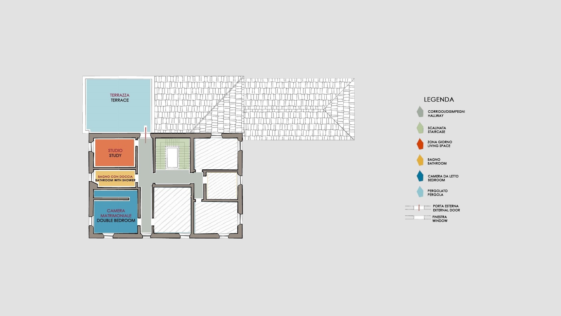 The structure consists of three-floors connected internally by a stone staircase. The main entrance is located on the ground floor, in front of a green area with a large table and chairs. To the right of the main entrance is a living room furnished with Smart TV, sofa, armchairs and a table seating 6 with direct access to the outside. To the left of the entrance is a sitting room with frescoed ceilings, antique stone fireplace, sofa, armchairs, piano (tuned) and a dining table seating 8, with direct access to the outside. From the main entrance, a short corridor leads, on the left, to a guest bathroom and to a small games room with table football, and, on the right, to the dining room with an extendable table seating up to 14 people, with direct exit out to the gazebo with tables and to the pool area. The dining room is connected by a small arch to the kitchen with marble peninsula with stools and a wooden table with bench and chairs for 8 people, TV and direct outside exit. From the kitchen, through a door and up 4 steps and then down 4 steps, you come to the laundry area with a wood oven, a bathroom with shower and the stairs leading to the caretaker's house. Returning to the main entrance and going up 21 steps to the first floor, you come to a small landing which leads, through two respective doors, to the two wings of the first floor. In the right wing is a study, a double bedroom with ensuite bathroom with shower and tub, three double bedrooms and a bathroom with shower and tub, while in the left wing is a double bedroom with ensuite bathroom with shower and a study with Smart TV. Going up 21 steps to the second floor you come to a small landing which leads to a double bedroom with walk-in closets, a bathroom with shower and a small TV room (Smart TV) embellished with old books. Also on the second floor is a furnished panoramic terrace which is accessed from the corridor through a French window.
