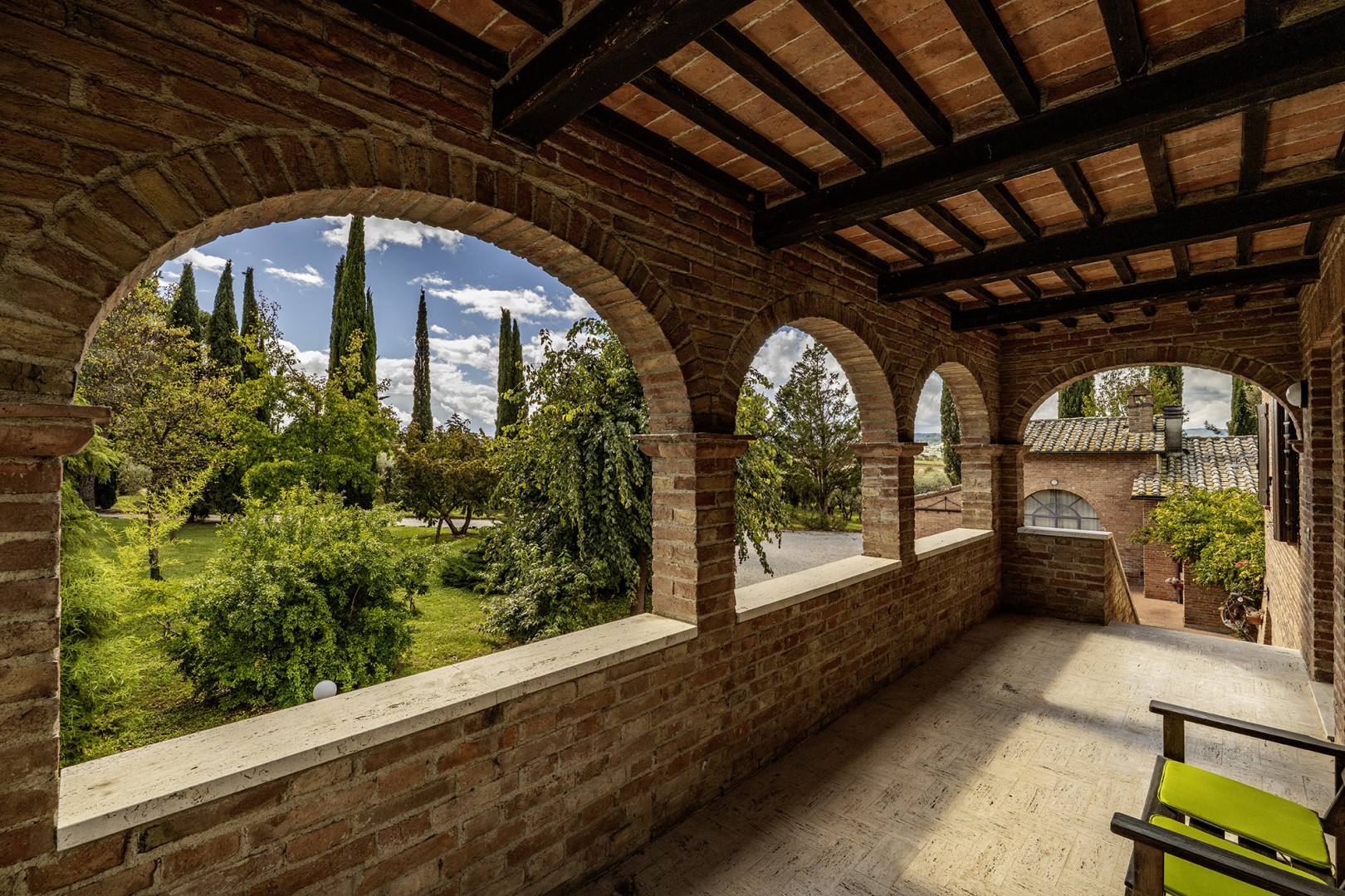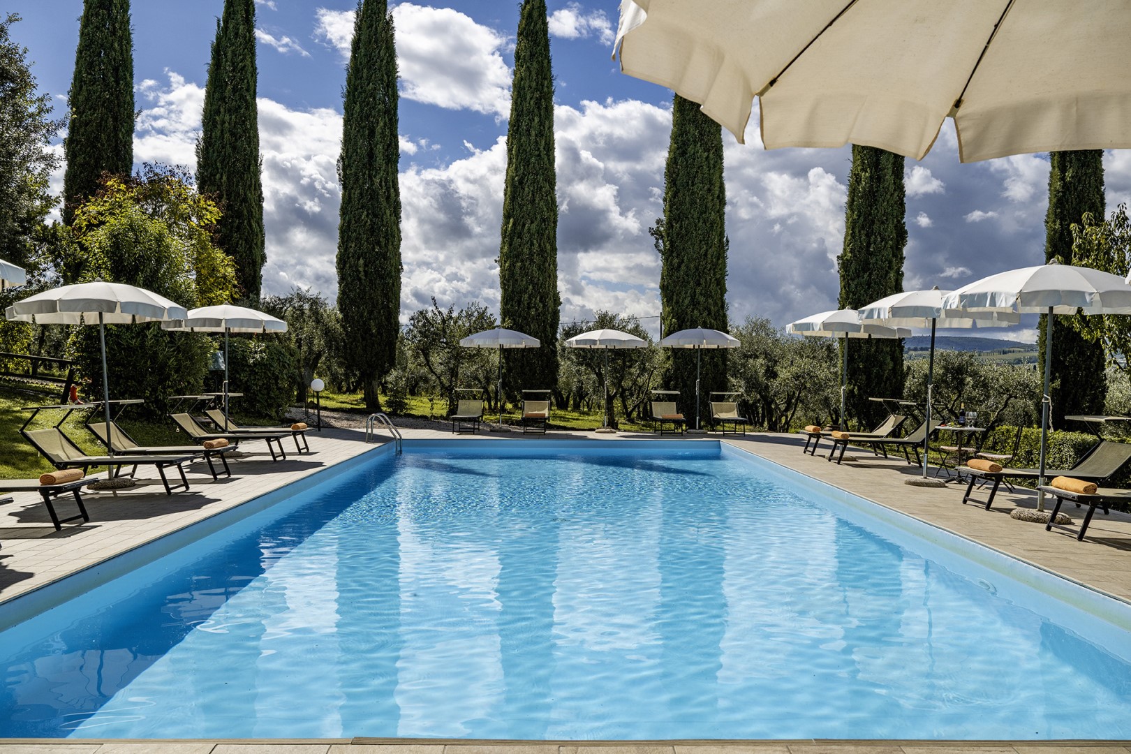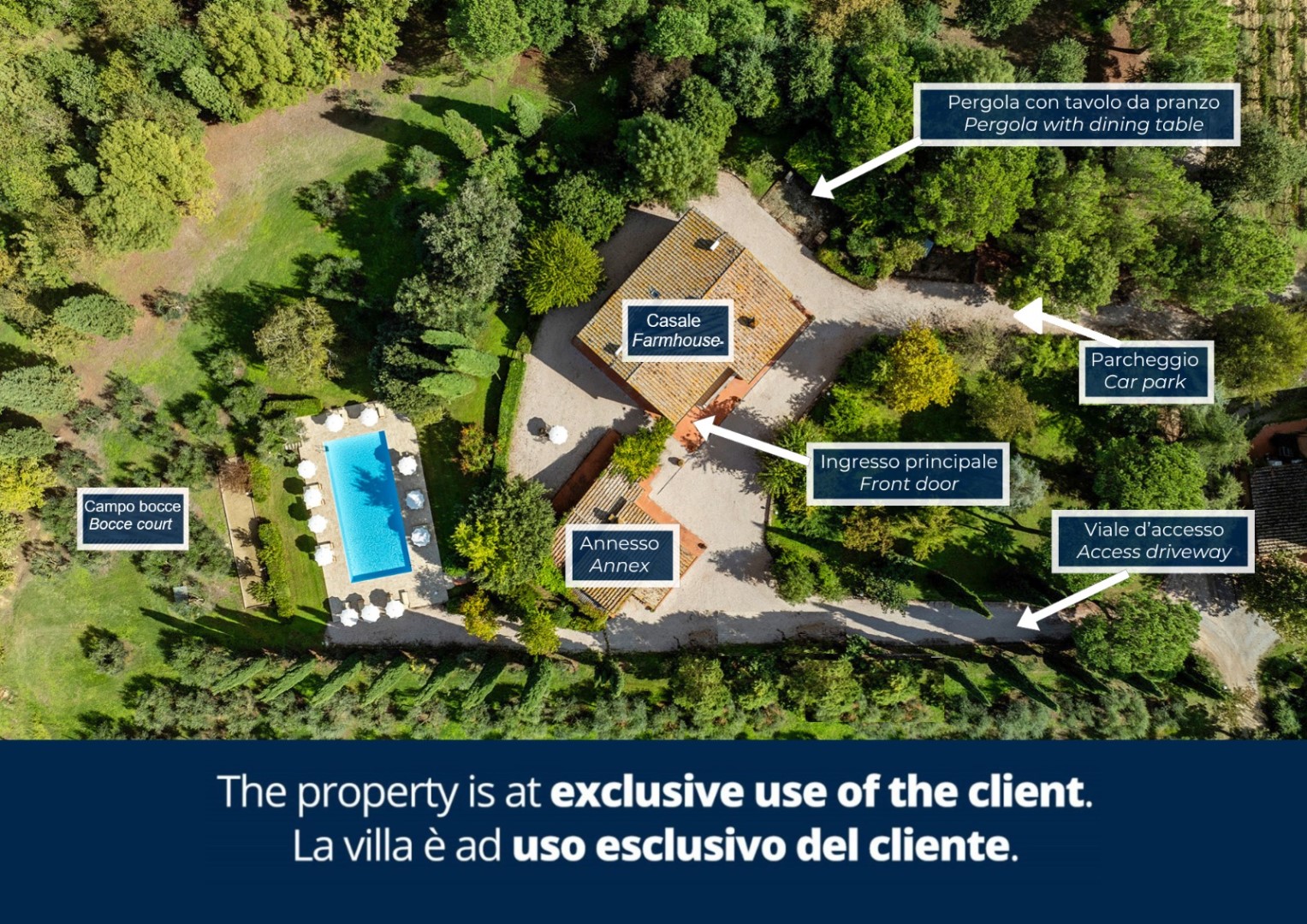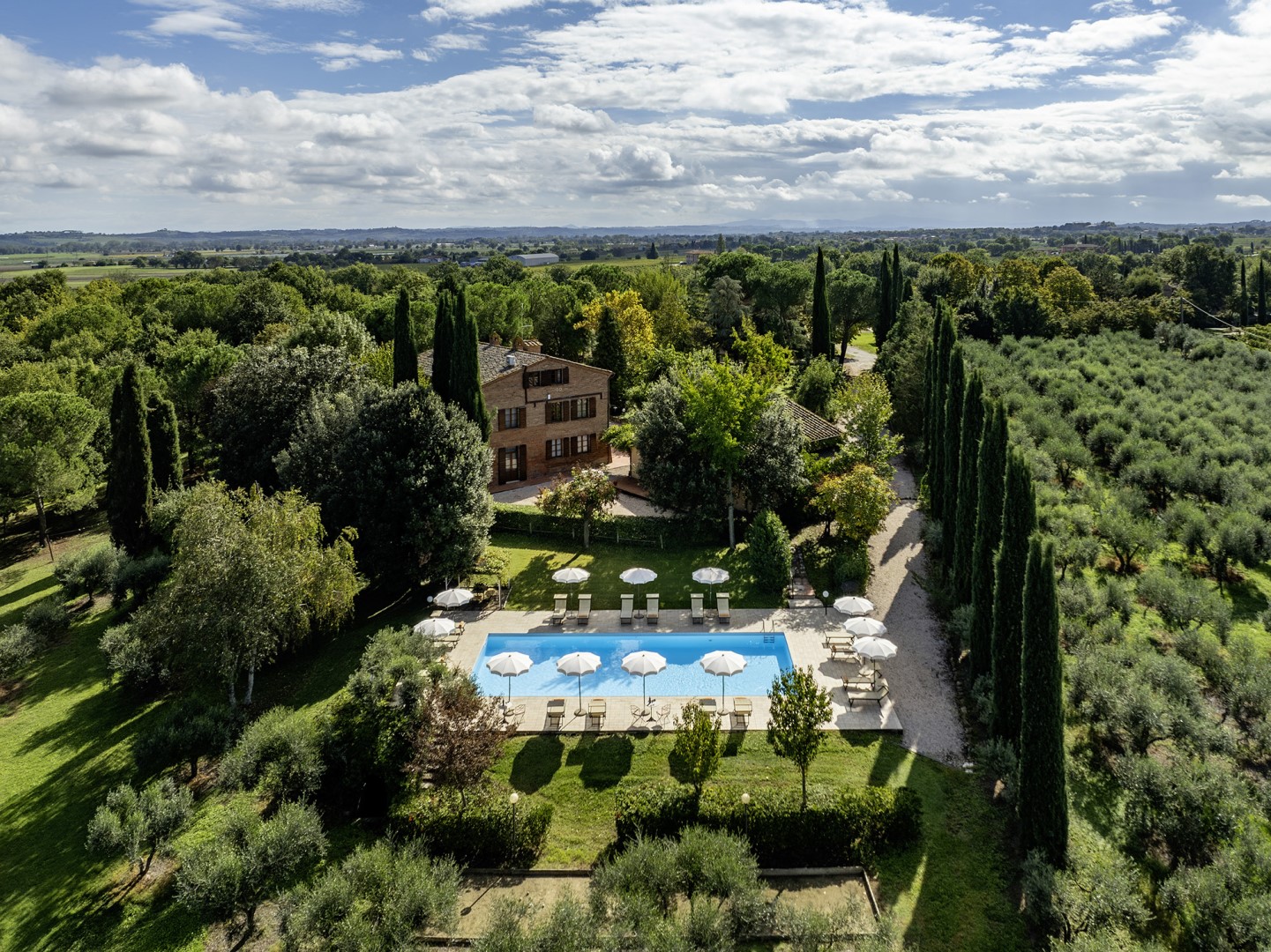 The park covers approximately one hectare within the vast agricultural estate, which includes cultivated fields, olive groves and vineyards, and is naturally bordered by hedges and vegetation. Access is via a gate that opens onto an internal driveway of about 400 m, at the end of which is the parking area. Conveniently located near the kitchen exit are the stone barbecue and the dining table shaded by a pergola. Several outdoor relaxation areas, a bocce court and the pool area complete the park, surrounded by the typical vegetation of olive and cypress trees. Please notice that photos are taken in spring, therefore flower blossoming, and the colours of the gardens' grass could be different at the moment of your arrival at the villa.