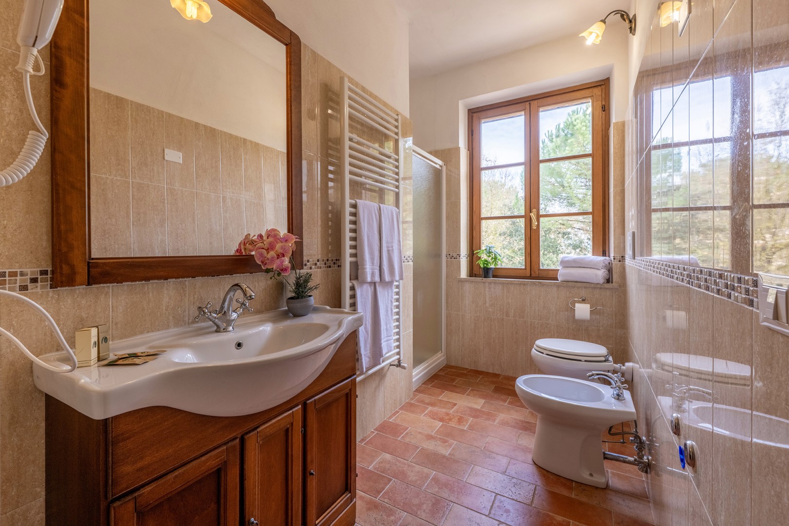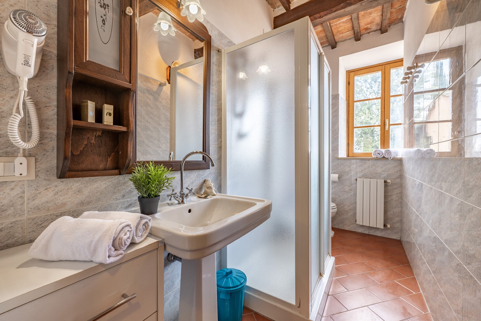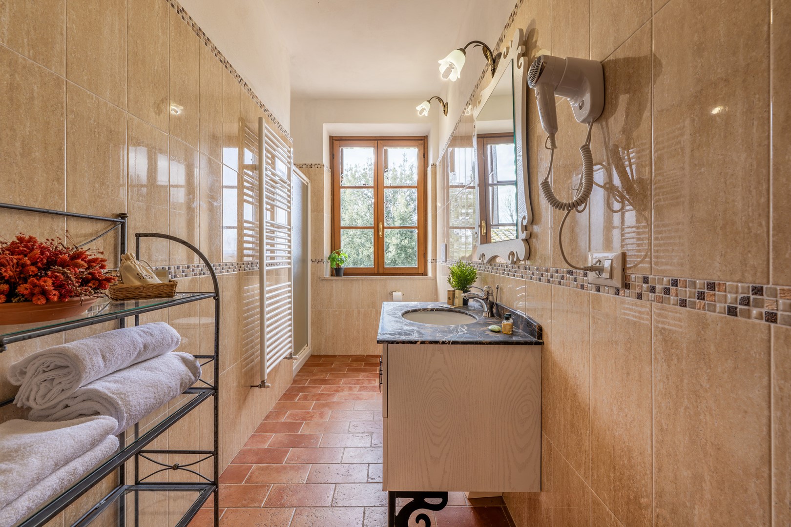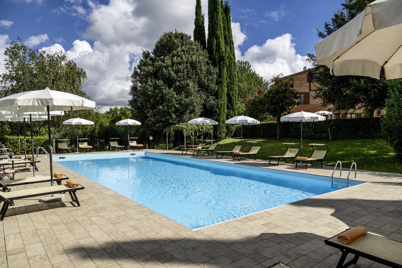 The park covers approximately one hectare within the vast agricultural estate, which includes cultivated fields, olive groves and vineyards, and is naturally bordered by hedges and vegetation. Access is via a gate that opens onto an internal driveway of about 400 m, at the end of which is the parking area. Conveniently located near the kitchen exit are the stone barbecue and the dining table shaded by a pergola. Several outdoor relaxation areas, a bocce court and the pool area complete the park, surrounded by the typical vegetation of olive and cypress trees. Please notice that photos are taken in spring, therefore flower blossoming, and the colours of the gardens' grass could be different at the moment of your arrival at the villa.
