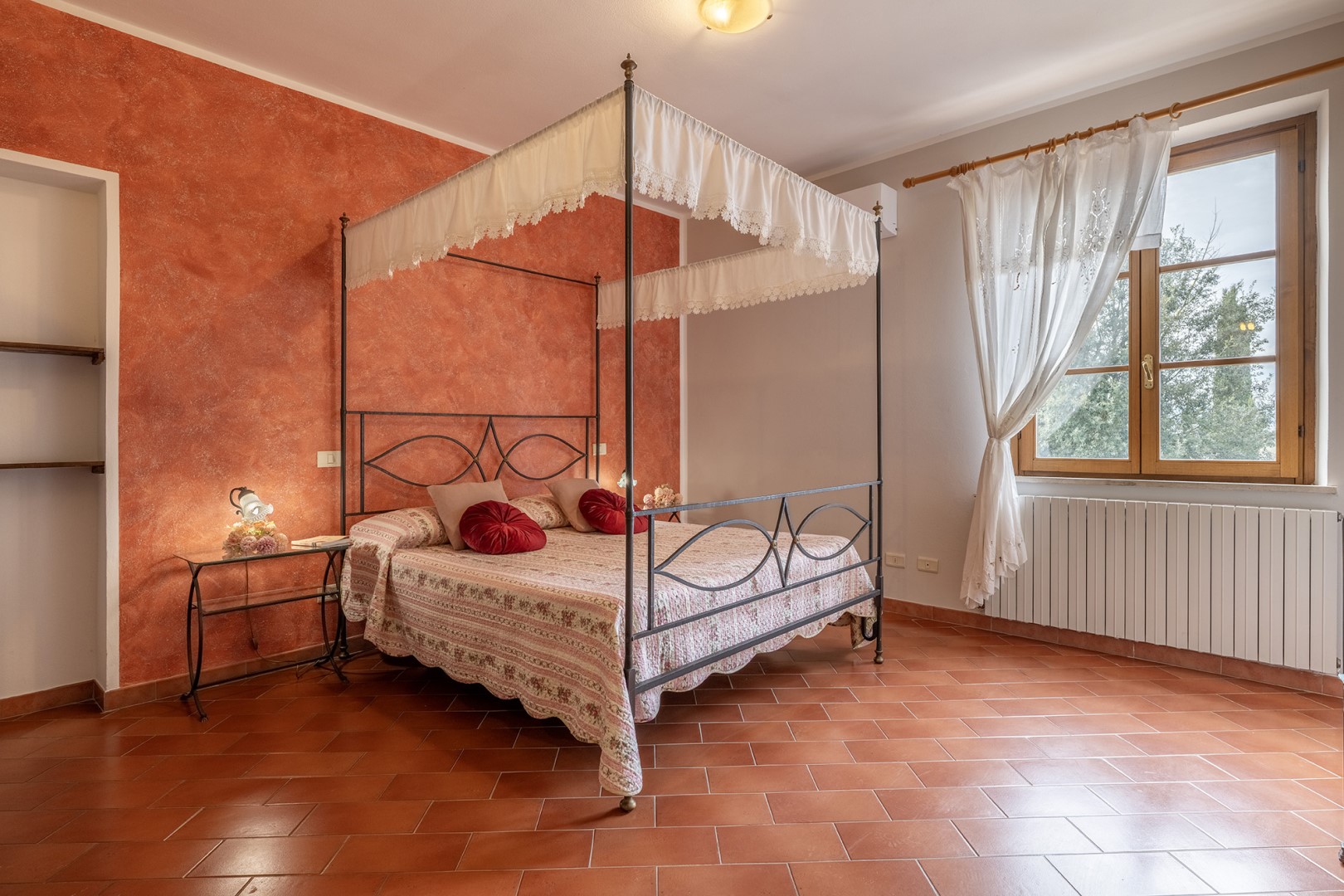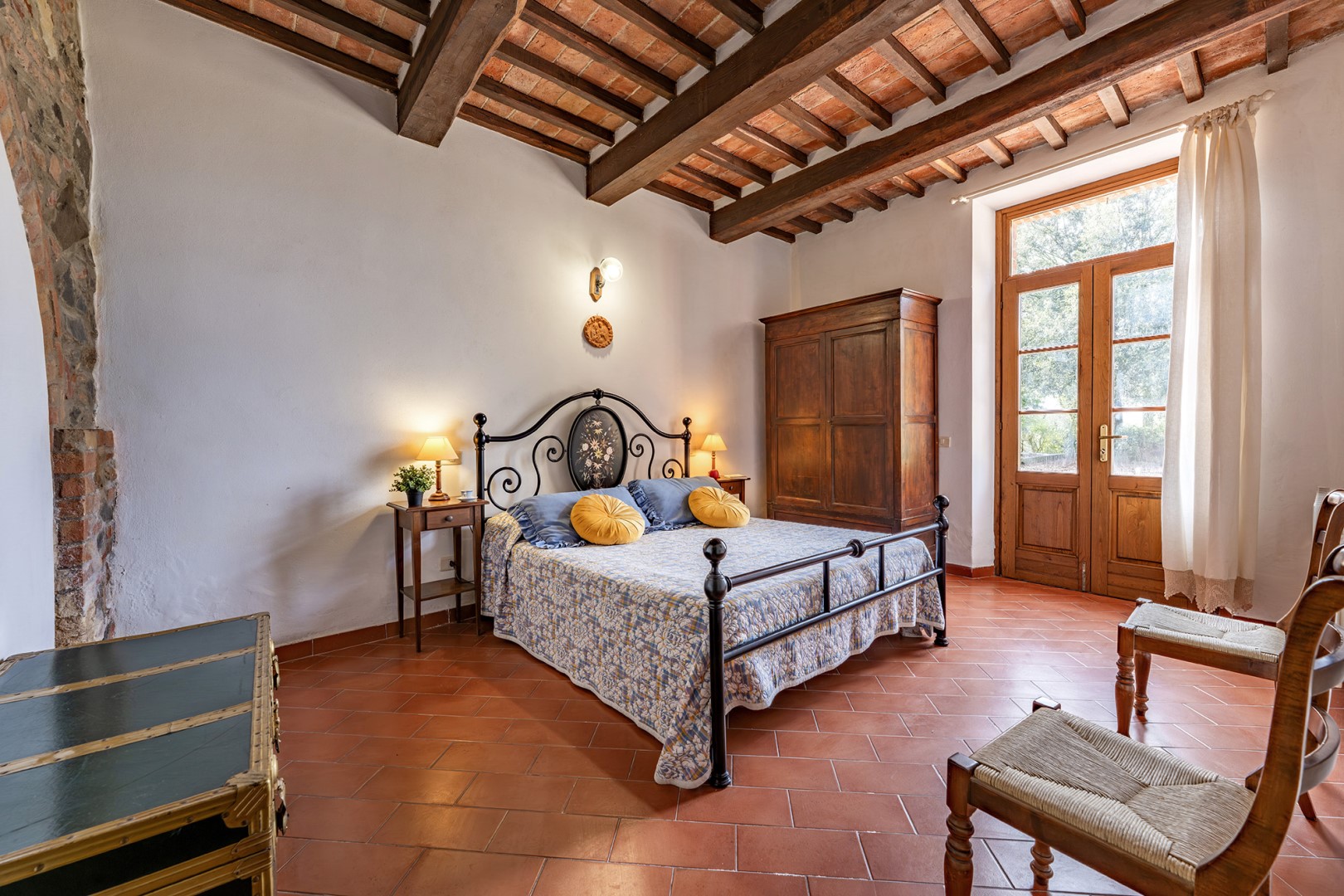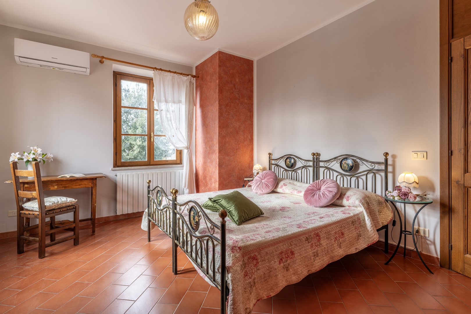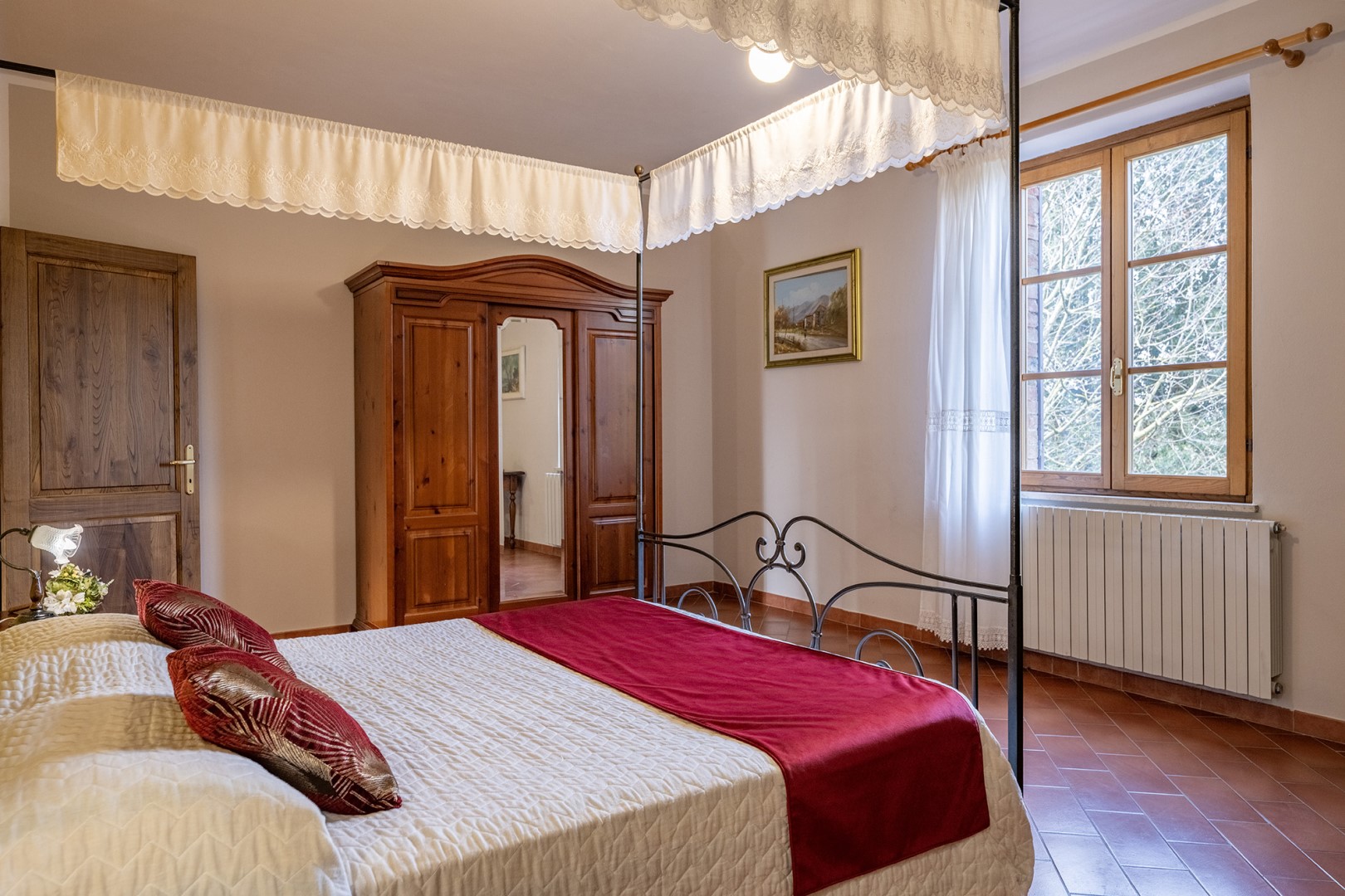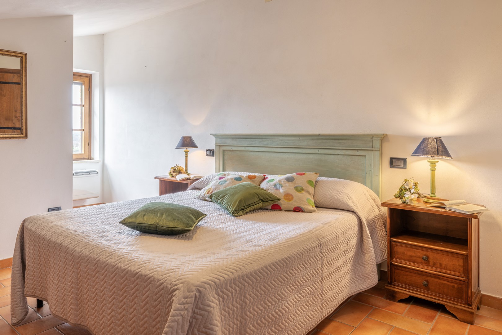 The park covers approximately one hectare within the vast agricultural estate, which includes cultivated fields, olive groves and vineyards, and is naturally bordered by hedges and vegetation. Access is via a gate that opens onto an internal driveway of about 400 m, at the end of which is the parking area. Conveniently located near the kitchen exit are the stone barbecue and the dining table shaded by a pergola. Several outdoor relaxation areas, a bocce court and the pool area complete the park, surrounded by the typical vegetation of olive and cypress trees. Please notice that photos are taken in spring, therefore flower blossoming, and the colours of the gardens' grass could be different at the moment of your arrival at the villa.
