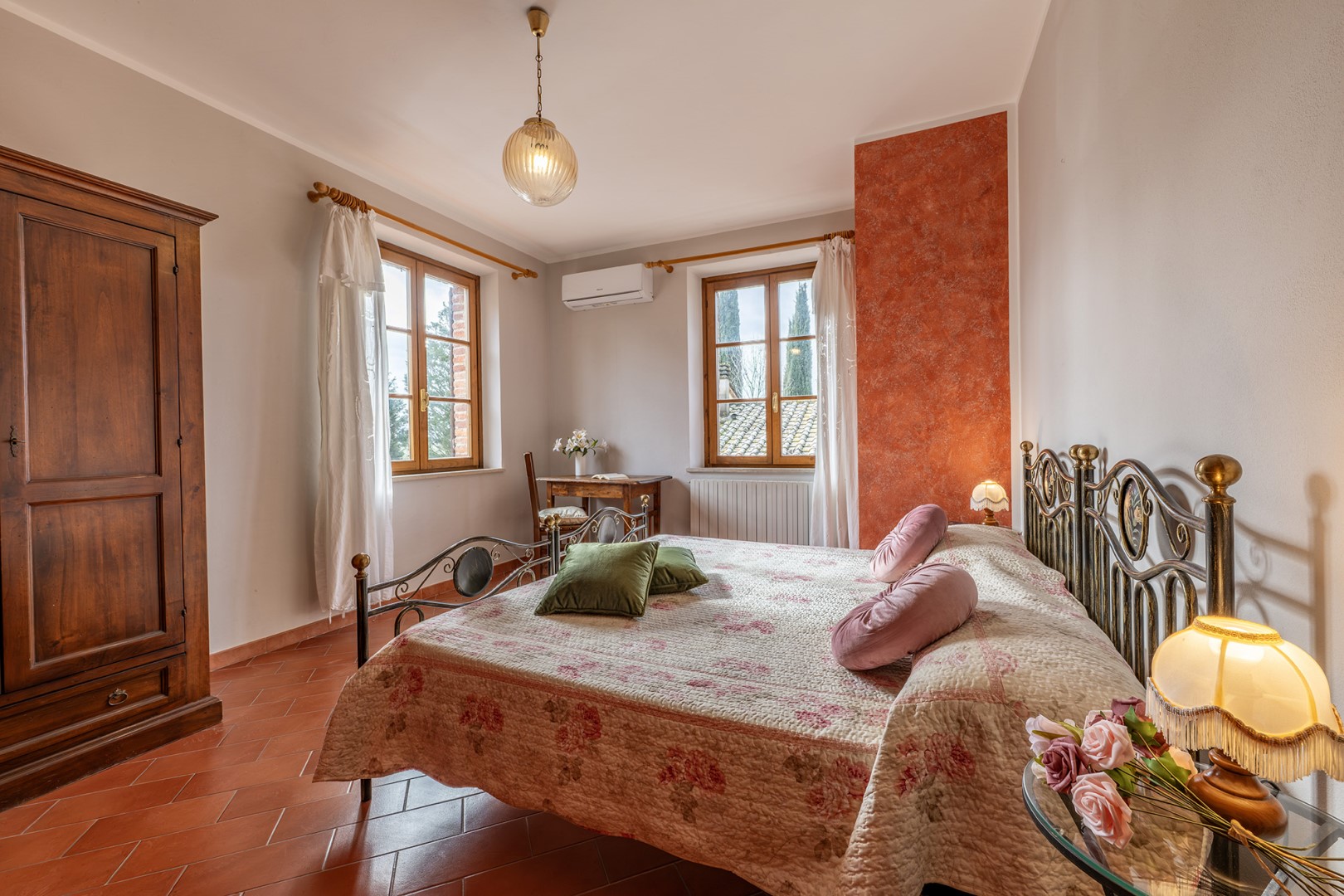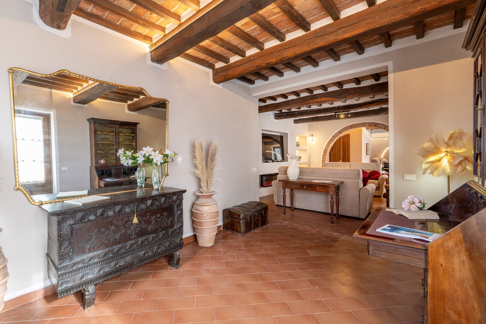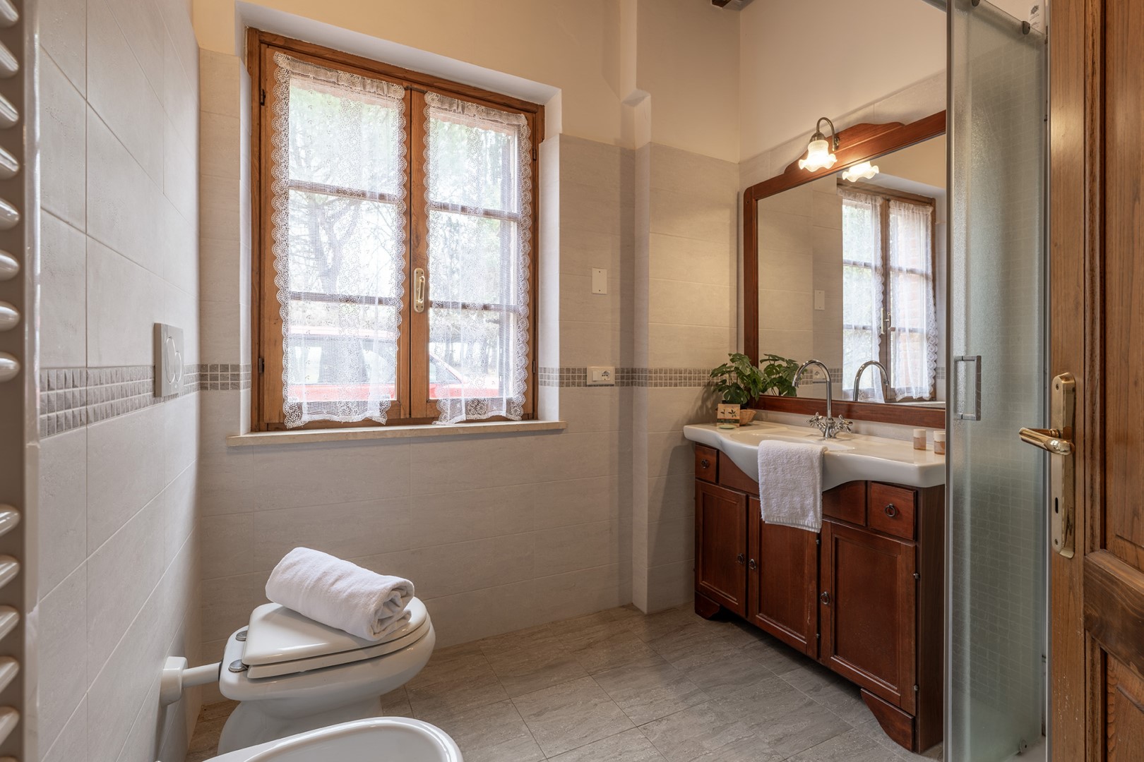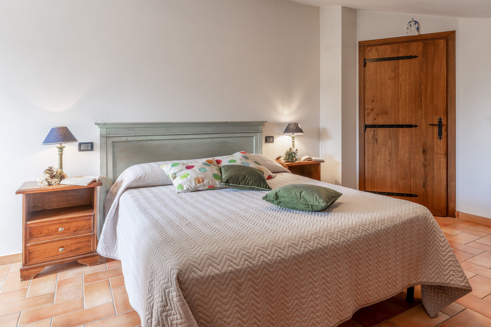 The park covers approximately one hectare within the vast agricultural estate, which includes cultivated fields, olive groves and vineyards, and is naturally bordered by hedges and vegetation. Access is via a gate that opens onto an internal driveway of about 400 m, at the end of which is the parking area. Conveniently located near the kitchen exit are the stone barbecue and the dining table shaded by a pergola. Several outdoor relaxation areas, a bocce court and the pool area complete the park, surrounded by the typical vegetation of olive and cypress trees. Please notice that photos are taken in spring, therefore flower blossoming, and the colours of the gardens' grass could be different at the moment of your arrival at the villa.