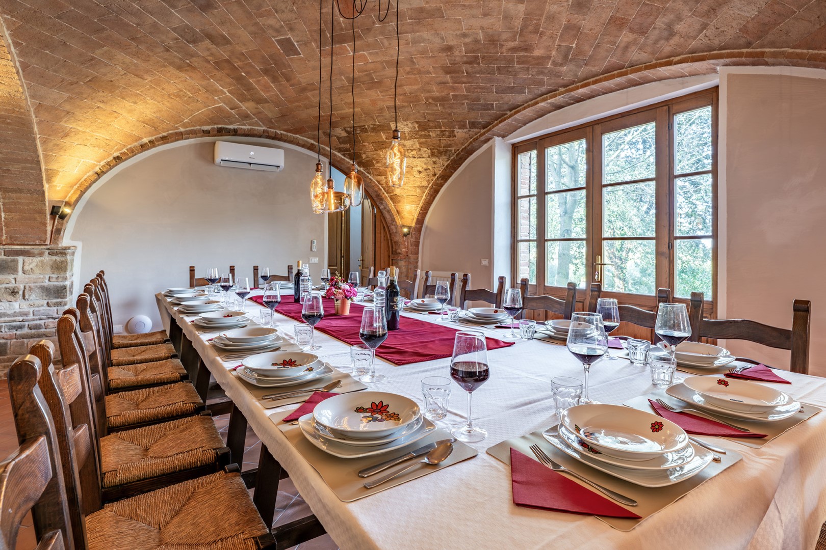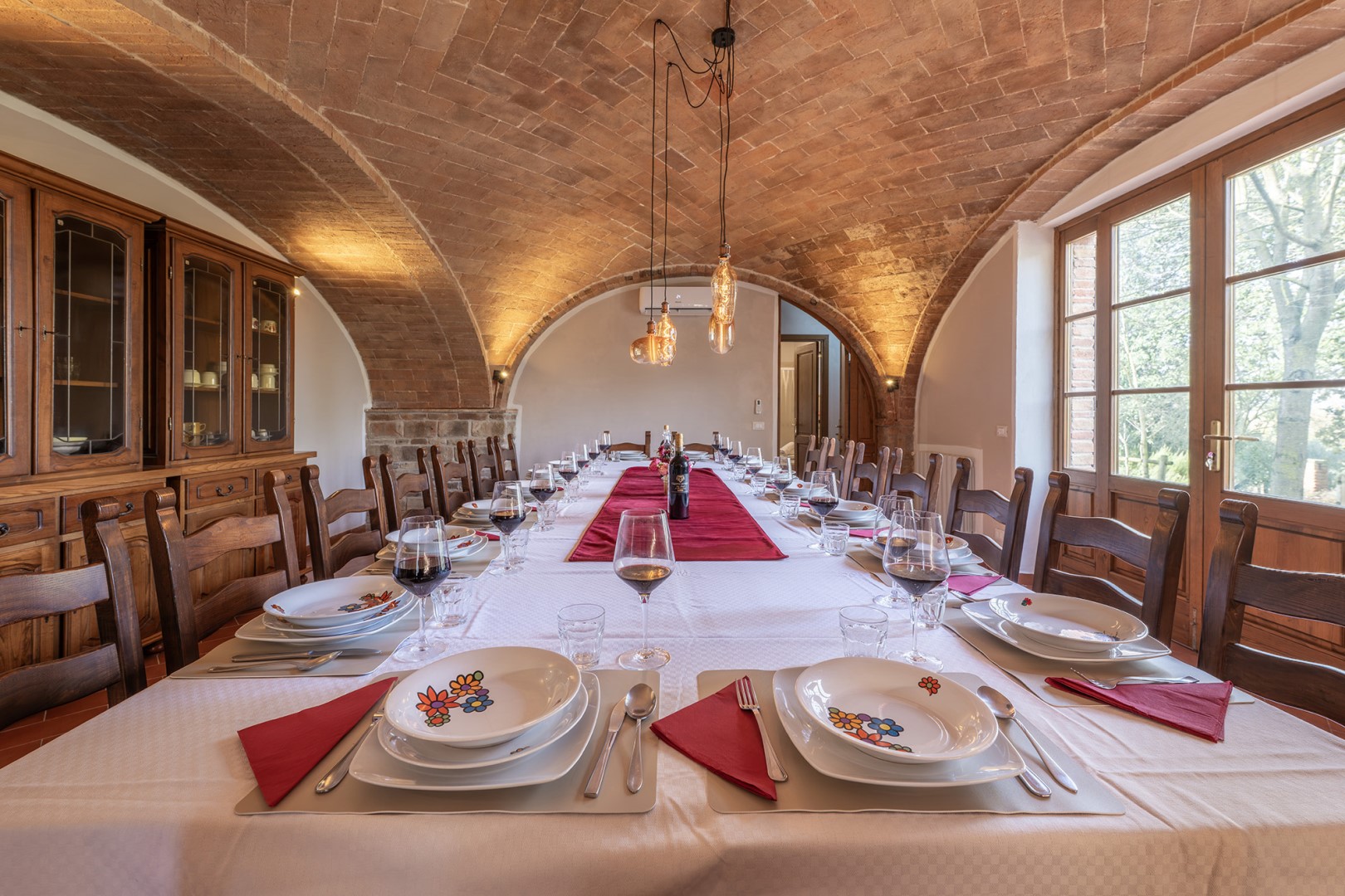 RECEPTIVE STRUCTURE. La Burraia is located in the heart of the Val di Chiana, just a few kilometres from the historic town of Montepulciano. It lies within a vast agricultural estate where some of the finest grapes are grown, the prestigious Rosso and the inimitable Nobile di Montepulciano, in a setting that combines relaxation, nature and culture, ideal for those who wish to experience Tuscany in all its authenticity. The result of the restoration of an original stone farmhouse, the property combines rusticity and comfort and can perfectly accommodate large groups, offering spacious indoor and outdoor common areas and nine bedrooms distributed between the main farmhouse and an adjacent annex. Upon request, guests can participate in tastings of wines produced in the vineyards of the property, guided through the eco-sustainable winery that combines traditional and innovative techniques, for an authentic experience of the wine culture of the area. The privileged location allows you to explore nearby historic towns such as Pienza and Cortona, the art cities of Tuscany and nearby Umbria and to enjoy rejuvenating breaks at the renowned spas in the area, including Montepulciano, Rapolano and Chianciano Terme.