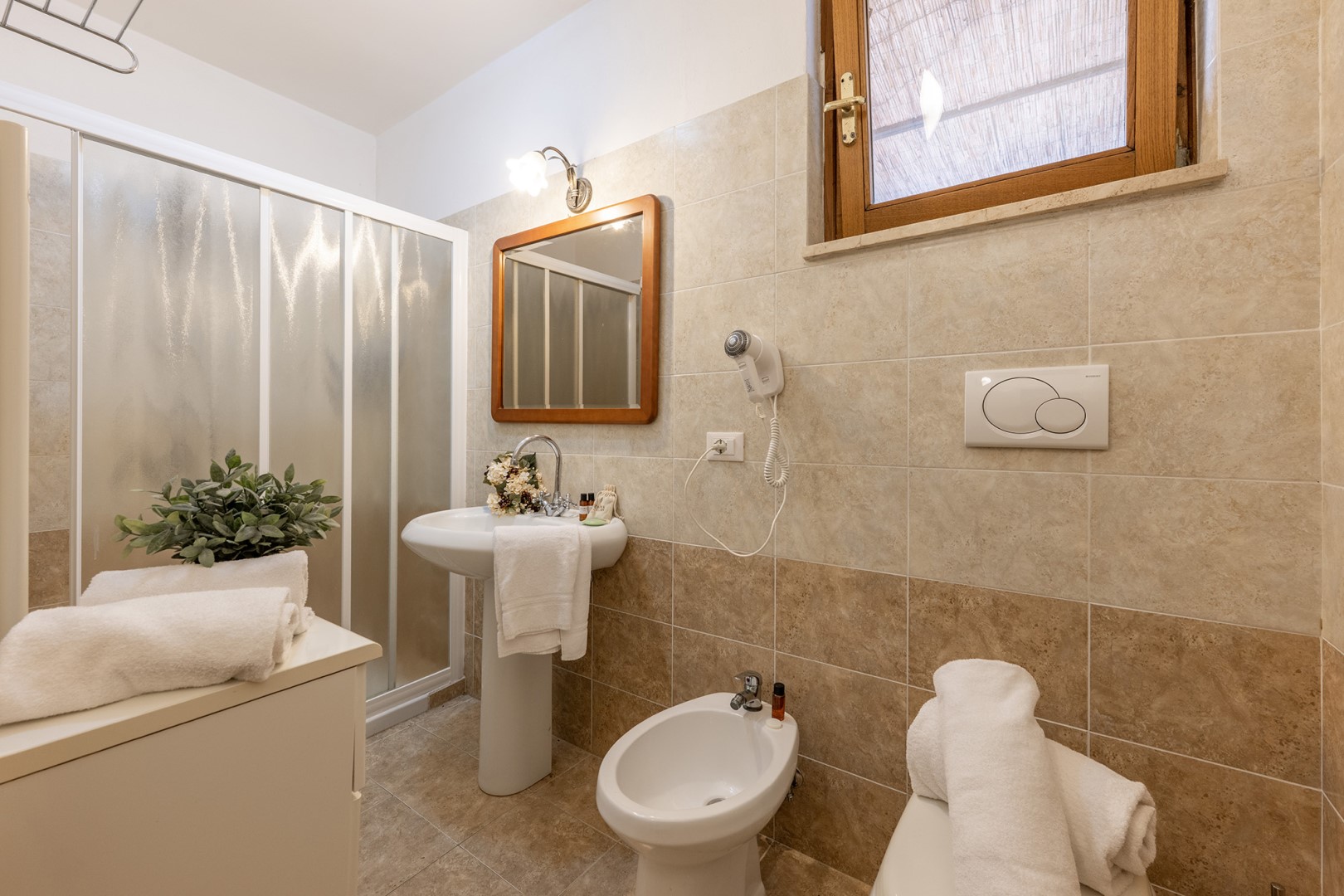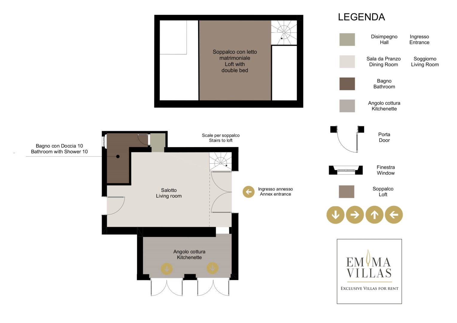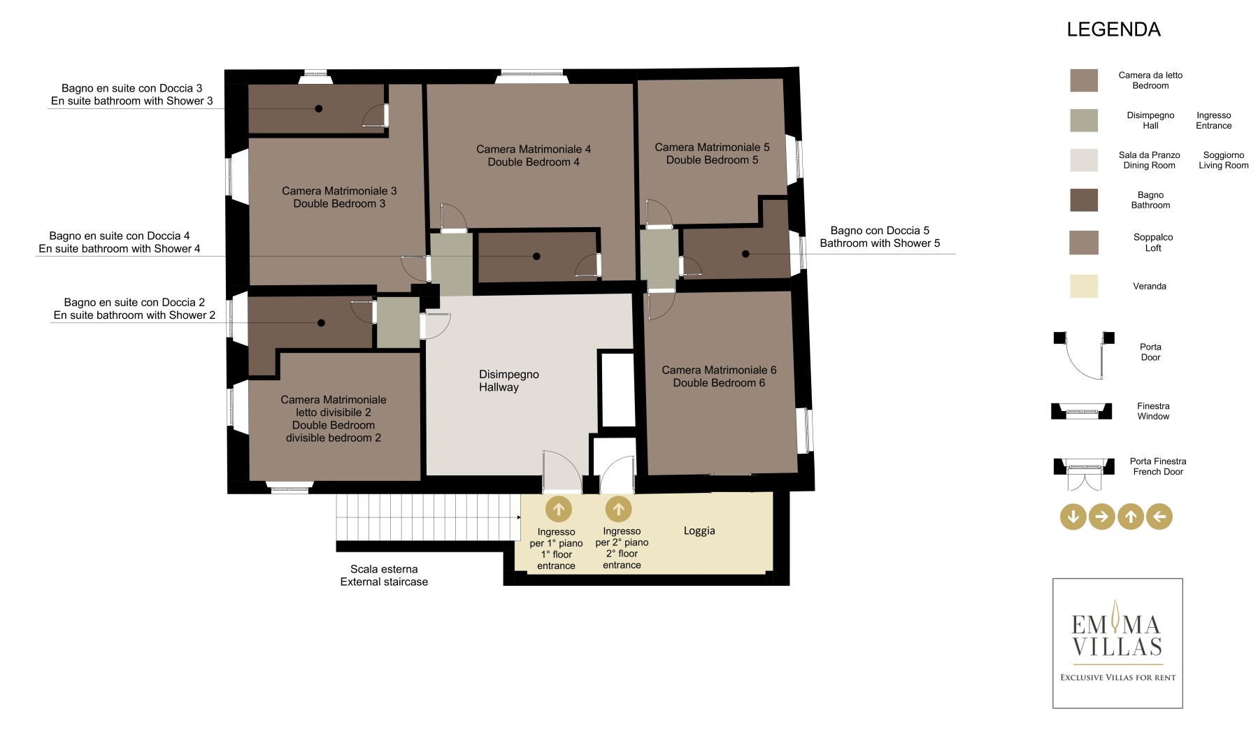 The complex consists of the main house and an adjacent annex. MAIN HOUSE (on three floors not internally connected) – GROUND FLOOR – Entrance hall leading to the sitting room with smart TV and reading corner; open-plan kitchen and dining area; two bathrooms with shower; double bedroom with ensuite bathroom with shower. FIRST FLOOR (accessed via an external staircase leading to the loggia) – Hallway leading to: three double bedrooms (one with divisible bed) with ensuite bathroom with shower, two double bedrooms and a bathroom with shower. SECOND FLOOR (accessed via a staircase on the first-floor loggia) – Sitting room; double bedroom with ensuite bathroom with tub (minimum height 1 m); double bedroom; bathroom with shower. ANNEX – Open-plan living area and double bedroom in the loft; kitchenette; bathroom with shower. The laundry area, two bathrooms and a shower serving the pool are located in an adjacent room.