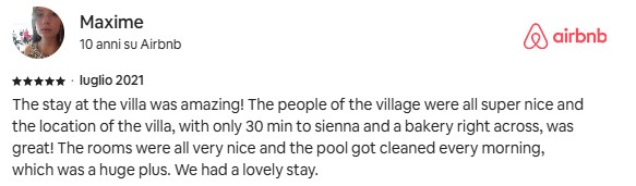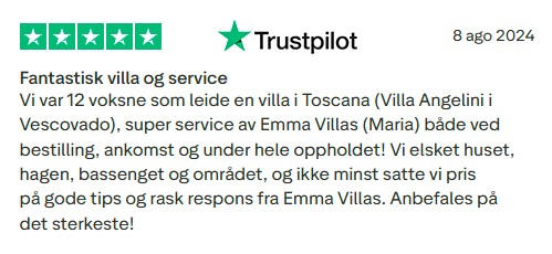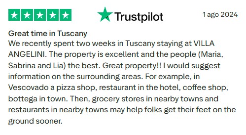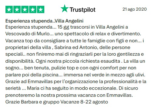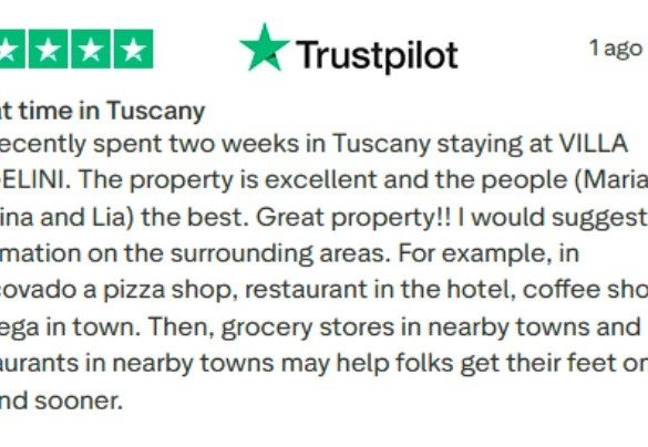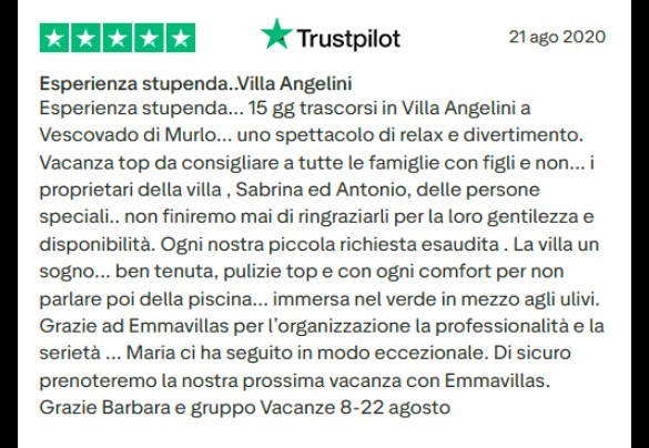 The quality of Emma Villas services is outstanding due to the efforts of your administrative staff--Francesca and Lucca. Also, Maria Perrotta did a wonderful job of caring for our comforts in Villa Angelini. She came over almost every day to make sure we had beach towels, that the electrician had fixed everything, anwered all our questions about the villa, the town of Murlo, recommened restaurants, etc. Her enthusiastic personality made everyone feel more comfortable and relaxed. You have a