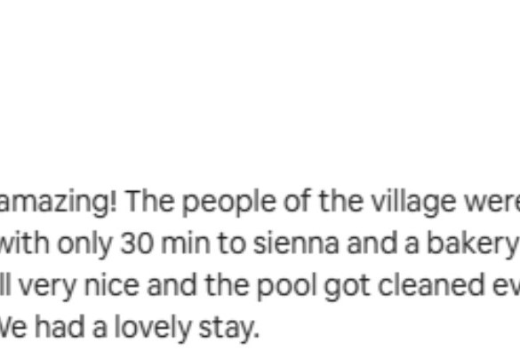The property is excellent and the people (Maria, Sabrina and Lia) the best. Great property!! I would suggest information on the surrounding areas. For example, in Vescovado a pizza shop, restaurant in the hotel, coffee shop, bottega in town. Then, grocery stores in nearby towns and restaurants in nearby towns may help folks get their feet on the ground sooner.