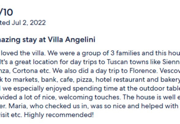 Your services were excellent throughout the process. We would especially like to acknowledge how important Maria our property manager was in making our experience so special and memorable. She is very efficient and does her job extremely well, but more importantly she made us feel comfortable and at home from the moment we arrived. We all know that she made the difference in our experience and our stay at Villa Angelini was the highlight of a three week vacation. Rest assured, Emma Villas wi