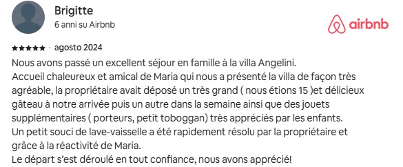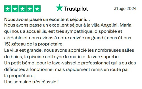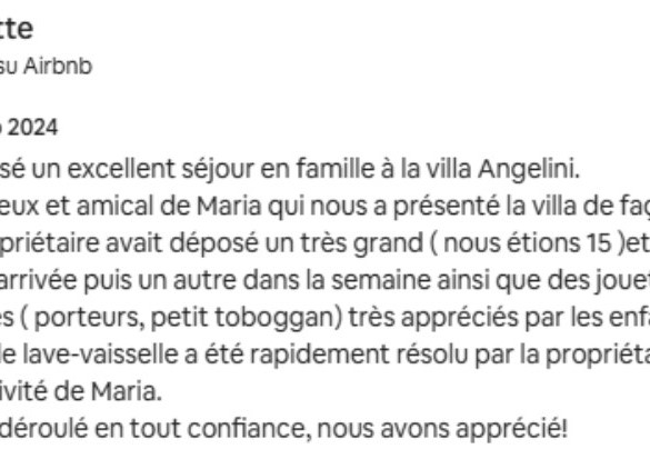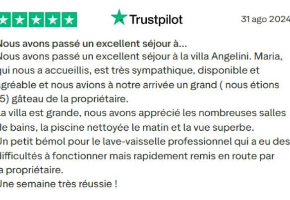 E stata una meravigliosa vacanza. Villa Angelini 14 é tale e come l'avete descritta.E siamo stati molto felici. La proprietaria è una signora molto gentile e cordiale. Il nostro suggerimento è di continuare cosí.