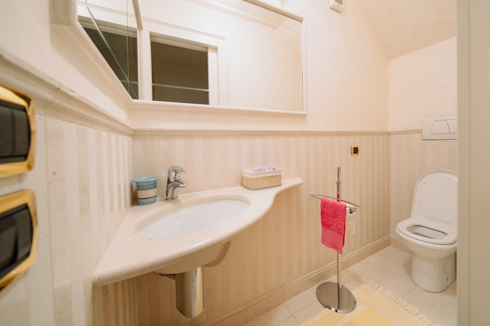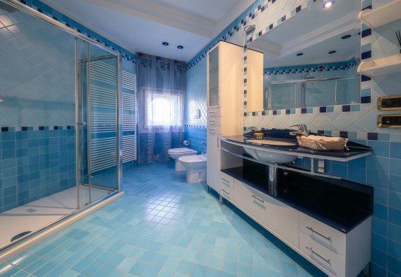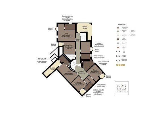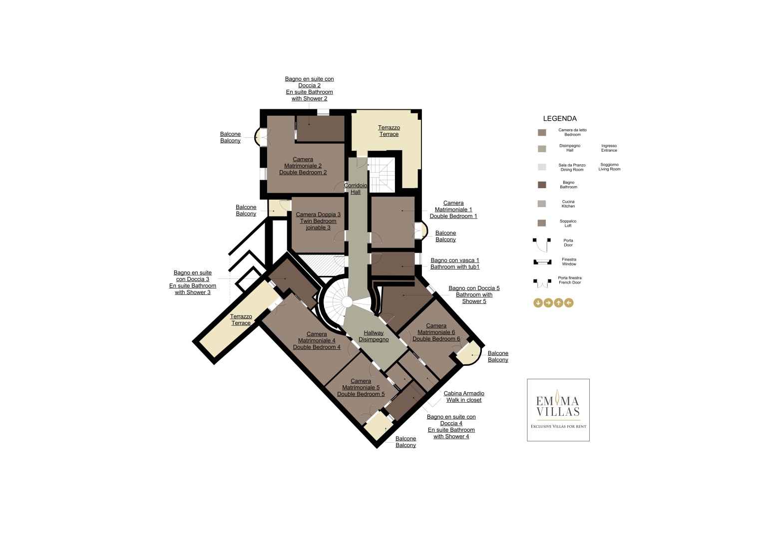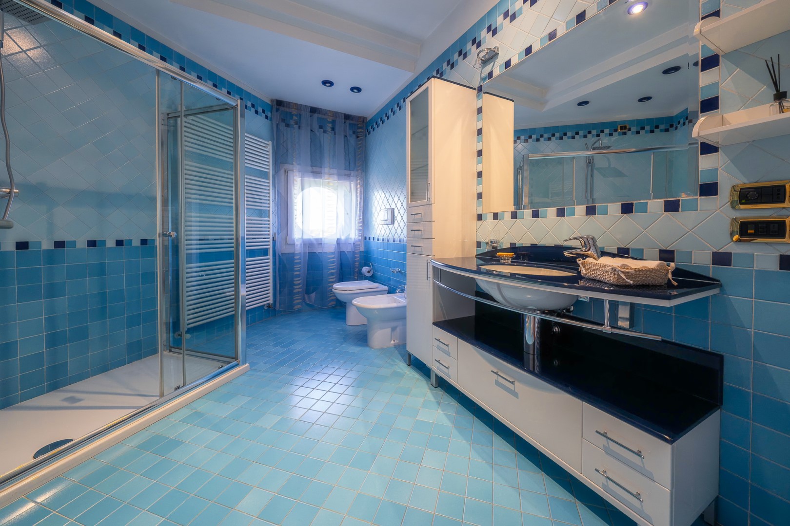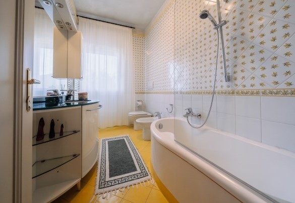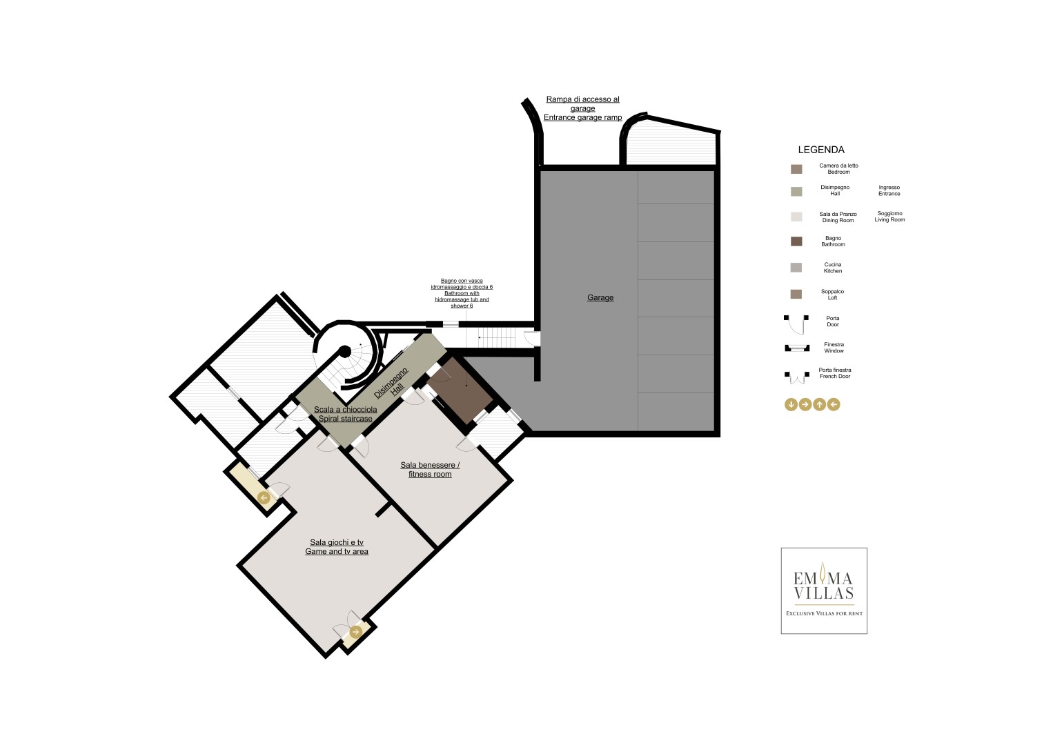 The villa has three floors, connected by internal staircases. RAISED GROUND FLOOR – Main entrance via the external staircase; hallway; large living room with TV area and decorative fireplace; kitchen with central island; veranda overlooking the pool with dining area, TV and decorative fireplace; guest bathroom; storage room. A few steps lead down to: kitchen, laundry room, study and guest bathroom. LOWER GROUND FLOOR - Games room with table tennis, billiards and cinema corner; wellness room with steam bath and Finnish sauna (on request at an extra cost), gym equipment and relaxation area; bathroom with whirlpool tub and shower; garage (accessed via internal stairs). FIRST FLOOR - Three double bedrooms with ensuite bathroom with shower; twin bedroom; two double bedrooms, one with queen size bed; bathroom with tub; bathroom with shower; two panoramic terraces.