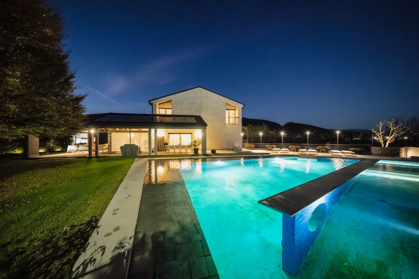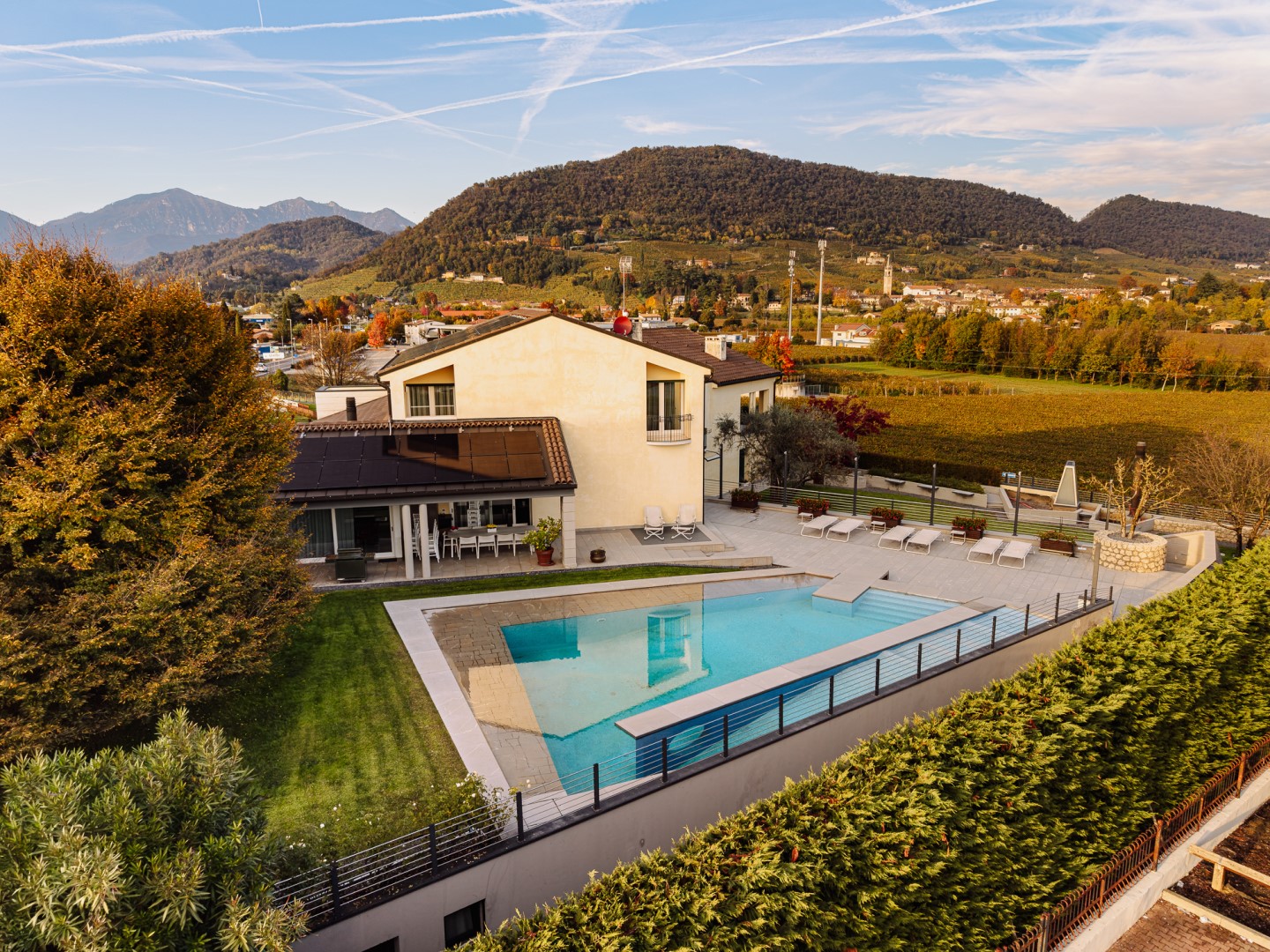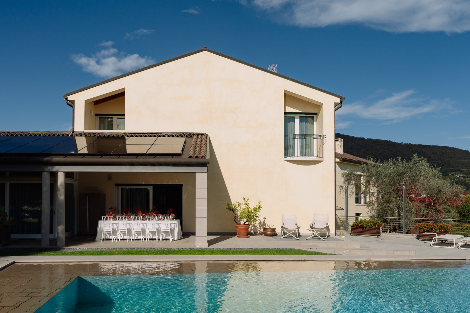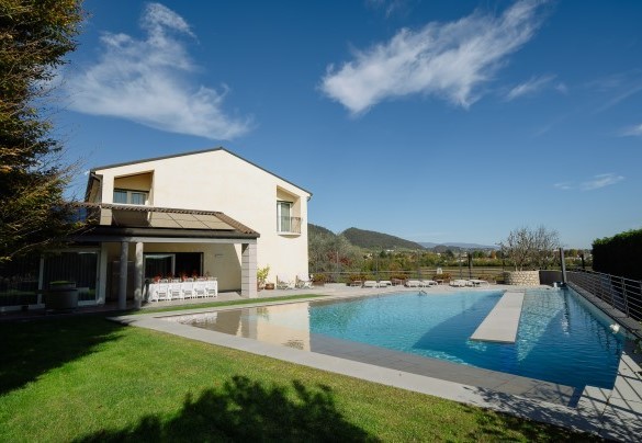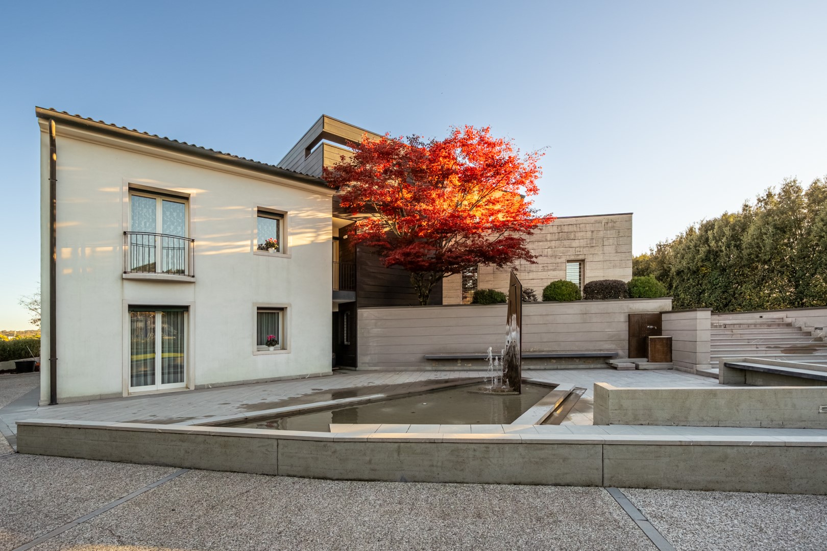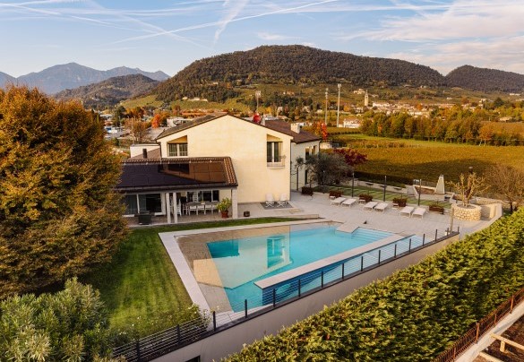 PRIVATE STRUCTURE (lease only). Dimora delle Stelle is located in Farra di Soligo, in the province of Treviso. Nestled in the heart of the Prosecco hills, a UNESCO World Heritage site, the villa offers spacious and refined areas, ideal for large families and groups. The interiors are distinguished by high-quality materials: Venetian terrazzo floors and Italian walnut parquet, a spectacular staircase in white Verona marble, handcrafted furnishings and a modern photovoltaic system that guarantees sustainability and comfort. The villa has six bedrooms, a wellness area dedicated to relaxation and a games room with a 100-inch maxi screen for entertainment. Outside, a spectacular garden, the fruit of Italian architectural ingenuity, welcomes guests with fountains and refined decorative elements in Corten steel.