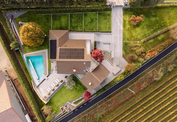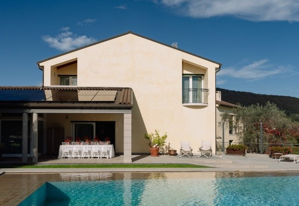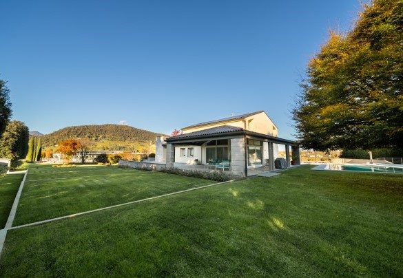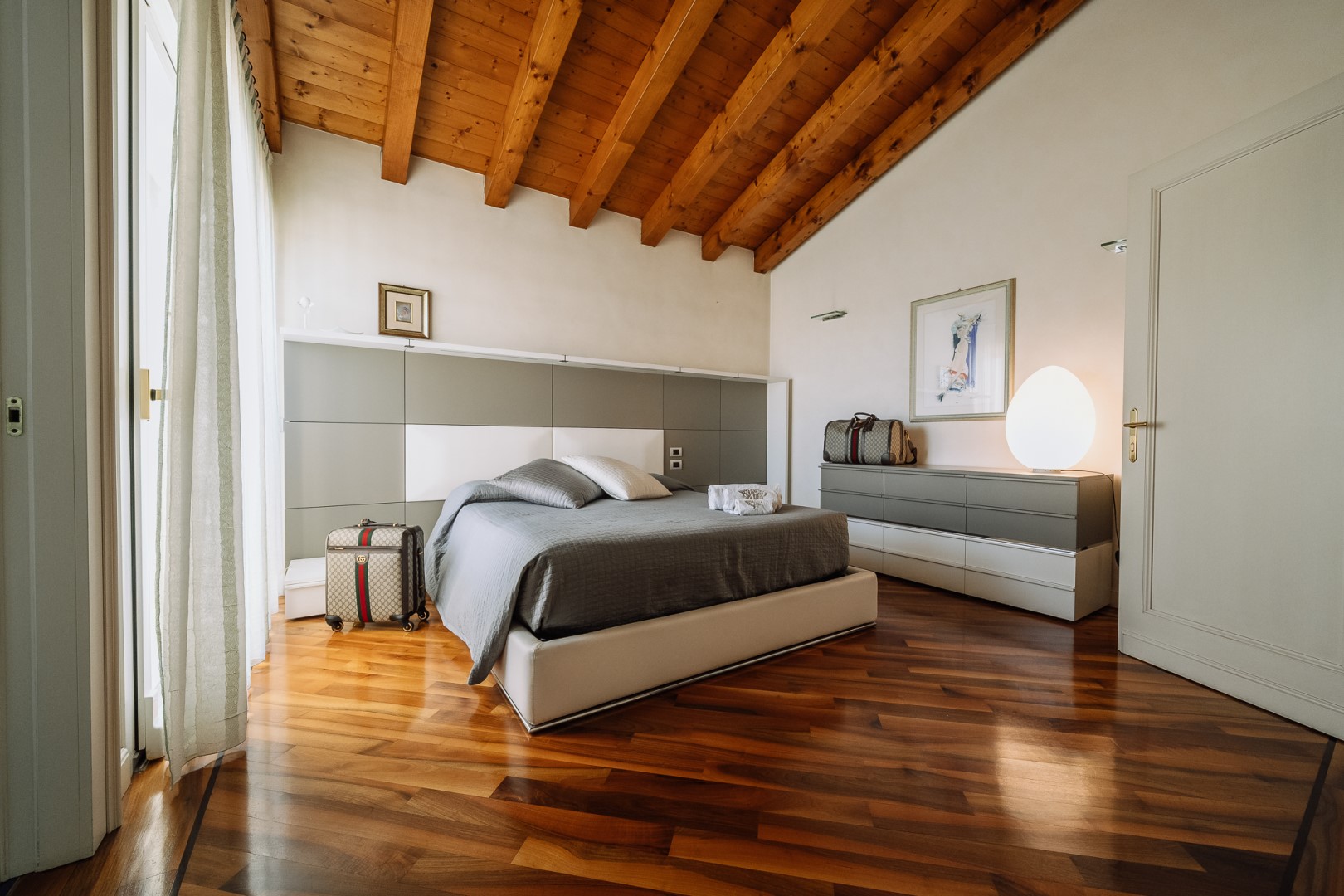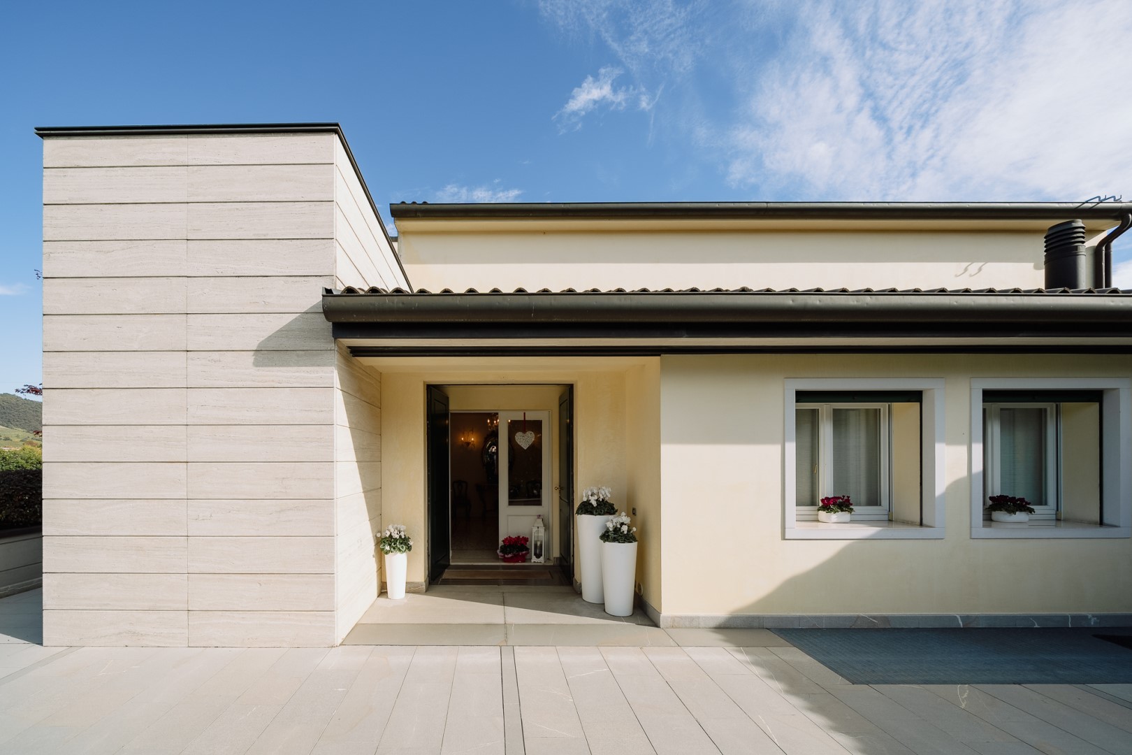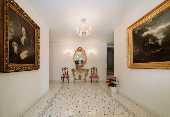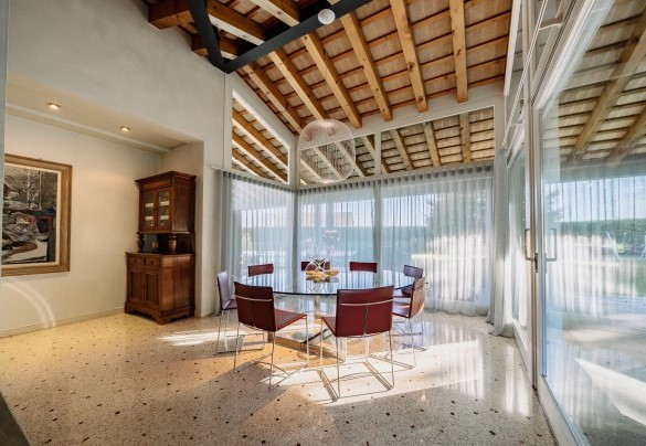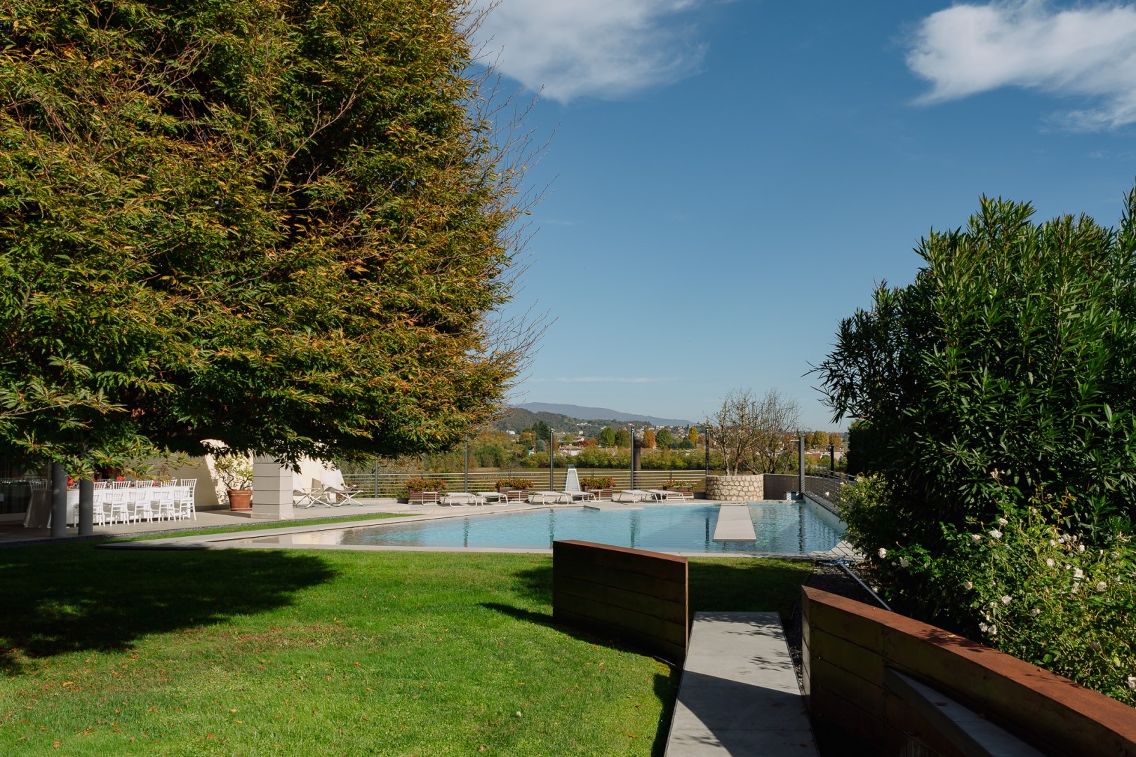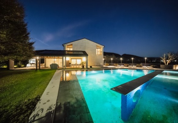 PRIVATE STRUCTURE (lease only). Dimora delle Stelle is located in Farra di Soligo, in the province of Treviso. Nestled in the heart of the Prosecco hills, a UNESCO World Heritage site, the villa offers spacious and refined areas, ideal for large families and groups. The interiors are distinguished by high-quality materials: Venetian terrazzo floors and Italian walnut parquet, a spectacular staircase in white Verona marble, handcrafted furnishings and a modern photovoltaic system that guarantees sustainability and comfort. The villa has six bedrooms, a wellness area dedicated to relaxation and a games room with a 100-inch maxi screen for entertainment. Outside, a spectacular garden, the fruit of Italian architectural ingenuity, welcomes guests with fountains and refined decorative elements in Corten steel.