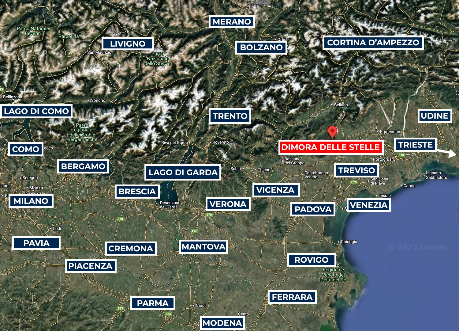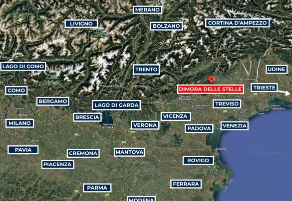 Dimora delle Stelle is located among the hills of Conegliano and Valdobbiadene, a UNESCO World Heritage site, and is the ideal place to enjoy a stay immersed in nature, culture and food and wine. Here, the landscape of the Prosecco vineyards is accompanied by unique experiences: tastings in historic cellars, visits to the famous Conegliano Wine Exhibition and numerous food and wine events celebrating the authentic flavours of the area. The location is strategic for excursions and out-of-town trips: the elegant city of Treviso, famous for its canals, medieval walls and typical Venetian cuisine, is about 30 minutes away by car while splendid Venice, unique in the world, is just over an hour away by car, as is Cortina d'Ampezzo, queen of the Dolomites.