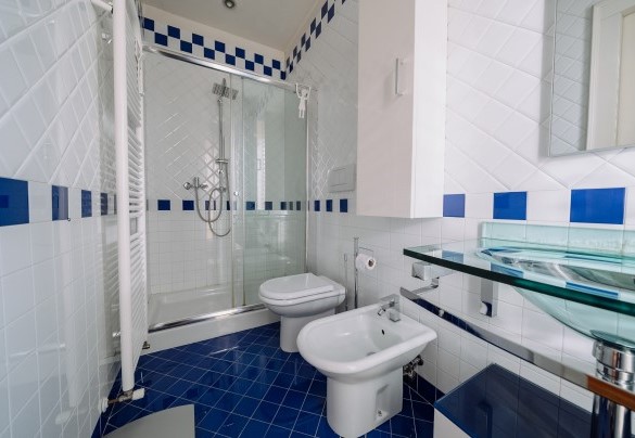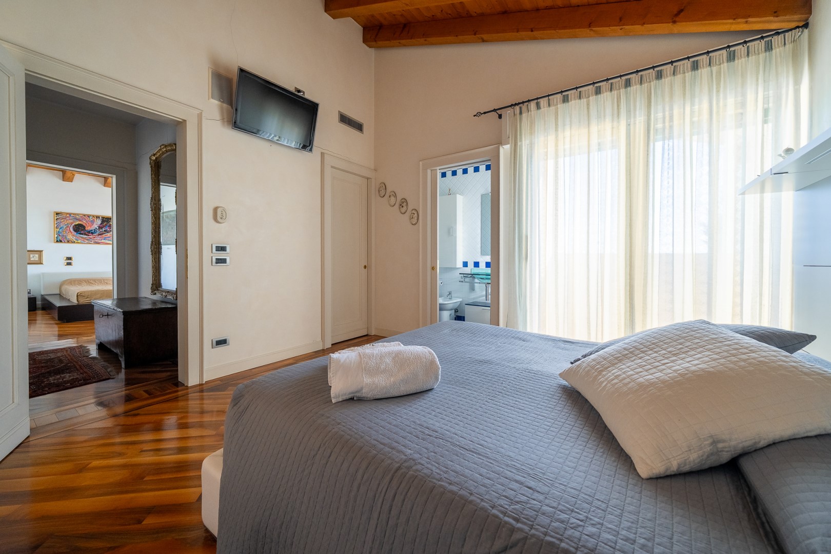 The swimming pool is located on the same level as the main entrance and can be reached by exiting the living room windows and the veranda, just a few metres away. Irregularly-shaped, it has a surface area of 140 sq m, with the depth varying from 20 cm at the beach entrance to 1.30 m. The 10 sq m children's pool, 40 cm deep, is lined in dark grey porcelain stoneware and equipped with non-slip steps for entry. It has LED lighting inside the pool and externally in the solarium area and is purified with a salt system. There is an outdoor shower with hot water. The paved sunbathing area is equipped with sunbeds and umbrellas. Open from the last Saturday in April to the first Saturday in October.