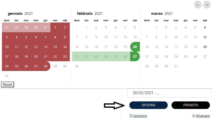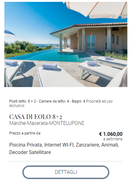 1) SCELTA PROPRIETA' E CALENDARIO AGGIORNATO: Una volta visualizzata la proprietà che si intende prenotare, cliccare sul pulsante "Dettagli" (Fig.1). Da qui verrete inviati alla pagina riservata alla proprietà, dove troverete il calendario delle disponibilità. E' sufficiente cliccare su un qualsiasi giorno della settimana scelta. Immediatamente, sul calendario, vi apparirà evidenziato il periodo di vostro interesse (Fig.2a). Le date vengono caricate in automatico da sabato a sabato (il caricamento può richiedere qualche secondo).