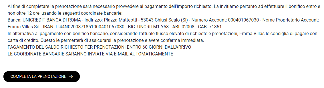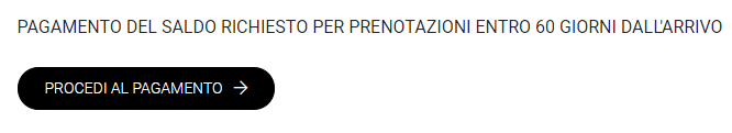 PRENOTAZIONI REALIZZATE A MENO DI 60 GG DALL'INIZIO DEL SOGGIORNO: In questo caso i clienti dovranno procedere al pagamento in un'unica soluzione dell'intero importo dell'affitto al momento della prenotazione. Le modalità di pagamento da rispettare sono le stesse adottate nella normale procedura di prenotazione.