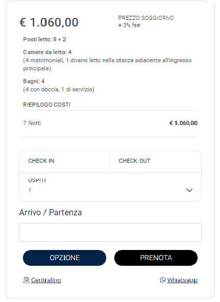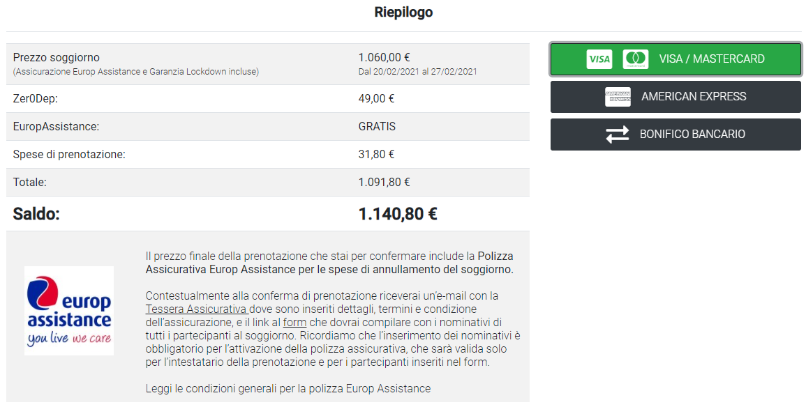 4) RIEPILOGO PREZZI E PAGAMENTO: Una volta compilati i dettagli trovate la sezione dedicata al pagamento dove potrete scegliere come effettuare il pagamento dell'acconto (Fig.7). Vi consigliamo l'uso della carta di credito essendo questa una modalità di prenotazione che implica il blocco immediato della proprietà a nome vostro.