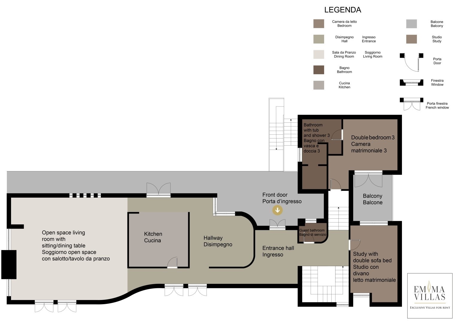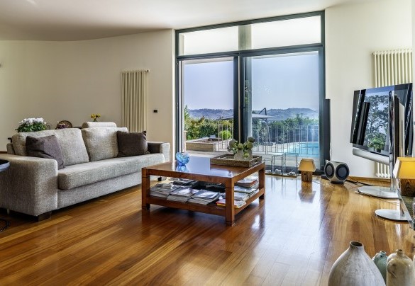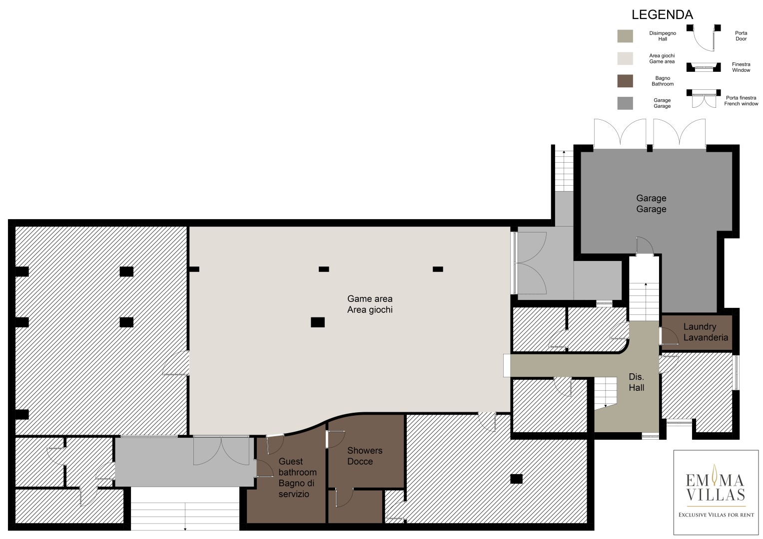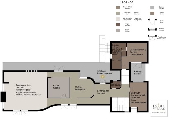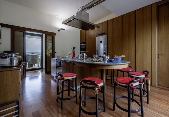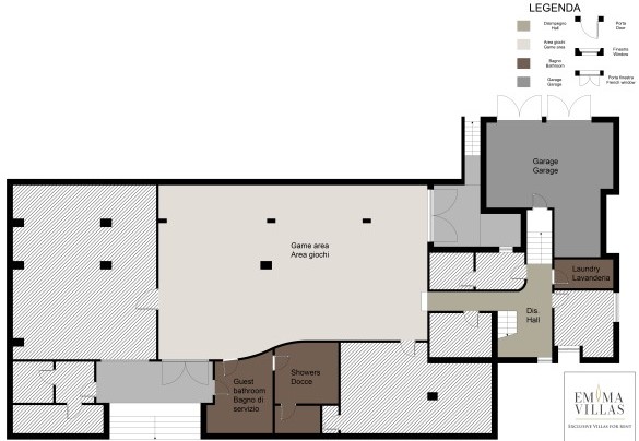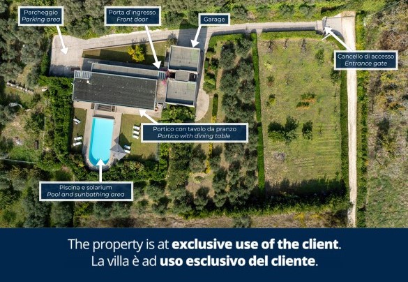 La villa, di circa 700 mq, si sviluppa su tre livelli principali, intervallati da piani intermedi e collegati da scala interna. PIANO TERRA – Zona giorno con corridoio aperto fiancheggiato da finestre che conduce all'ampio soggiorno con salotto e tavolo da pranzo, con accesso diretto al giardino e alla zona pranzo esterna; cucina con accesso diretto all’esterno; bagno di servizio; stanza studio con divano letto matrimoniale (largo 1.40m) per due posti letto aggiuntivi; alcuni gradini (in numero di 7) conducono ad una camera matrimoniale con bagno en-suite con vasca e doccia ed accesso diretto ad un piccolo balconcino. PRIMO PIANO – Camera matrimoniale; bagno con doccia; accesso alla terrazza panoramica; camera matrimoniale con bagno en-suite con vasca. PIANO SEMINTERRATO – Ampia sala ricreativa con biblioteca privata, tavolo da ping pong, giochi e uscite verso il giardino e la piscina; bagno di servizio e due docce; stanza lavanderia con lavatrice ed asciugatrice; garage.