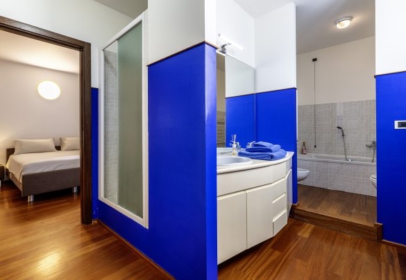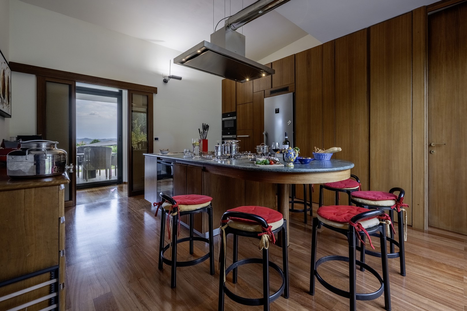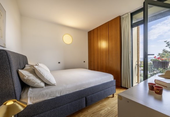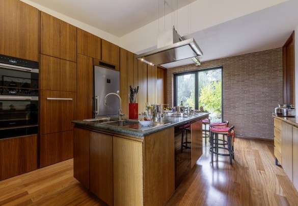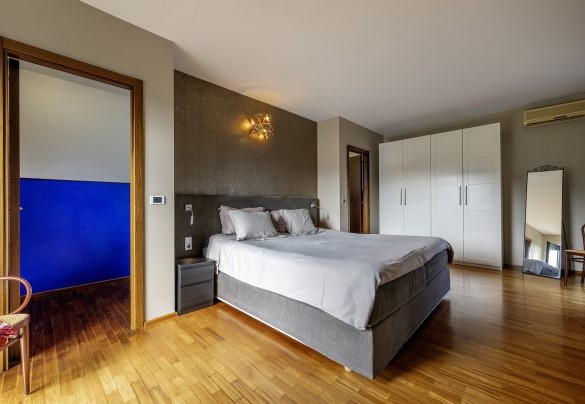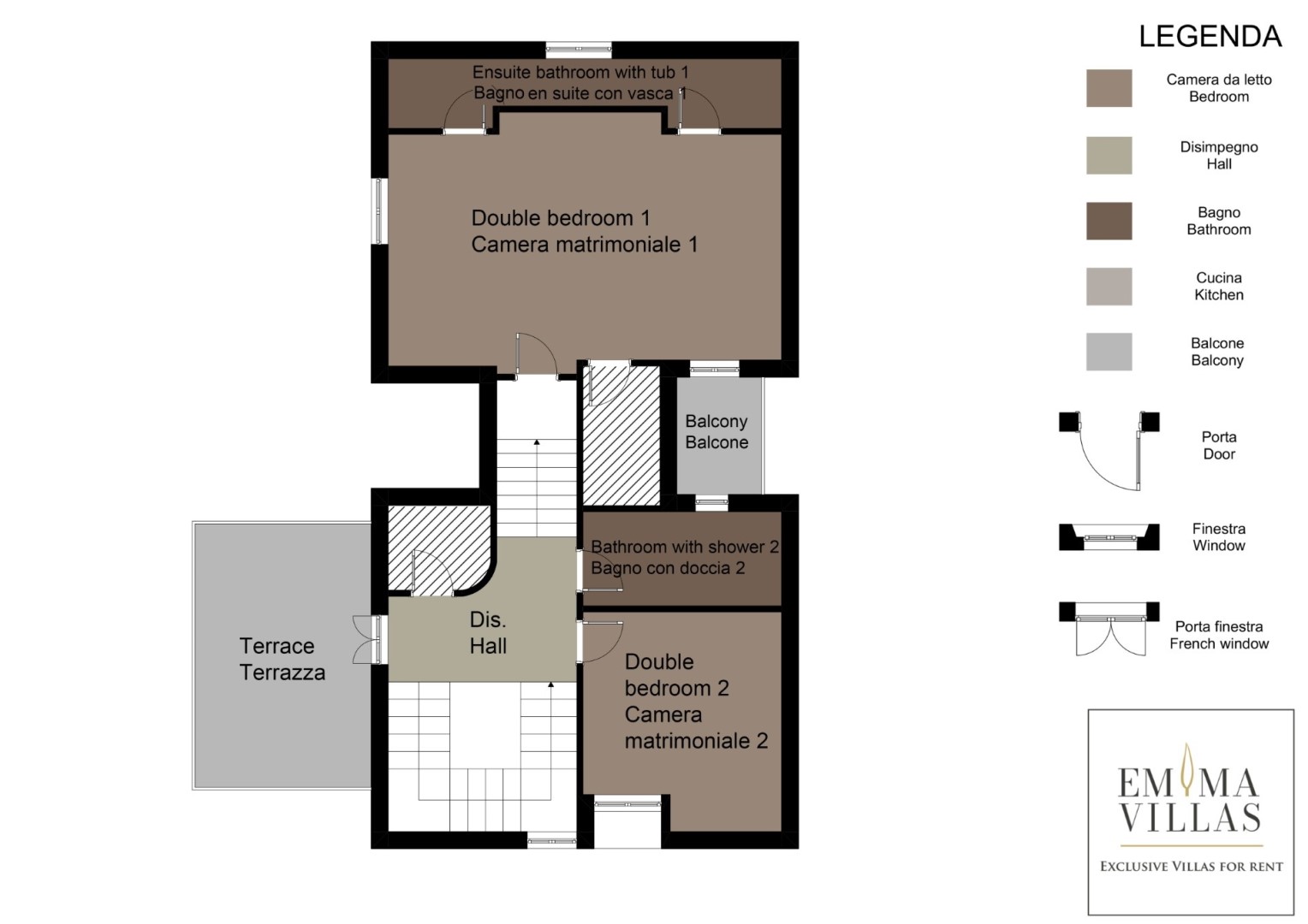 La villa, di circa 700 mq, si sviluppa su tre livelli principali, intervallati da piani intermedi e collegati da scala interna. PIANO TERRA – Zona giorno con corridoio aperto fiancheggiato da finestre che conduce all'ampio soggiorno con salotto e tavolo da pranzo, con accesso diretto al giardino e alla zona pranzo esterna; cucina con accesso diretto all’esterno; bagno di servizio; stanza studio con divano letto matrimoniale (largo 1.40m) per due posti letto aggiuntivi; alcuni gradini (in numero di 7) conducono ad una camera matrimoniale con bagno en-suite con vasca e doccia ed accesso diretto ad un piccolo balconcino. PRIMO PIANO – Camera matrimoniale; bagno con doccia; accesso alla terrazza panoramica; camera matrimoniale con bagno en-suite con vasca. PIANO SEMINTERRATO – Ampia sala ricreativa con biblioteca privata, tavolo da ping pong, giochi e uscite verso il giardino e la piscina; bagno di servizio e due docce; stanza lavanderia con lavatrice ed asciugatrice; garage.