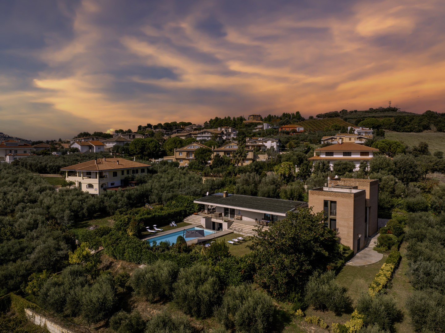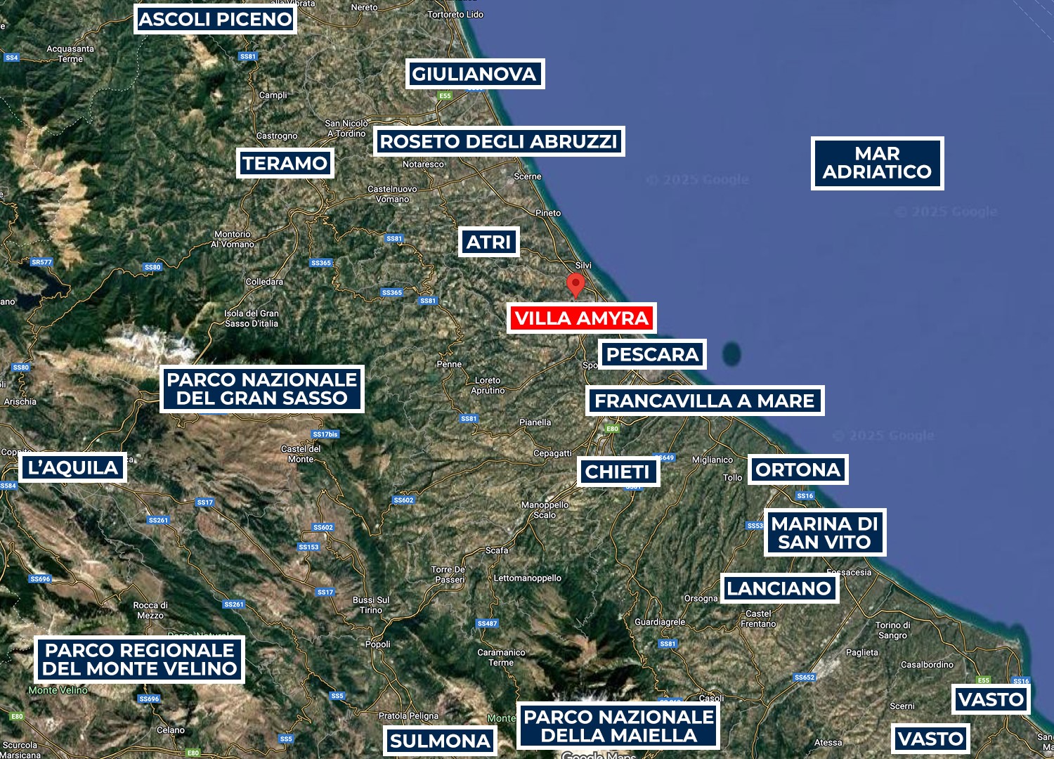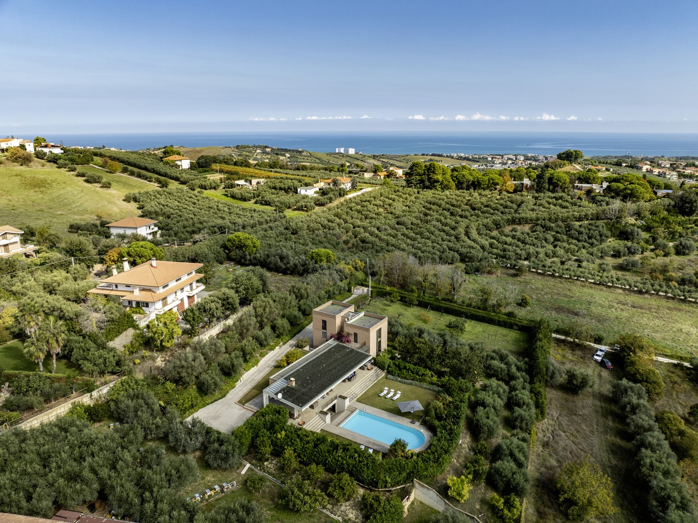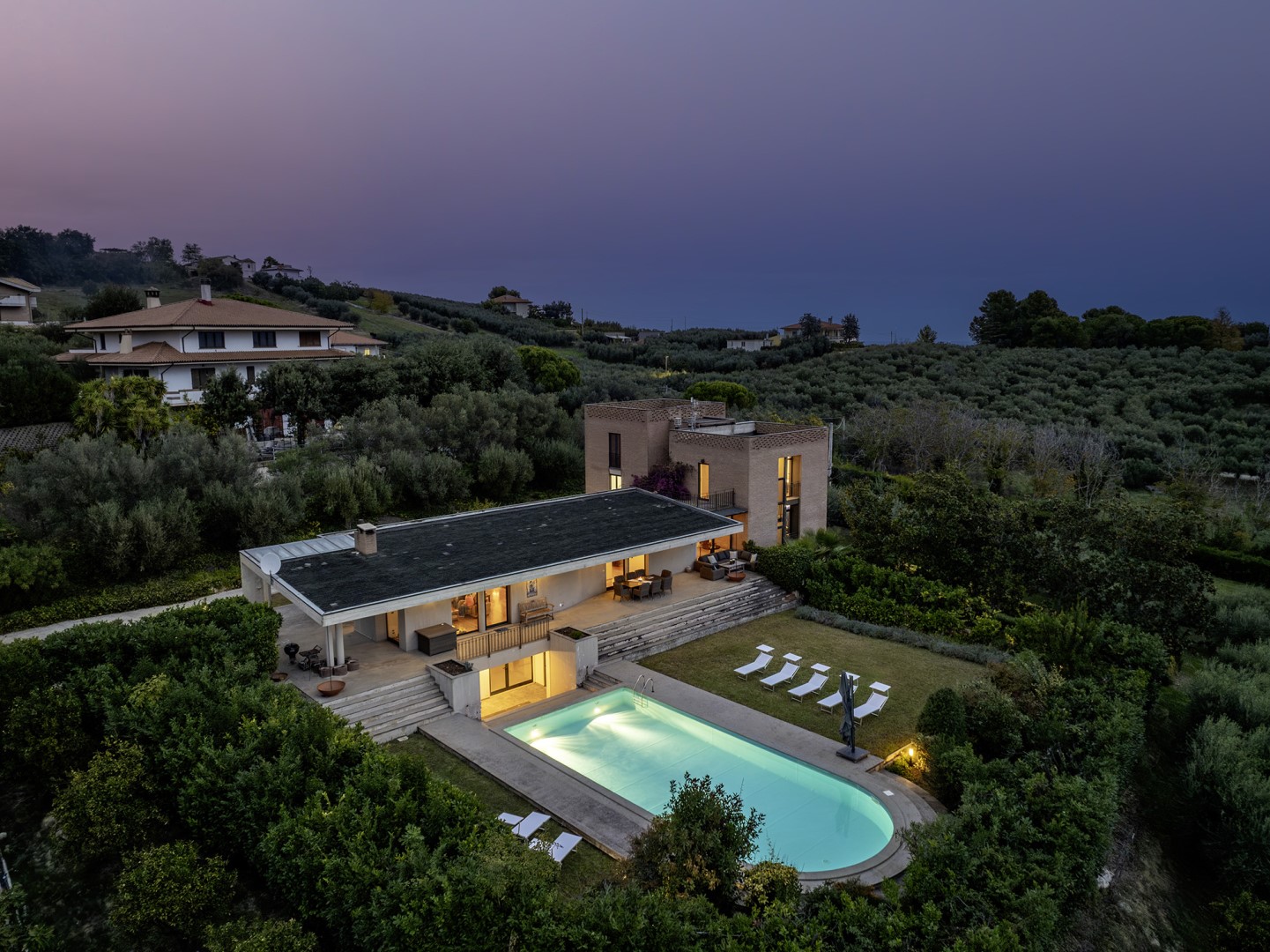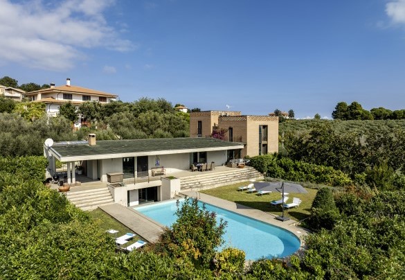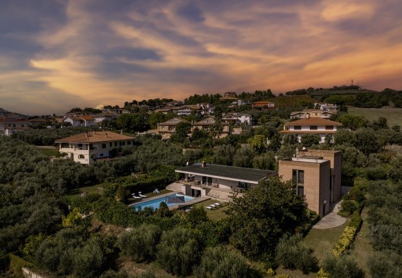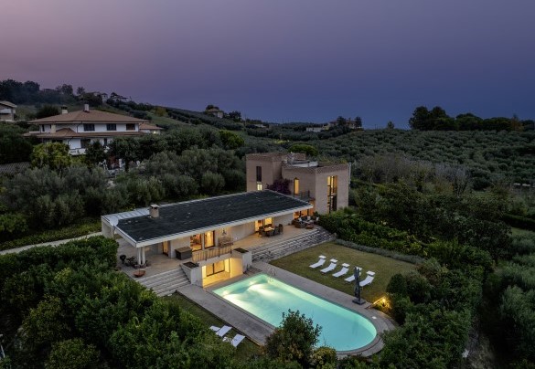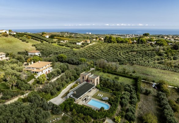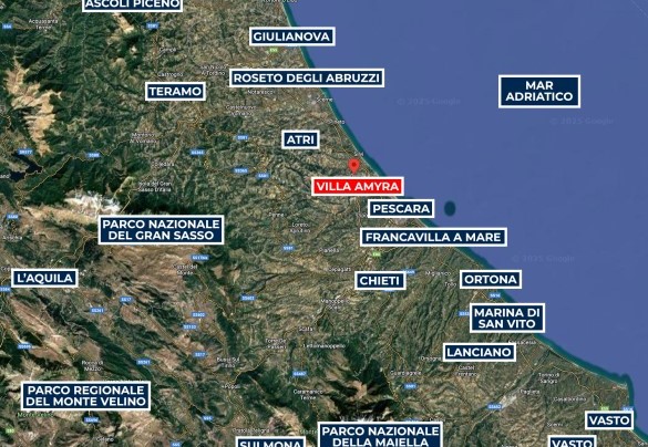 STRUTTURA PRIVATA (solo locazione). Villa Amyra si trova nella quiete della campagna residenziale di Città Sant’Angelo, offrendo un rifugio di pace e comfort moderni. La villa si distingue per il suo design contemporaneo, con volumi a blocchi che definiscono gli spazi interni e creano equilibrio tra funzionalità ed estetica. Gli ambienti sono ampi e luminosi, con grandi vetrate che valorizzano la luce naturale e la vista sul paesaggio. La distribuzione su più livelli sfalsati conferisce movimento e personalità alla casa. Tra piano terra e primo piano si trovano tre camere matrimoniali con bagno privato e uno studio con divano letto. Il piano seminterrato è dedicato al tempo libero, con un’area giochi attrezzata. All’esterno, il giardino ospita la splendida piscina a sale e un portico attrezzato. Situata su una dolce collina, Villa Amyra gode di una posizione privilegiata tra mare e montagna, con vista mozzafiato sulla costa adriatica e sul massiccio della Maiella, punto di partenza ideale per vivere il mare dell’Abruzzo e scoprire i paesaggi del Parco Nazionale della Maiella.