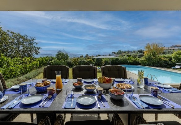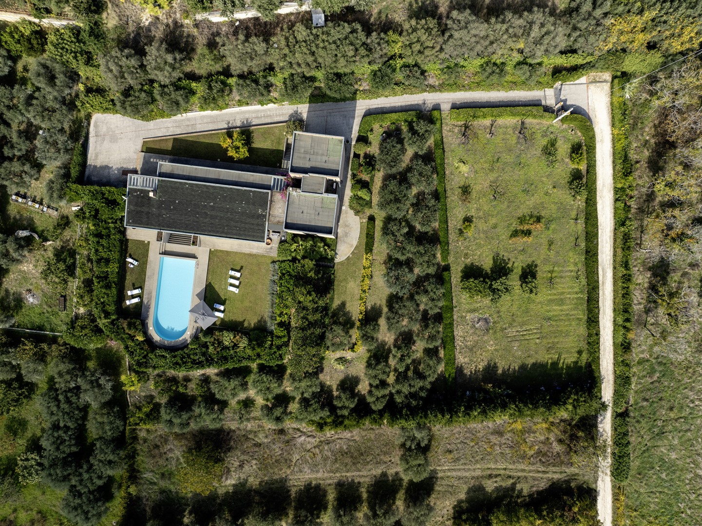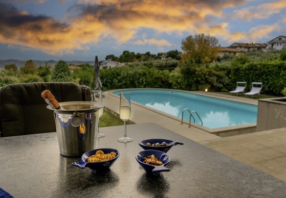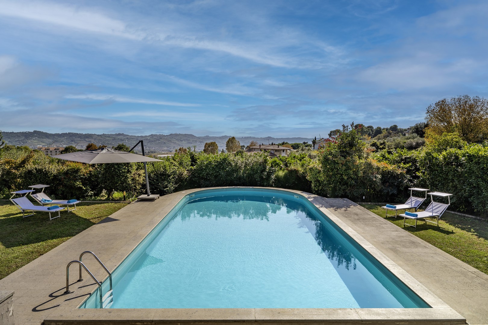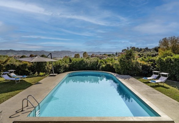 La piscina si trova ad un livello leggermente inferiore rispetto alla casa, raggiungibile tramite scalinata dalla terrazza (6 gradini). Di forma rettangolare con un'estremità arrotondata, misura 13,6 x 6 m con profondità costante di 1,70 m ed è accessibile tramite scaletta metallica, rivestita in PVC e dotata di impianto di depurazione a cristalli di sale. Il solarium in cemento e prato che la circonda è arredato con lettini ed ombrellone. Aperta dall’ultimo sabato di aprile al primo sabato di ottobre.