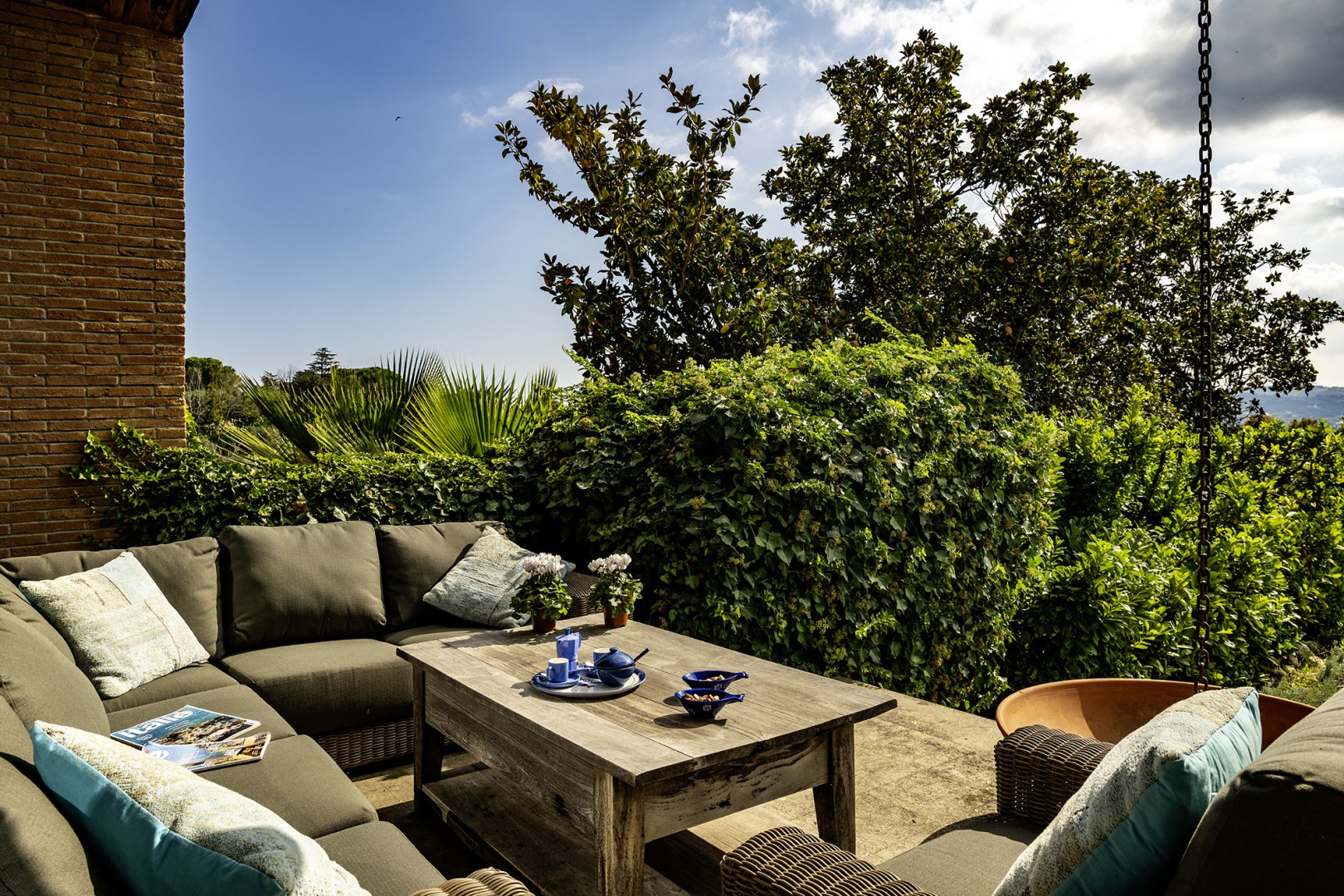 La villa è immersa in un parco di circa 8000 mq, parzialmente recintato dove spiccano ulivi ed alberi da frutta. Il portico che si sviluppa sul retro è attrezzato con area salotto e tavolo da pranzo; nelle vicinanze si trovano un barbecue portatile ed una griglia tradizionale per arrosticini. Alla fine del viale d’ingresso della proprietà si trova un’area parcheggio per tre posti auto scoperti. A disposizione anche un garage per due posti auto coperti (discesa garage non adatta ad auto sportive).