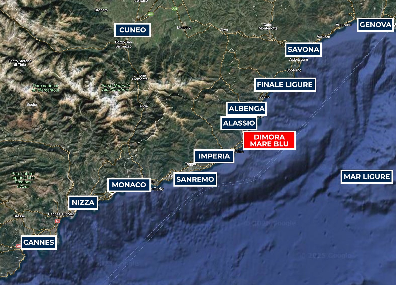 Dimora Mareblu si trova nel pieno centro di Alassio, a pochi passi dal Muretto e dal Budello, il caratteristico carruggio ricco di negozi, botteghe, bar e ristoranti. La passeggiata sul mare da Alassio a Laigueglia è perfetta per grandi e piccini, mentre i dintorni offrono innumerevoli occasioni per escursioni naturalistiche e culturali, come il Parco Regionale del Beigua, il Monte Bignone per gli appassionati di trekking, e il borgo medievale di Cervo, ricco di fascino e storia. La proprietà dista circa 15 km dal casello autostradale di Albenga. Nelle vicinanze si trovano Imperia, a circa 27 km passando per Andora, i borghi storici di Finale Ligure e Borgio Verezzi, con le suggestive grotte di Toirano e Borgio Verezzi, e Genova, a 100 km, dove si trova l’acquario più grande d’Europa. Percorrendo la panoramica Via Aurelia, da Varigotti a Bergeggi, si potranno ammirare scenari mozzafiato sulla costa e sul mare.
