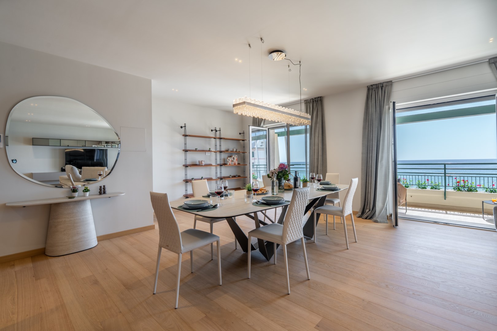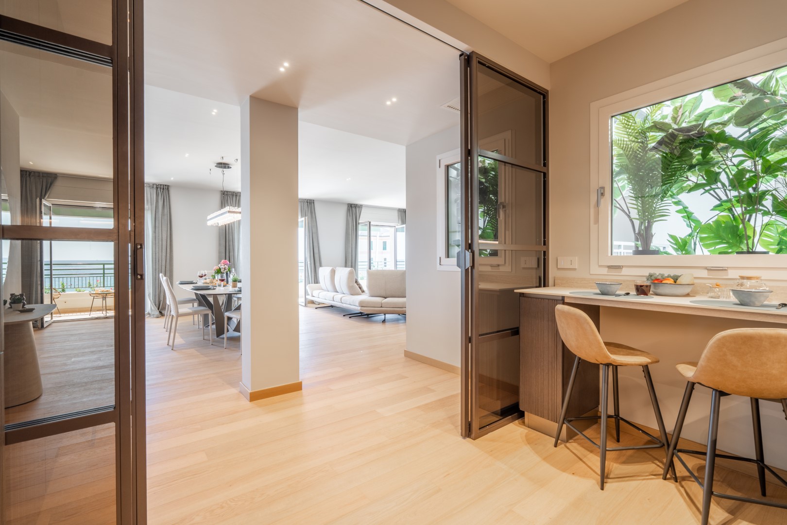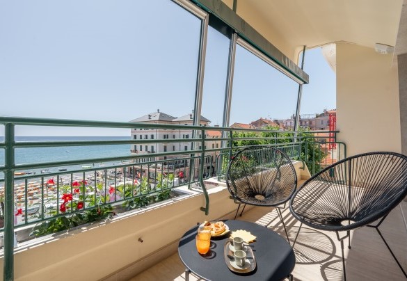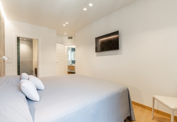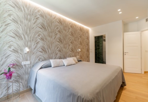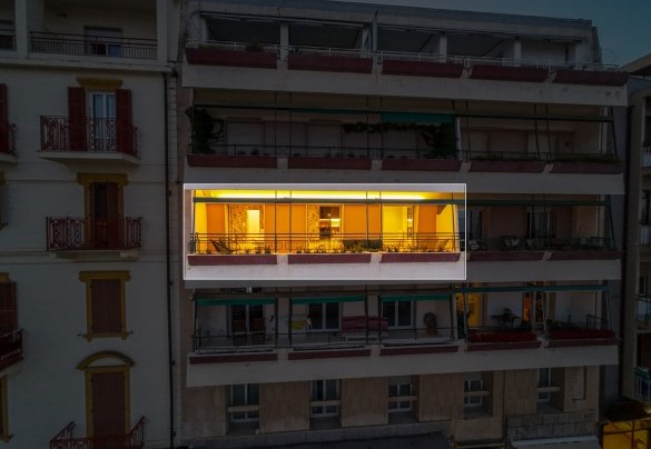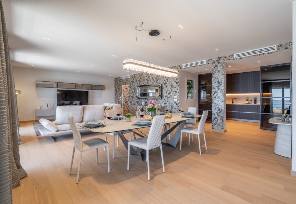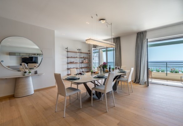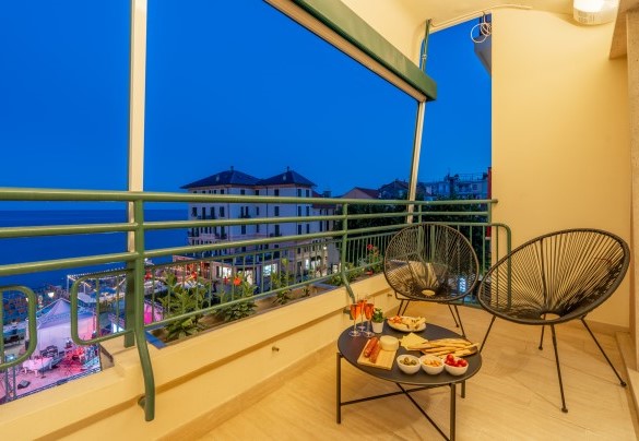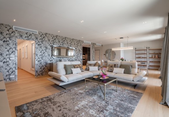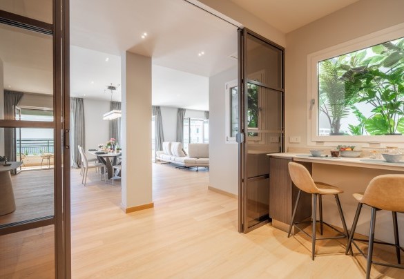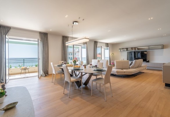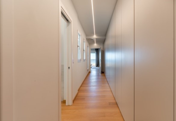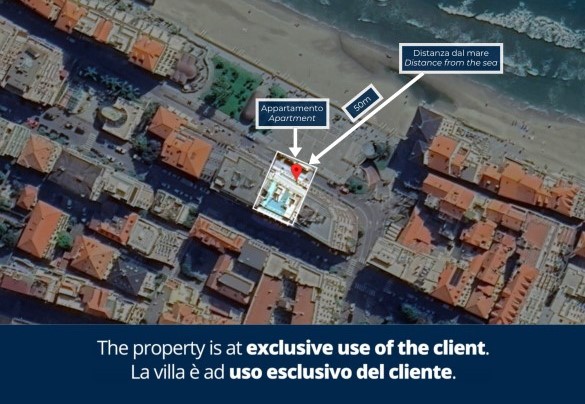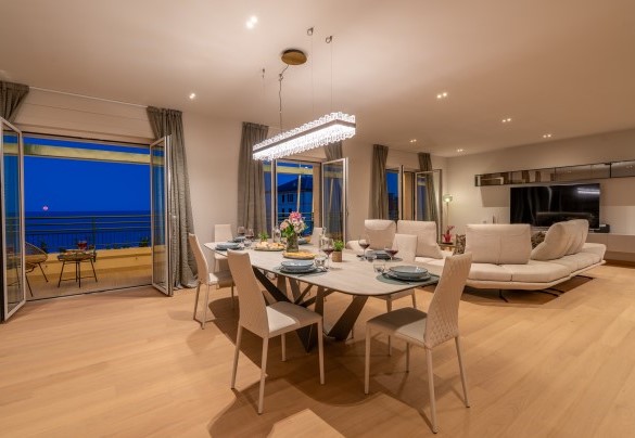 L’appartamento si trova al terzo piano di un elegante stabile, comodamente raggiungibile con ascensore dopo una breve rampa di otto gradini. Disposto su un unico livello, presenta un ingresso che conduce a un ampio open space con cucina a vista, zona pranzo e zona living, entrambi con affaccio e accesso diretto alla terrazza coperta, arredata con salotto per godere della brezza marina in ogni momento della giornata. Un lungo disimpegno con armadio a muro collega la camera padronale con bagno en suite con doccia, due camere matrimoniali, due bagni con doccia.