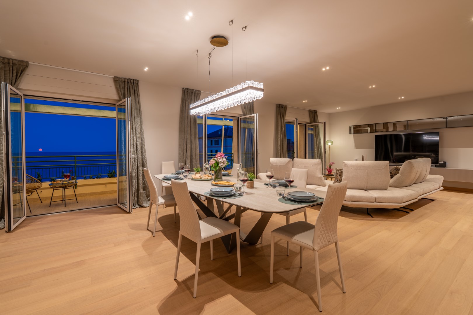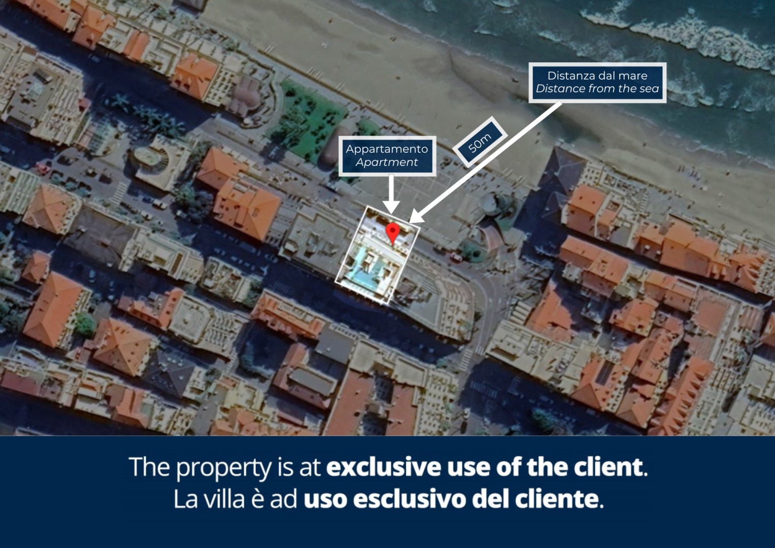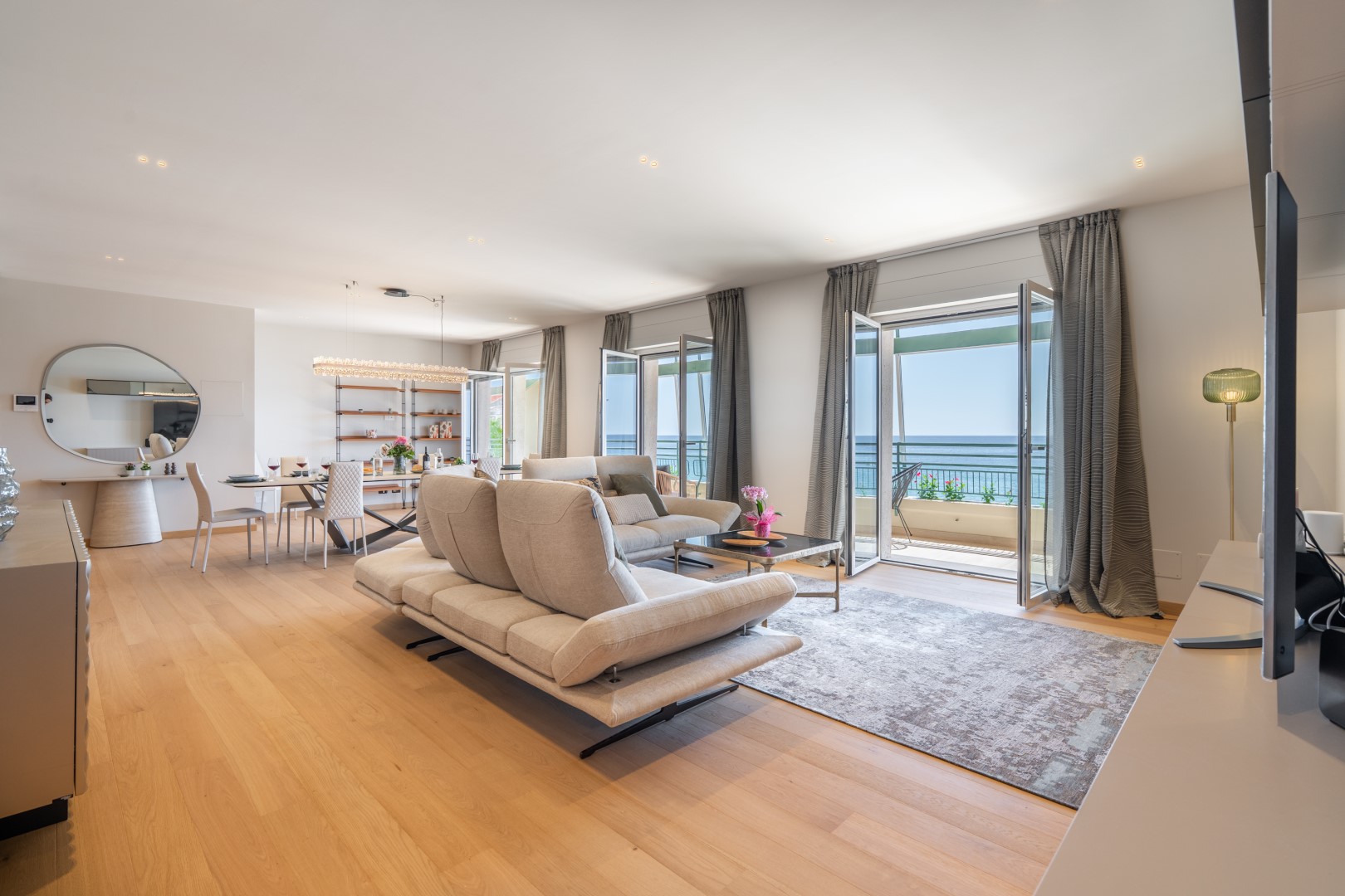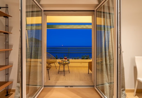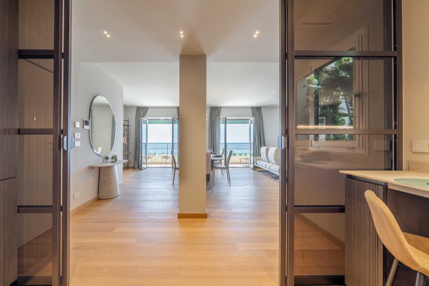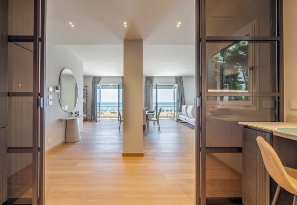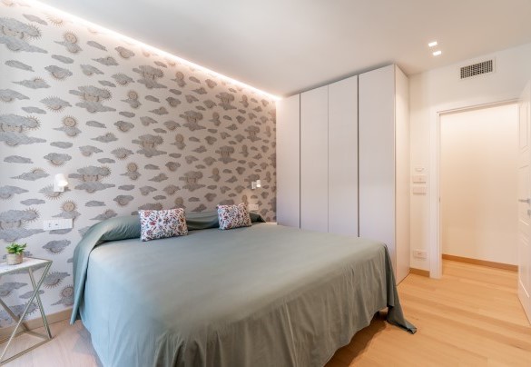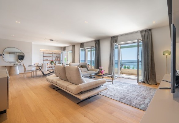 L’appartamento si trova al terzo piano di un elegante stabile, comodamente raggiungibile con ascensore dopo una breve rampa di otto gradini. Disposto su un unico livello, presenta un ingresso che conduce a un ampio open space con cucina a vista, zona pranzo e zona living, entrambi con affaccio e accesso diretto alla terrazza coperta, arredata con salotto per godere della brezza marina in ogni momento della giornata. Un lungo disimpegno con armadio a muro collega la camera padronale con bagno en suite con doccia, due camere matrimoniali, due bagni con doccia.