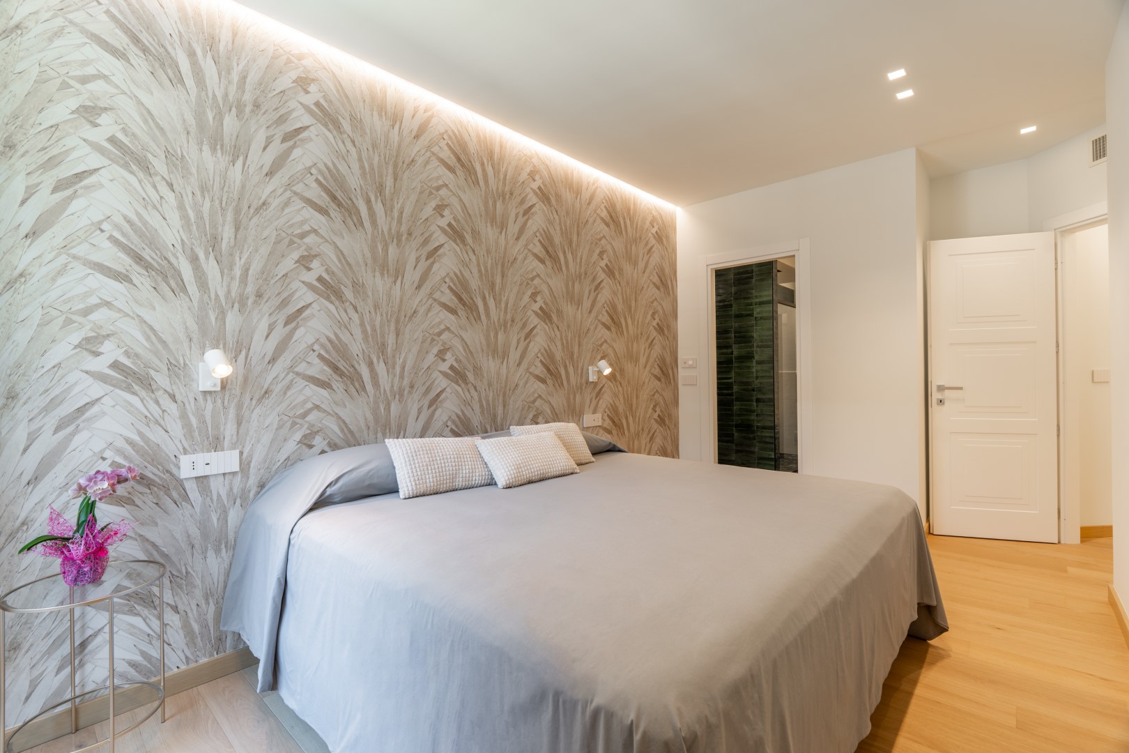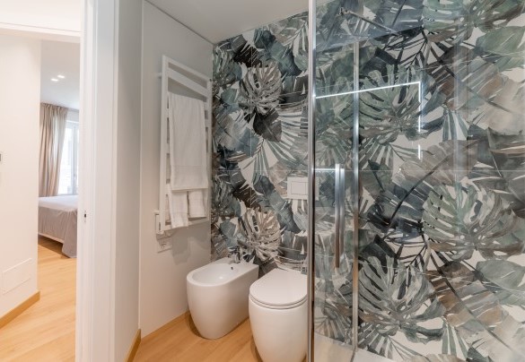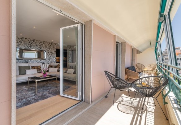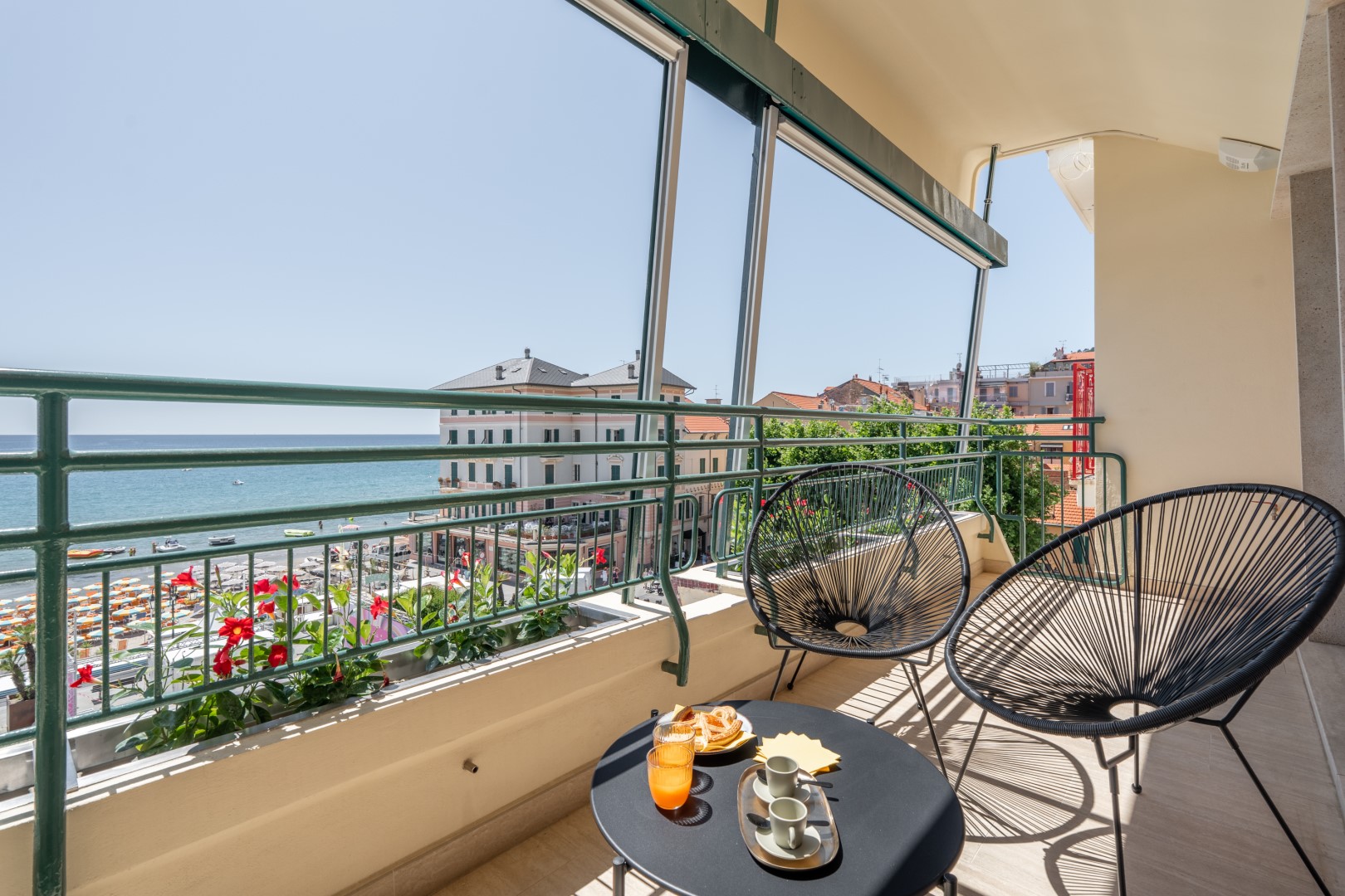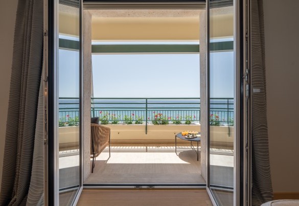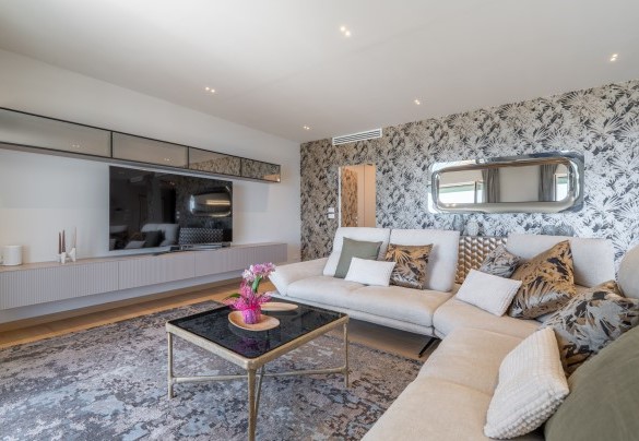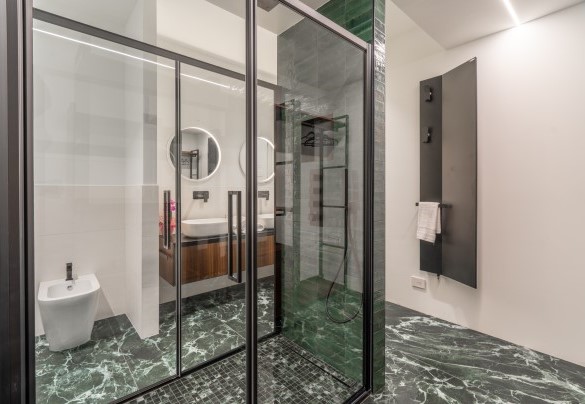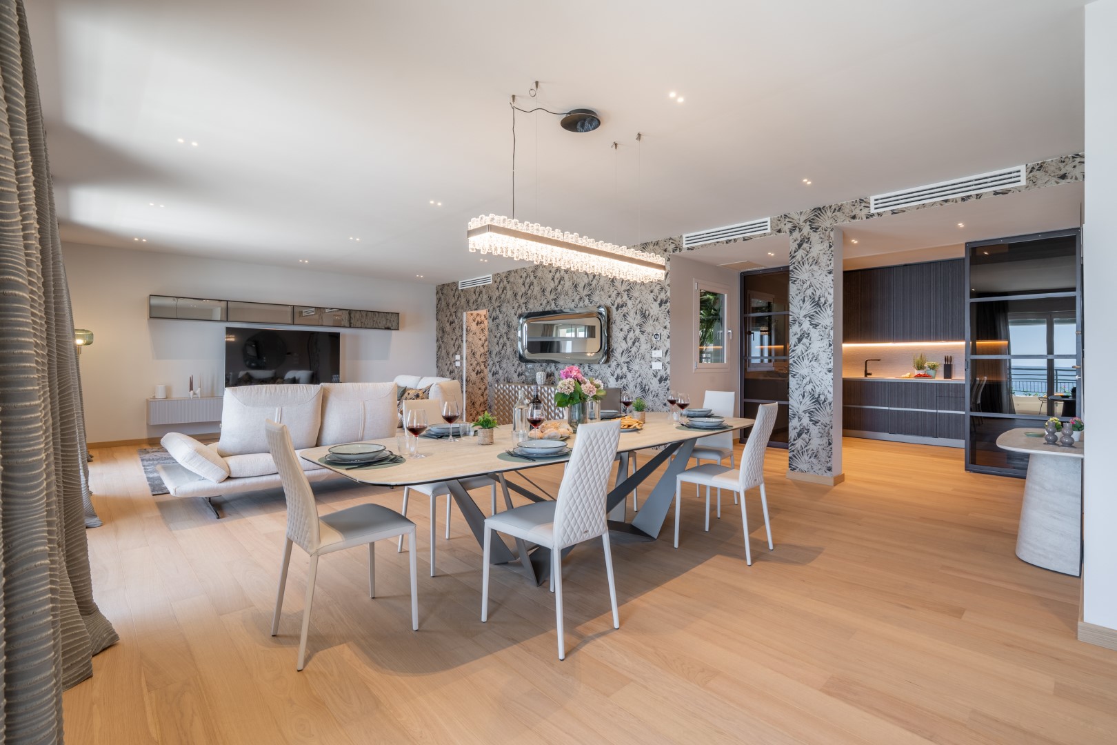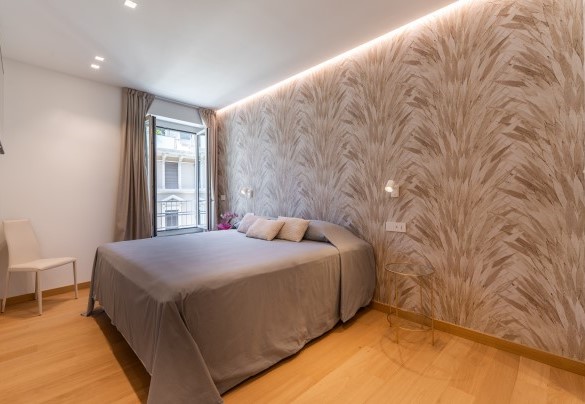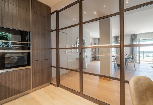 L’appartamento si trova al terzo piano di un elegante stabile, comodamente raggiungibile con ascensore dopo una breve rampa di otto gradini. Disposto su un unico livello, presenta un ingresso che conduce a un ampio open space con cucina a vista, zona pranzo e zona living, entrambi con affaccio e accesso diretto alla terrazza coperta, arredata con salotto per godere della brezza marina in ogni momento della giornata. Un lungo disimpegno con armadio a muro collega la camera padronale con bagno en suite con doccia, due camere matrimoniali, due bagni con doccia.