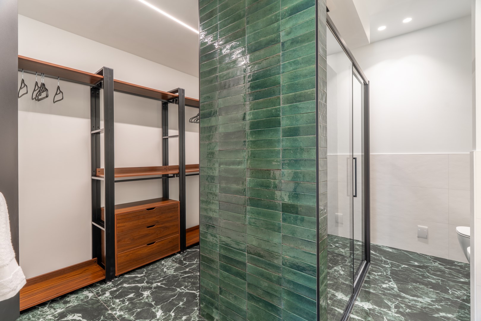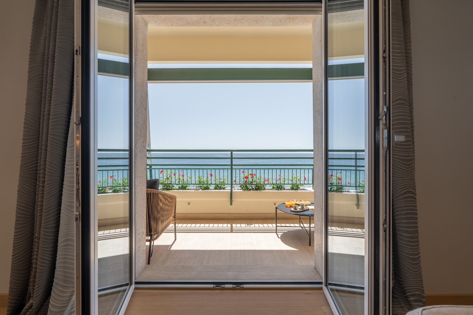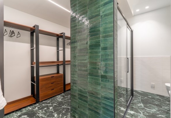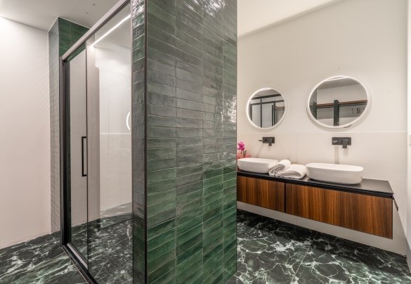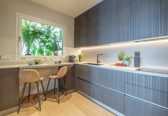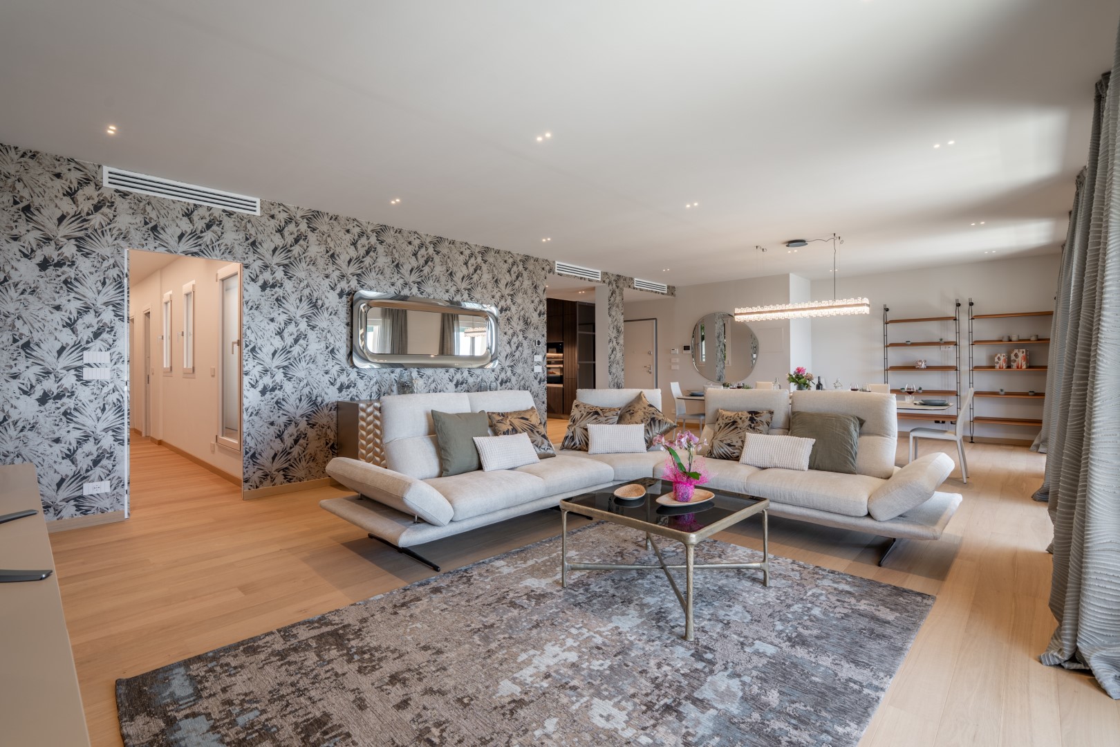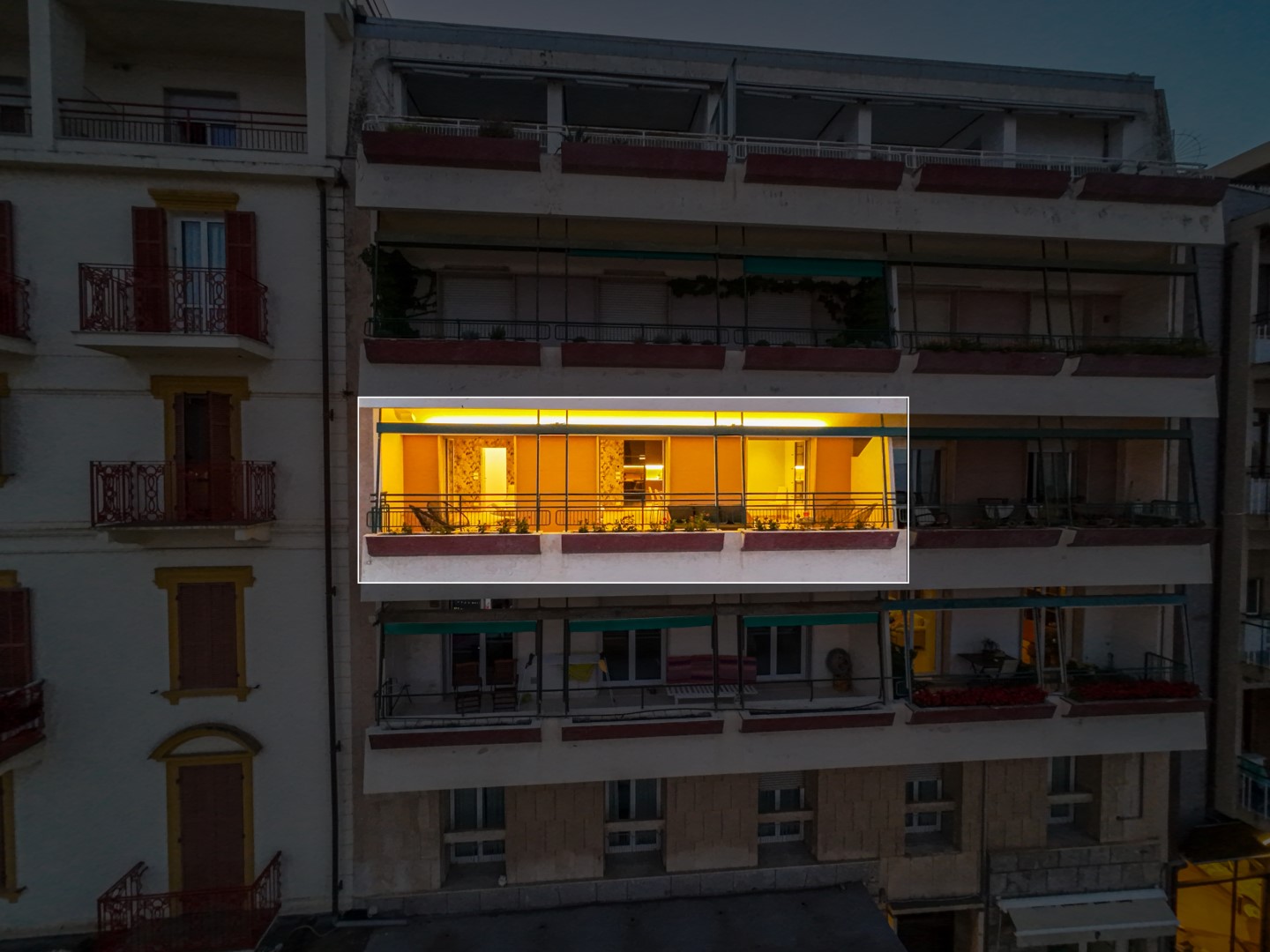 L’appartamento si trova al terzo piano di un elegante stabile, comodamente raggiungibile con ascensore dopo una breve rampa di otto gradini. Disposto su un unico livello, presenta un ingresso che conduce a un ampio open space con cucina a vista, zona pranzo e zona living, entrambi con affaccio e accesso diretto alla terrazza coperta, arredata con salotto per godere della brezza marina in ogni momento della giornata. Un lungo disimpegno con armadio a muro collega la camera padronale con bagno en suite con doccia, due camere matrimoniali, due bagni con doccia.