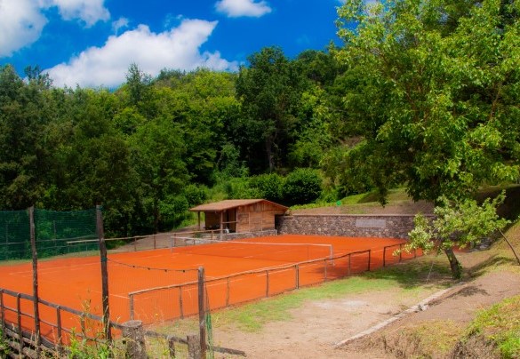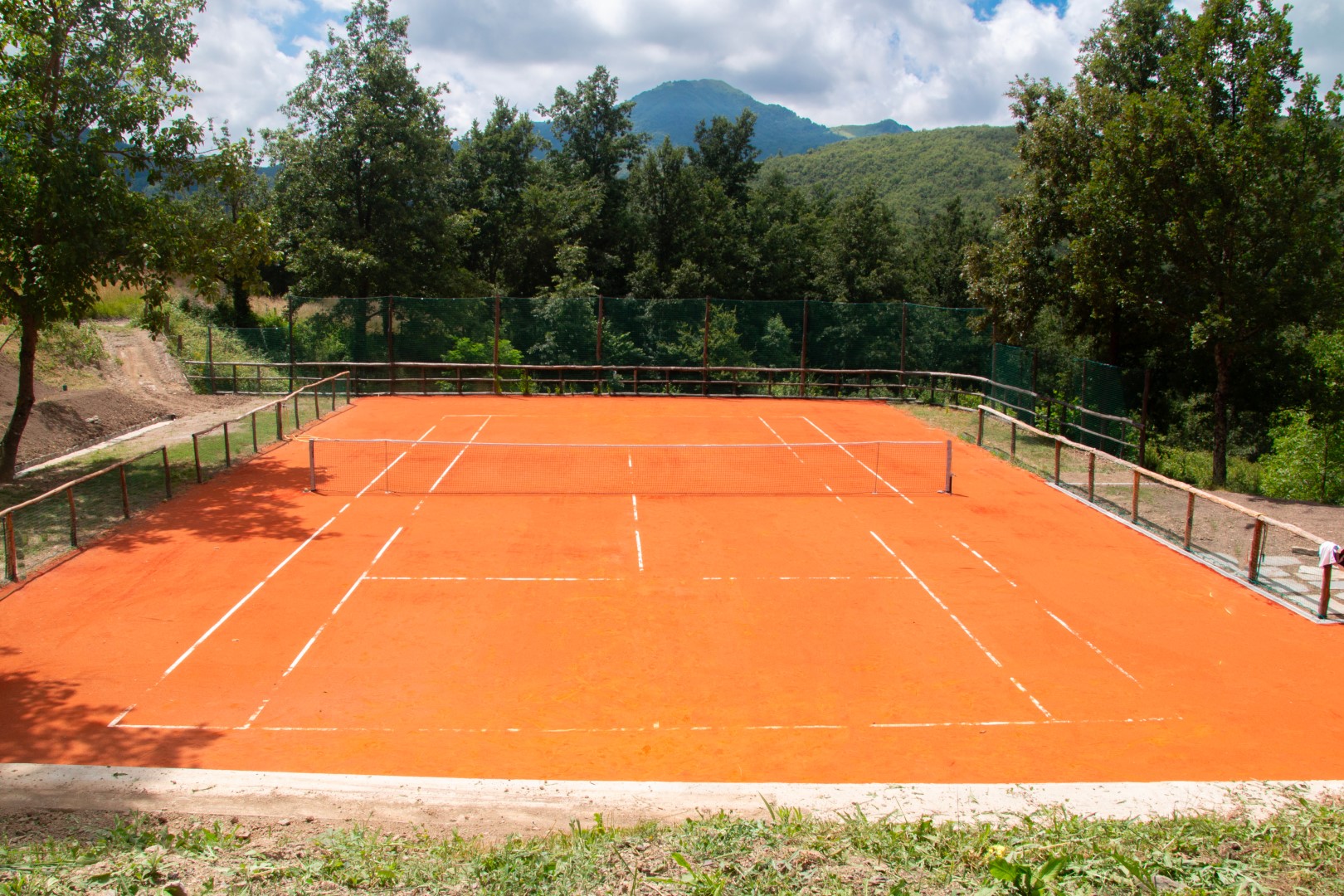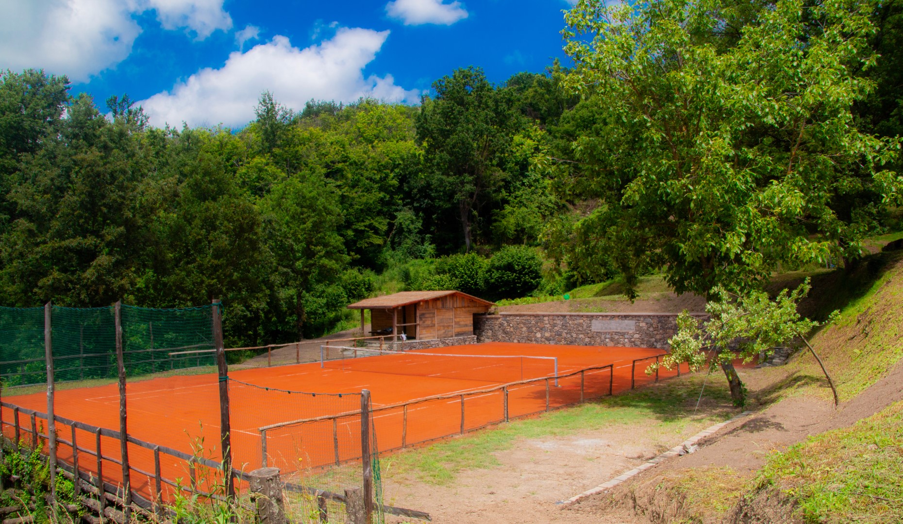 Il campo da tennis rivestito in materiale sintetico con misure regolamentari si trova all'interno del parco in posizione inferiore rispetto alla villa.