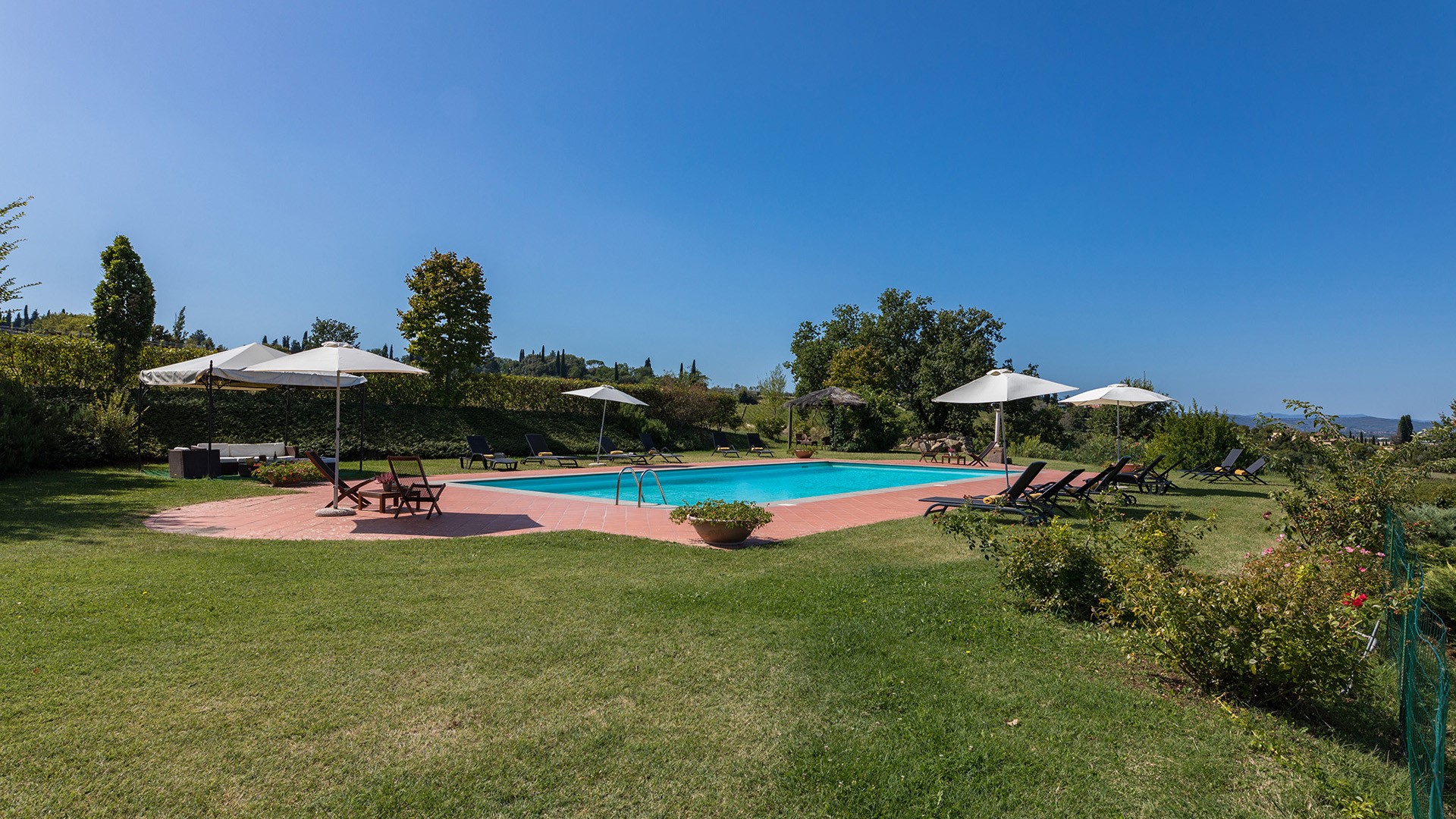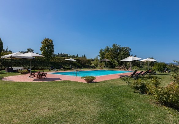 La grande piscina rettangolare completamente recintata e in posizione riservata e panoramica, si trova al centro di un'ampia superficie lastricata in cotto e poi a prato, su cui sono sistemati lettini prendisole e gazebo. Dista circa 30 m dalla villa e si raggiunge in pochi passi attraverso il giardino. La vasca, rivestita in PVC con bordo in pietra, misura 9 x 18 m con una profondità che accresce da 1,40 m fino a 2,5 m. E' munita di scaletta di accesso e di illuminazione interna. A disposizione c'è una doccia con acqua fredda. La piscina è depurata con trattamento a ossigeno e resterà aperta dall’ultimo sabato di aprile al primo sabato di ottobre.