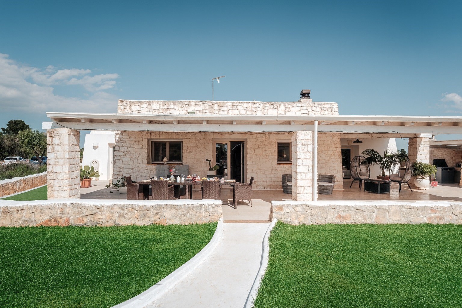 The one-floor property can sleep up to a maximum of seven people as there are three bedrooms, all with en-suite bathrooms (plus a single sofa bed in the living room). The rooms are characterized by stone barrel vaults: a large covered veranda, the living room with fully-equipped open kitchen. A corridor leads to the sleeping area. The trullo bedroom is a double with en-suite bathroom with stone bathtub and shower stall. The other two bedrooms are a double with en-suite bathroom with shower and a twin with joinable beds and en-suite bathroom with shower. The property is completed by a small spa with hydro-massage tub (available with extra cost with exception of July and August) and private lounge.