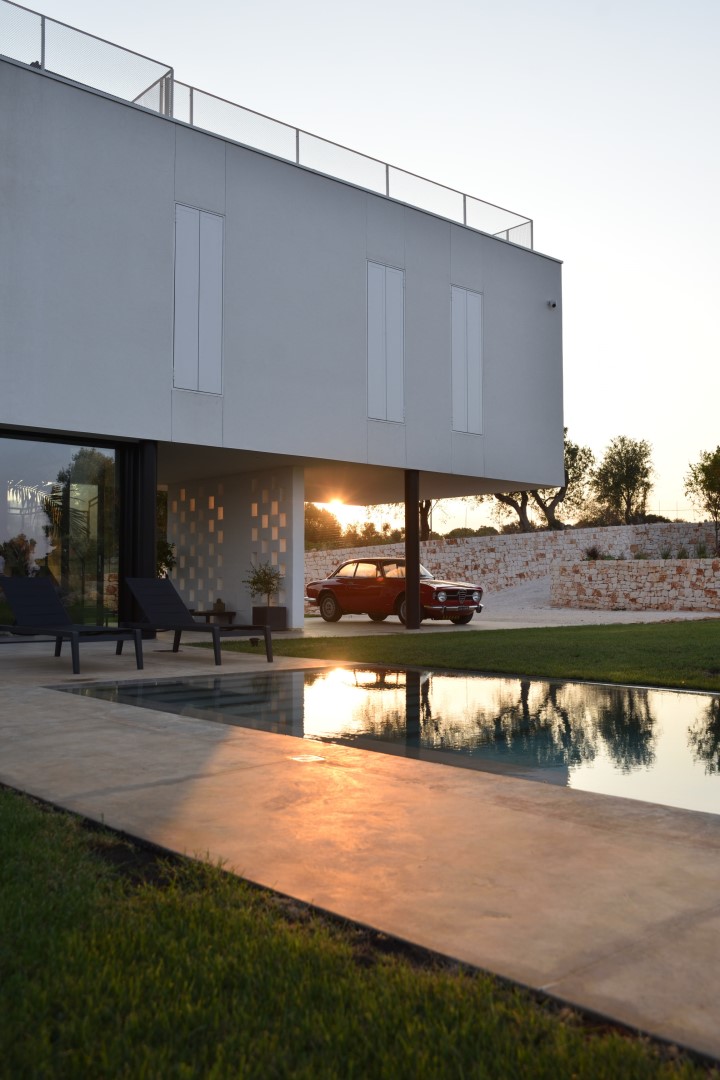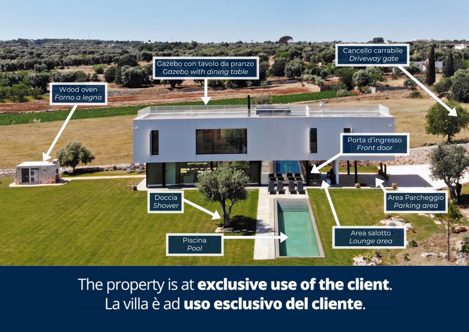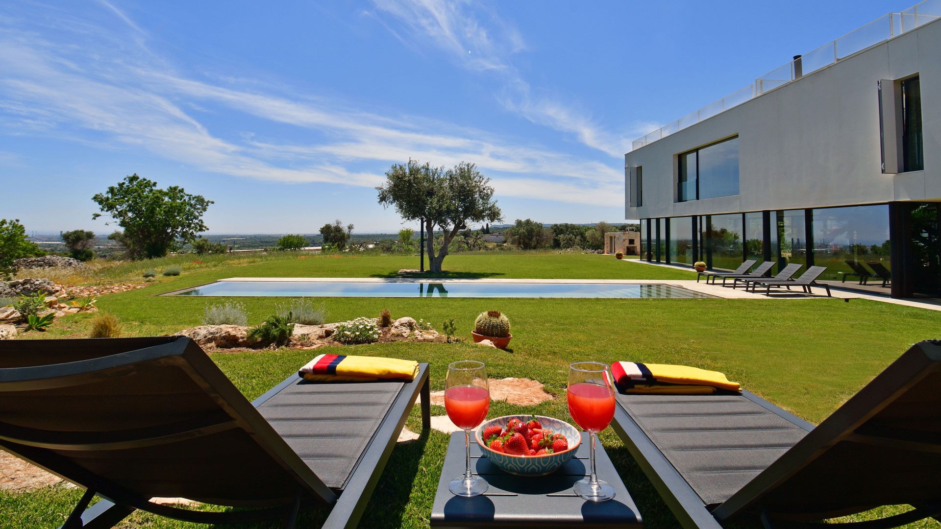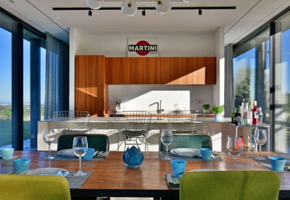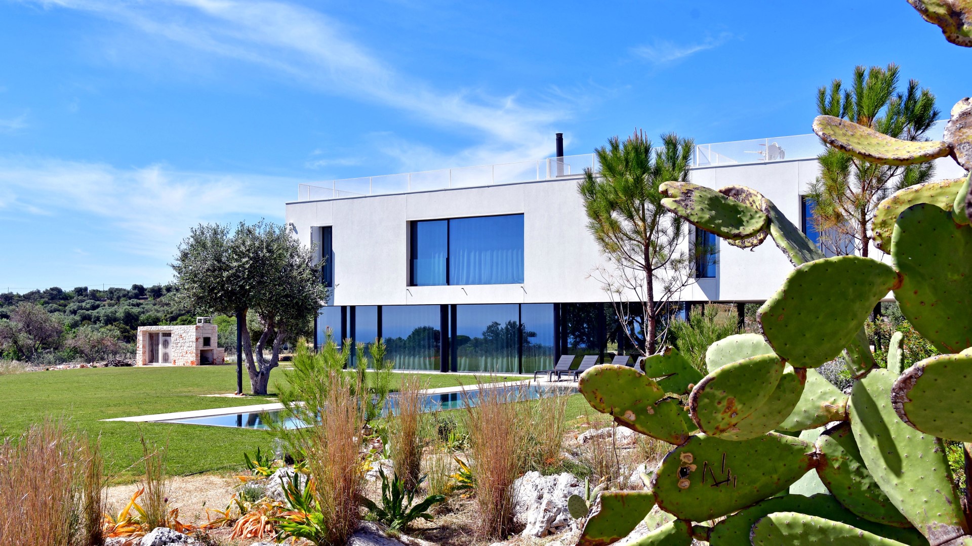 Large windows surround the villa, offering uninterrupted views of the surrounding countryside and centuries-old olive groves that stretch toward the sea of Polignano. A modern-design swimming pool lies in front of the villa, accompanied by a covered lounge area. At the back, a dining table shaded by a gazebo next to a wood-fired oven.