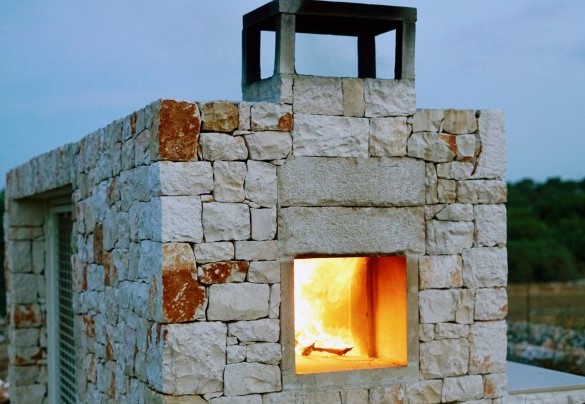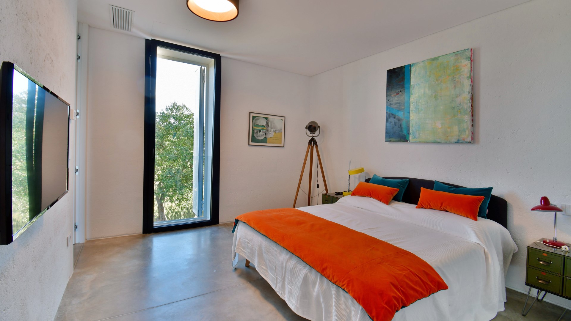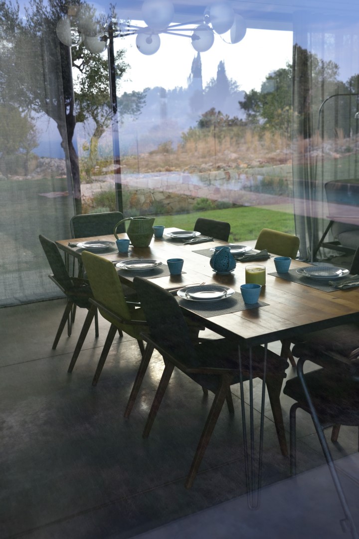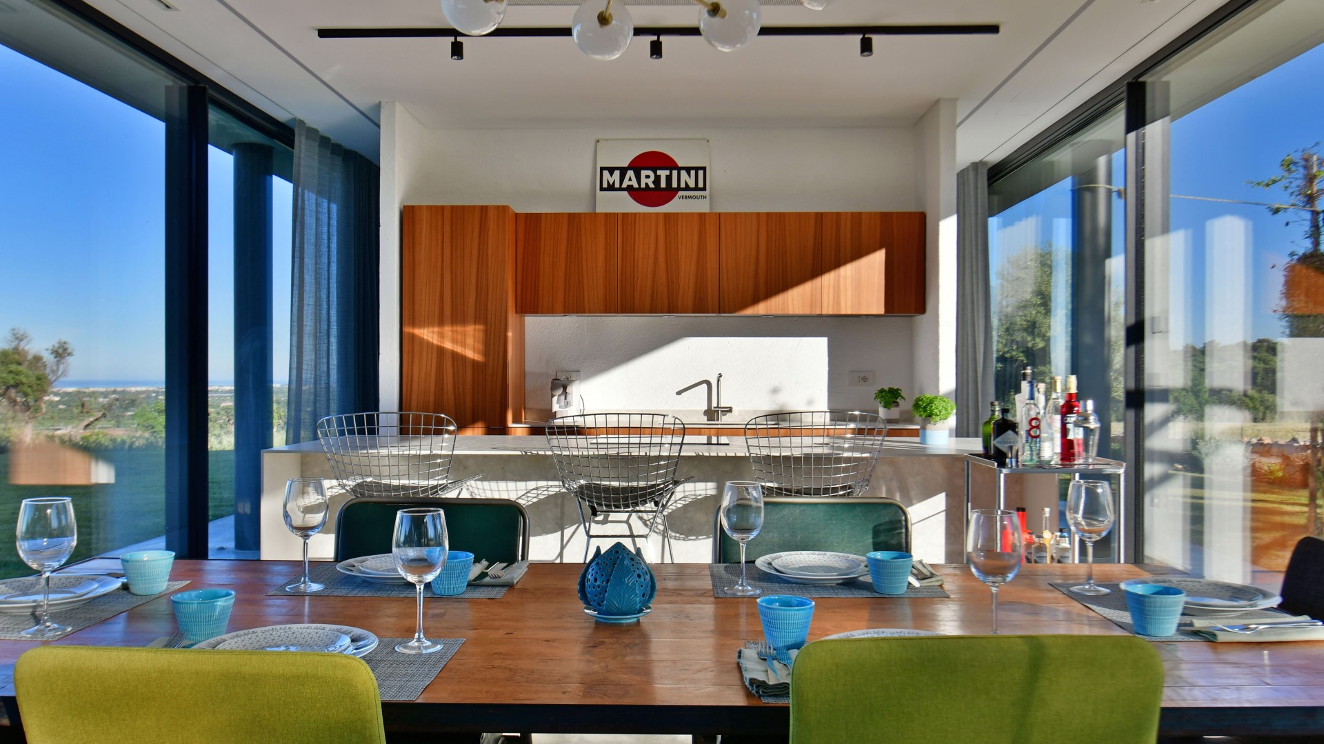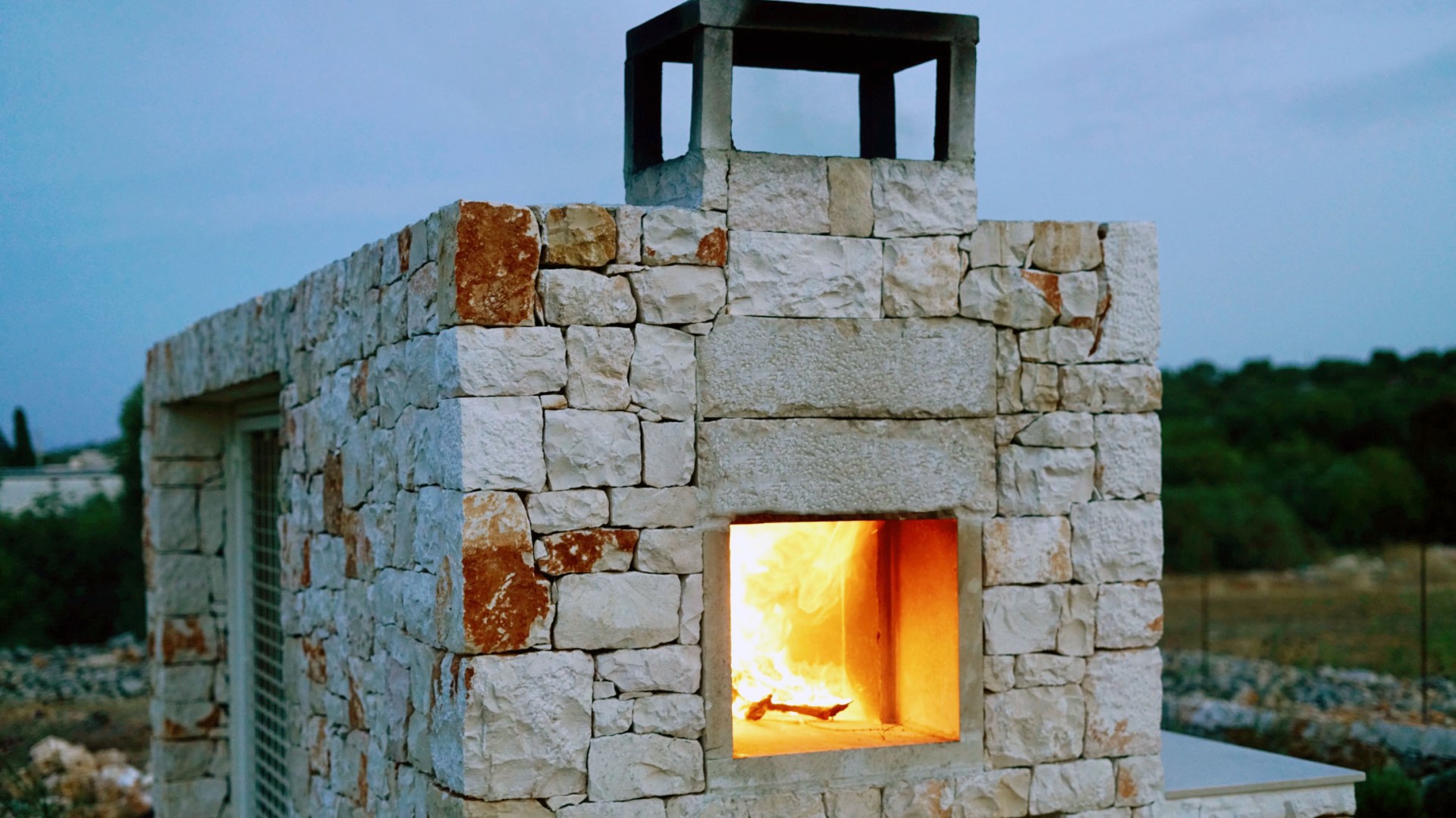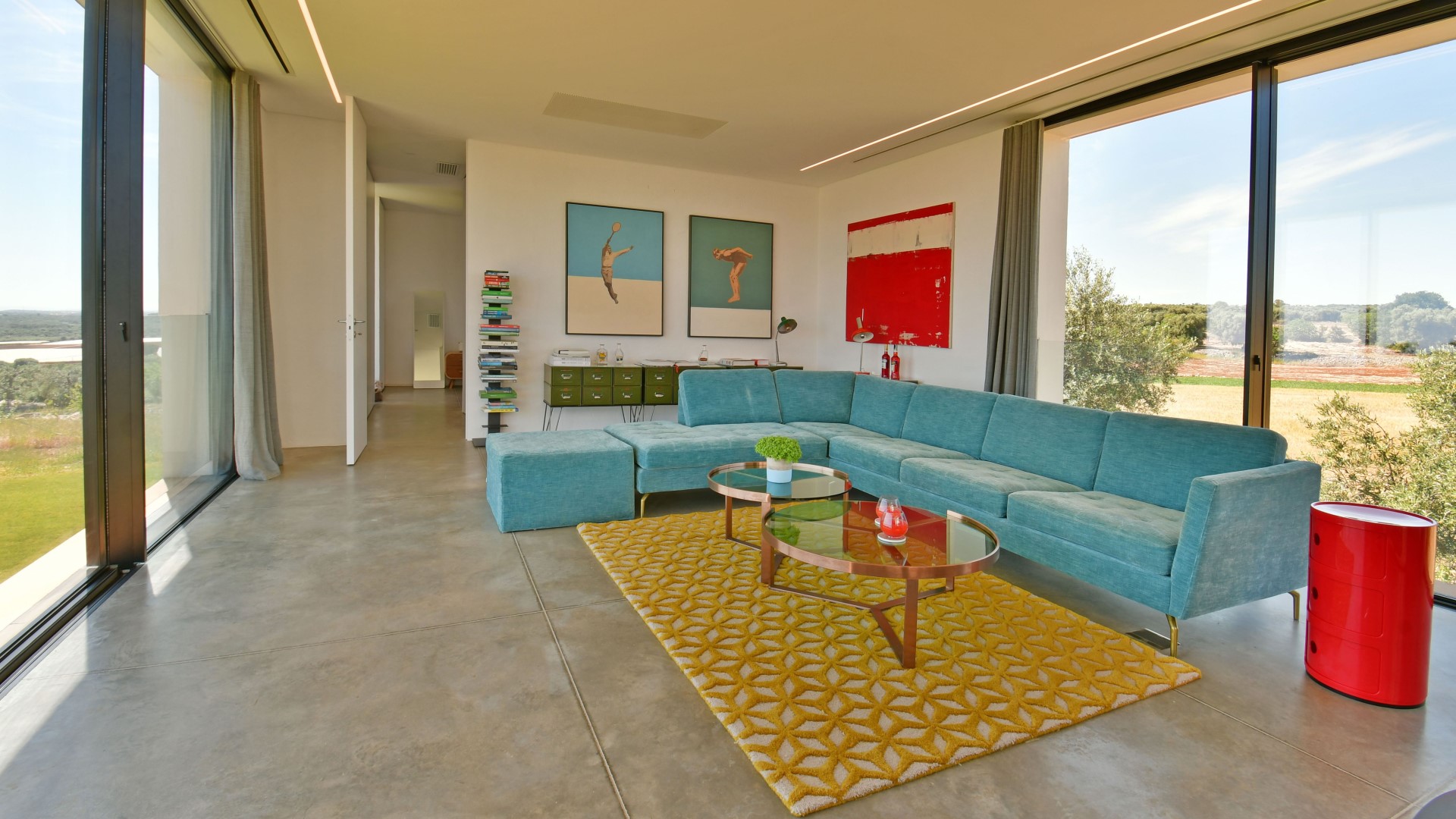 Large windows surround the villa, offering uninterrupted views of the surrounding countryside and centuries-old olive groves that stretch toward the sea of Polignano. A modern-design swimming pool lies in front of the villa, accompanied by a covered lounge area. At the back, a dining table shaded by a gazebo next to a wood-fired oven.
