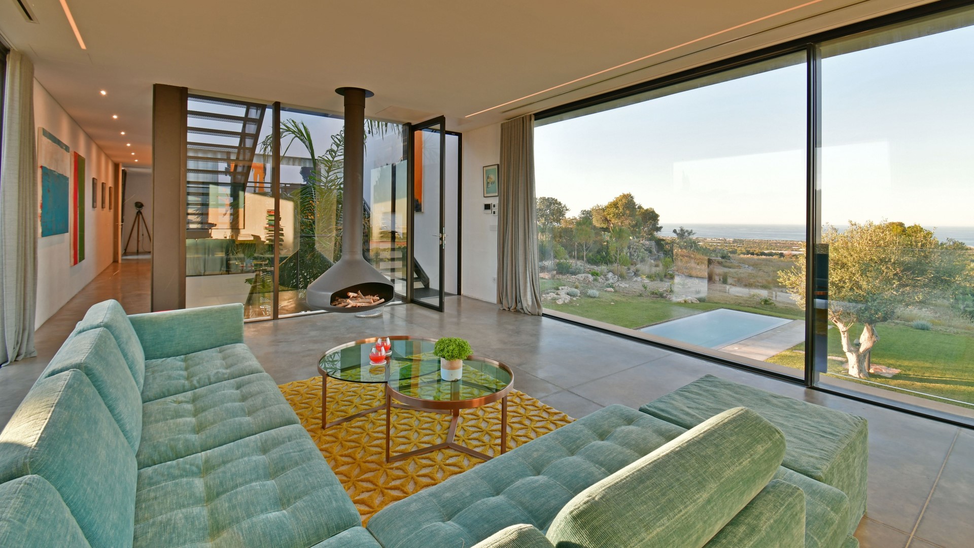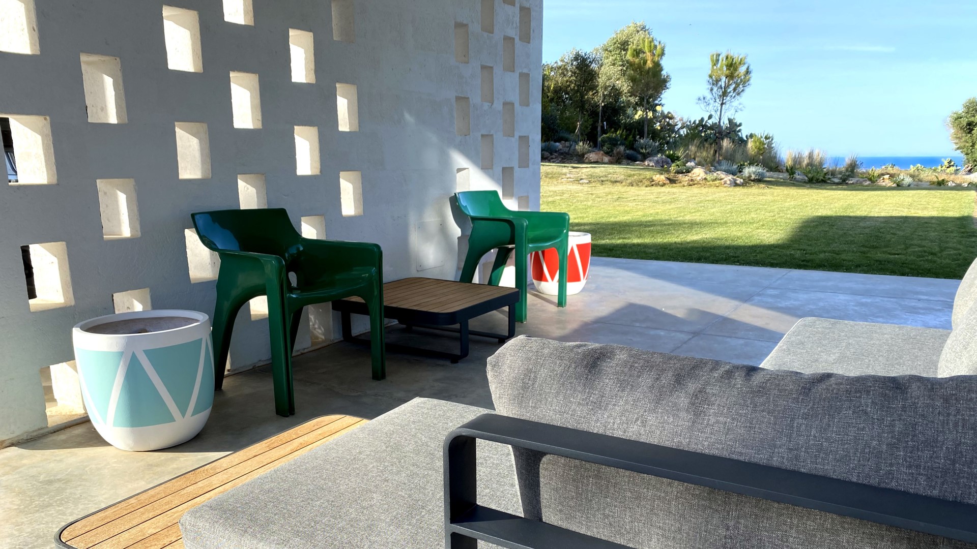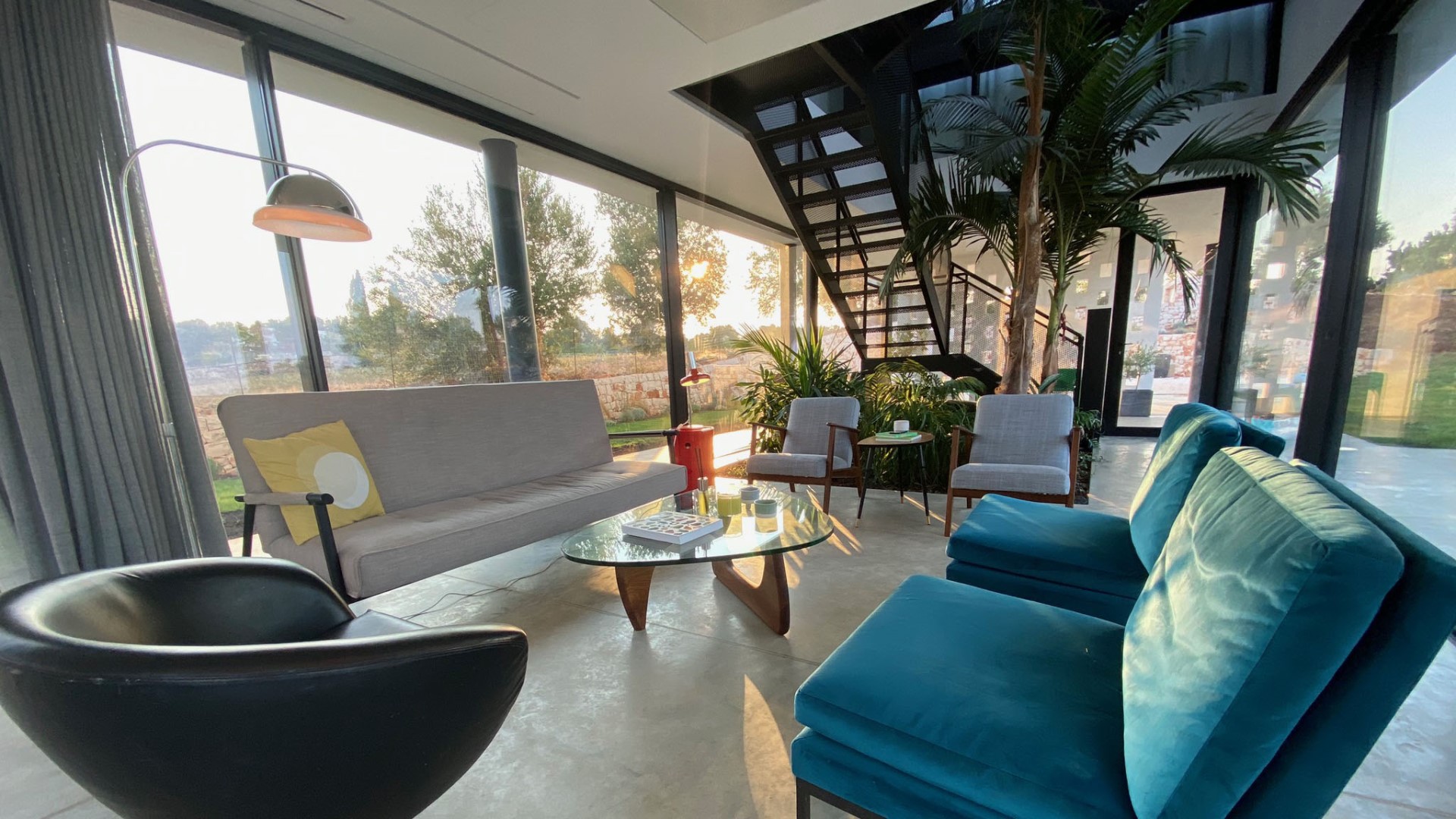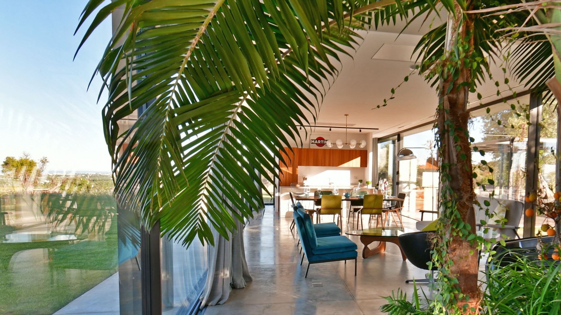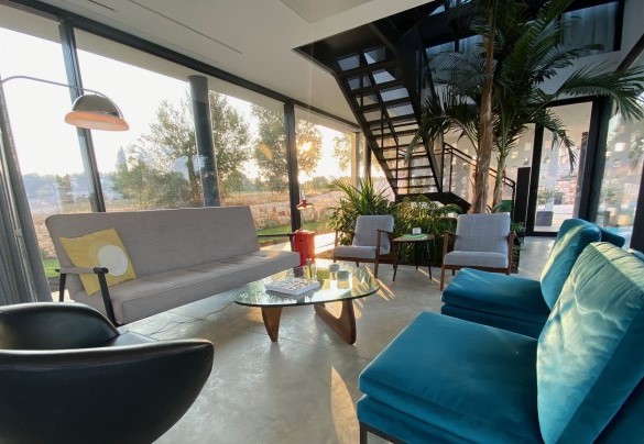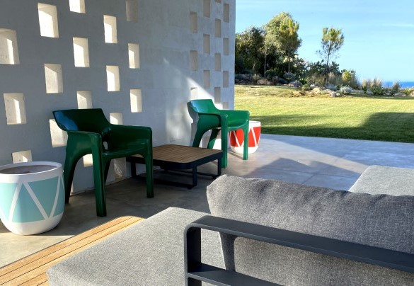 RECEPTIVE STRUCTURE. Perched on a UNESCO-protected hillside, the villa blends seamlessly with its natural surroundings, creating a harmonious dialogue between architecture and landscape. Designed by acclaimed architect Daniele Corsaro from Grottaglie, the villa reflects a modernist aesthetic, inspired by Le Corbusier’s Pavillon House and the indoor-outdoor style of Californian architects such as Eames, Eichler, and Neutra. A standout feature is the internal courtyard garden, framed by a steel staircase and enriched with tropical plants, forming an integral part of the living spaces. Combining advanced technology with Apulian tradition, the villa’s exterior showcases local materials, including dry-stone walls and tuff stone. Spread over two levels, the villa is bright and welcoming, with large windows that fill every room with natural light. The ground floor features a multifunctional open space linking the living room, dining area, and kitchen, creating a convivial and dynamic atmosphere. Upstairs, the living area is centered around a suspended Gyrofocus fireplace, while vintage pieces, including Bertoia chairs, add charm and style.