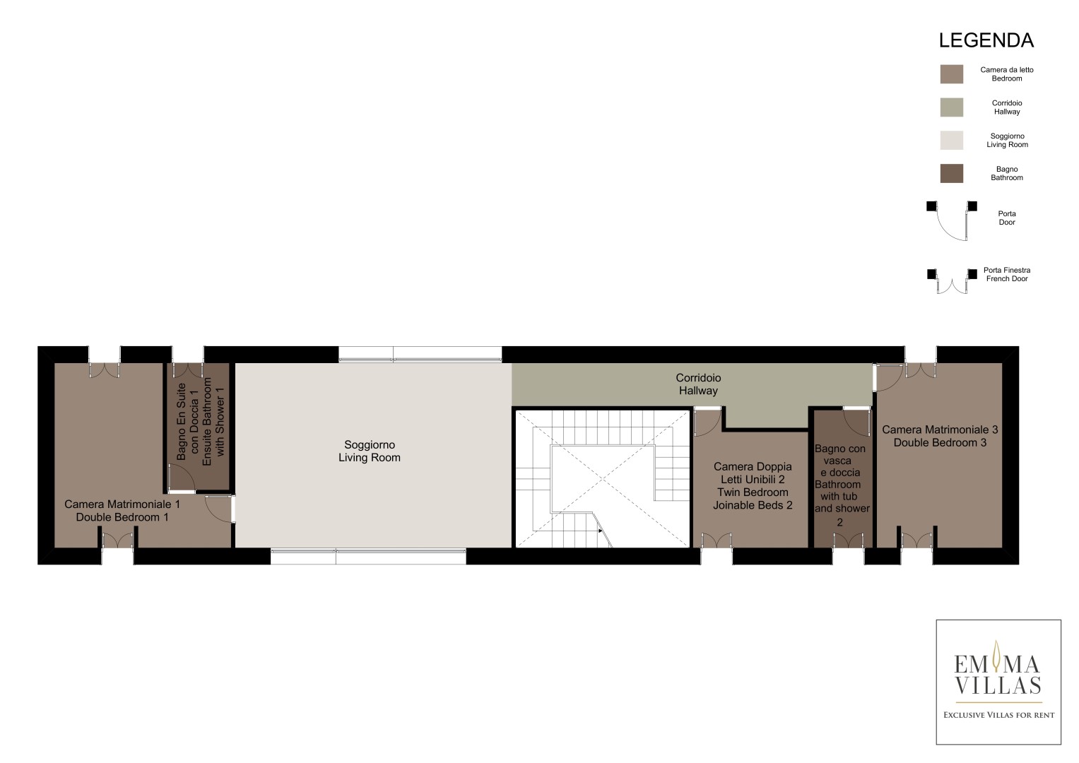 FIRST FLOOR – Living area; double bedroom with en-suite bathroom with shower; double bedroom; twin bedroom with joinable beds; bathroom with shower and tub.