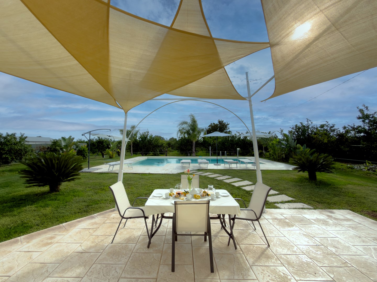 The villa is surrounded by lemon trees and flat lawn areas within a two-hectare estate. The area nearest the house is planted with hedges, flowering shrubs and potted plants. A shaded outdoor dining area is positioned beside the villa, near the pool terrace. The parking area is located just inside the main entrance gate.
