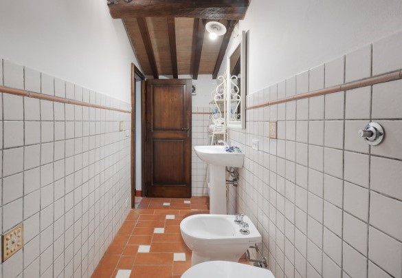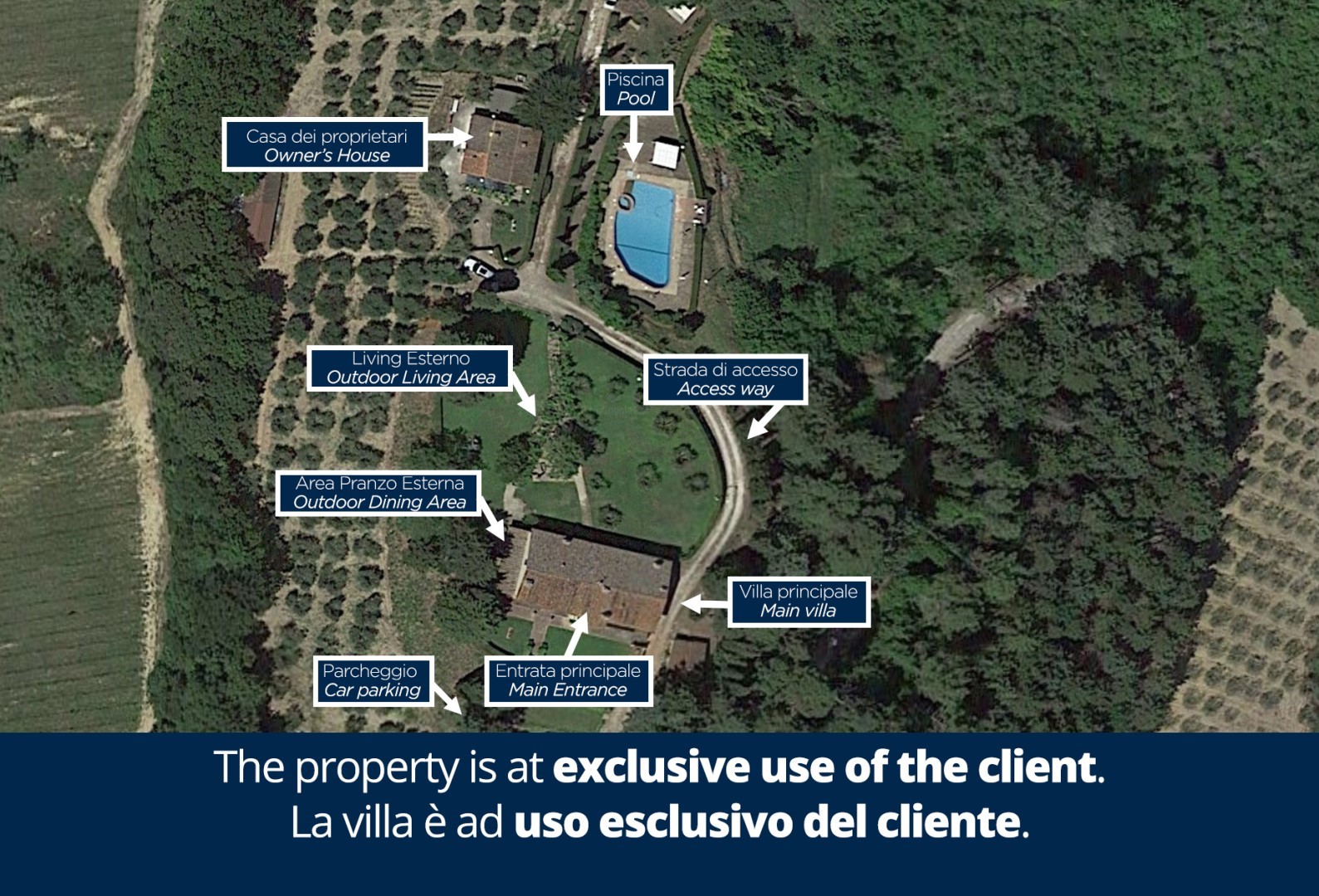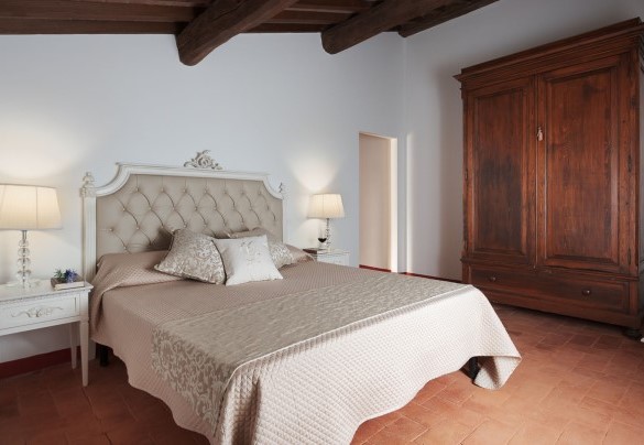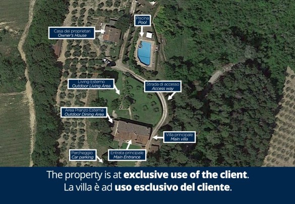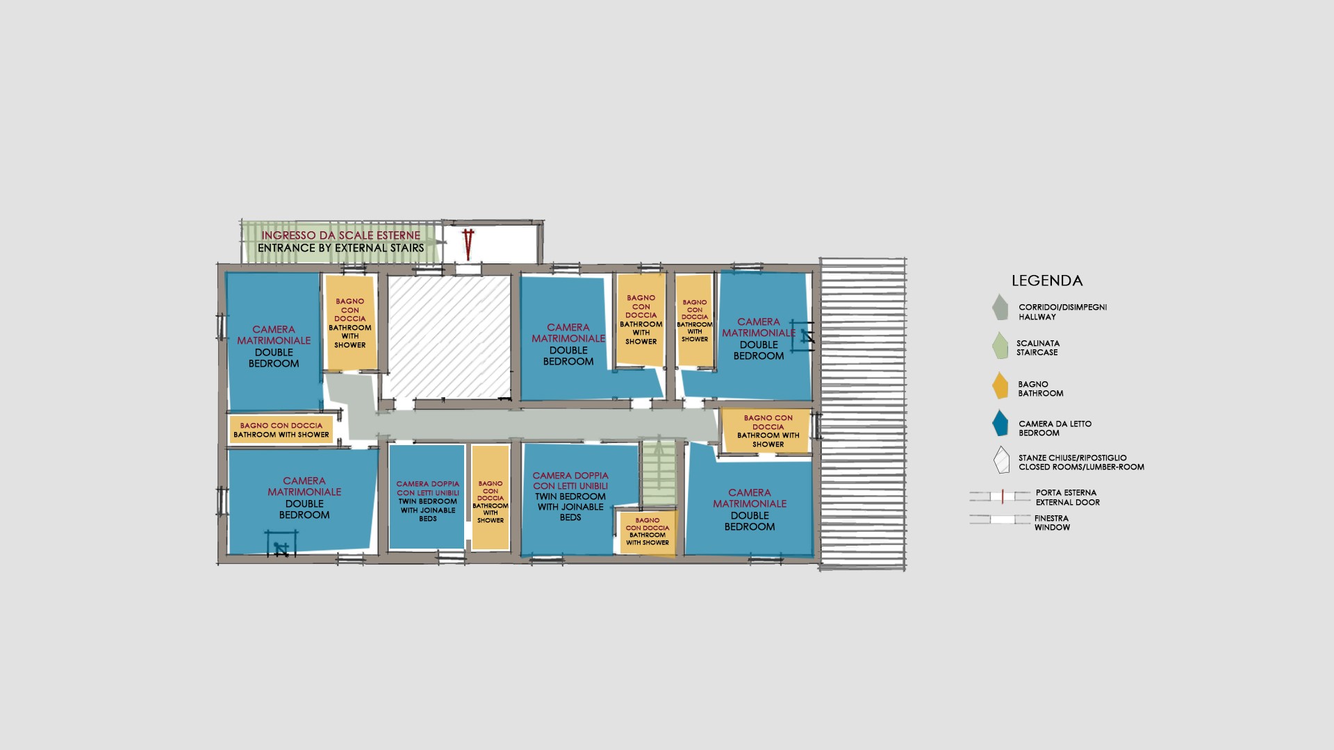 The house has two floors; an external stone staircase goes up to the old watchtower where there is today a small porticoed terrace, ideal for enjoying a good glass of wine and which also has access from the inside in correspondence to the small relax room. The main entrance on the ground floor leads into a hallway communicating with a large room that extends along the length of the villa and inside which is a billiard table, a seating area in front of the historic ornamental fireplace and a large dining room communicating with the beautiful, fully-equipped kitchen. Also on the ground floor is a sitting room with TV and, up two steps, a bathroom with shower and laundry. A terracotta staircase goes up to the first floor with three double bedrooms with ensuite bathroom, two bedrooms with single, joinable beds with ensuite bathroom, one double bedrooms with ensuite bathroom and one double with french bed ensuite bathroom.