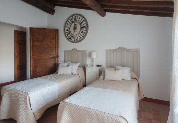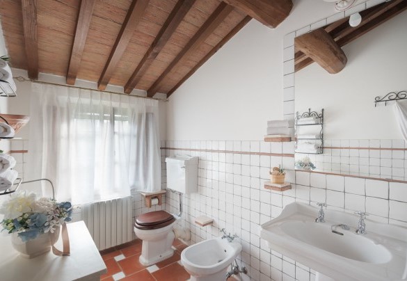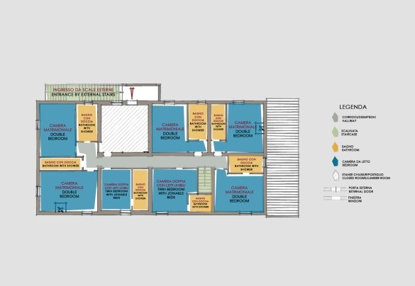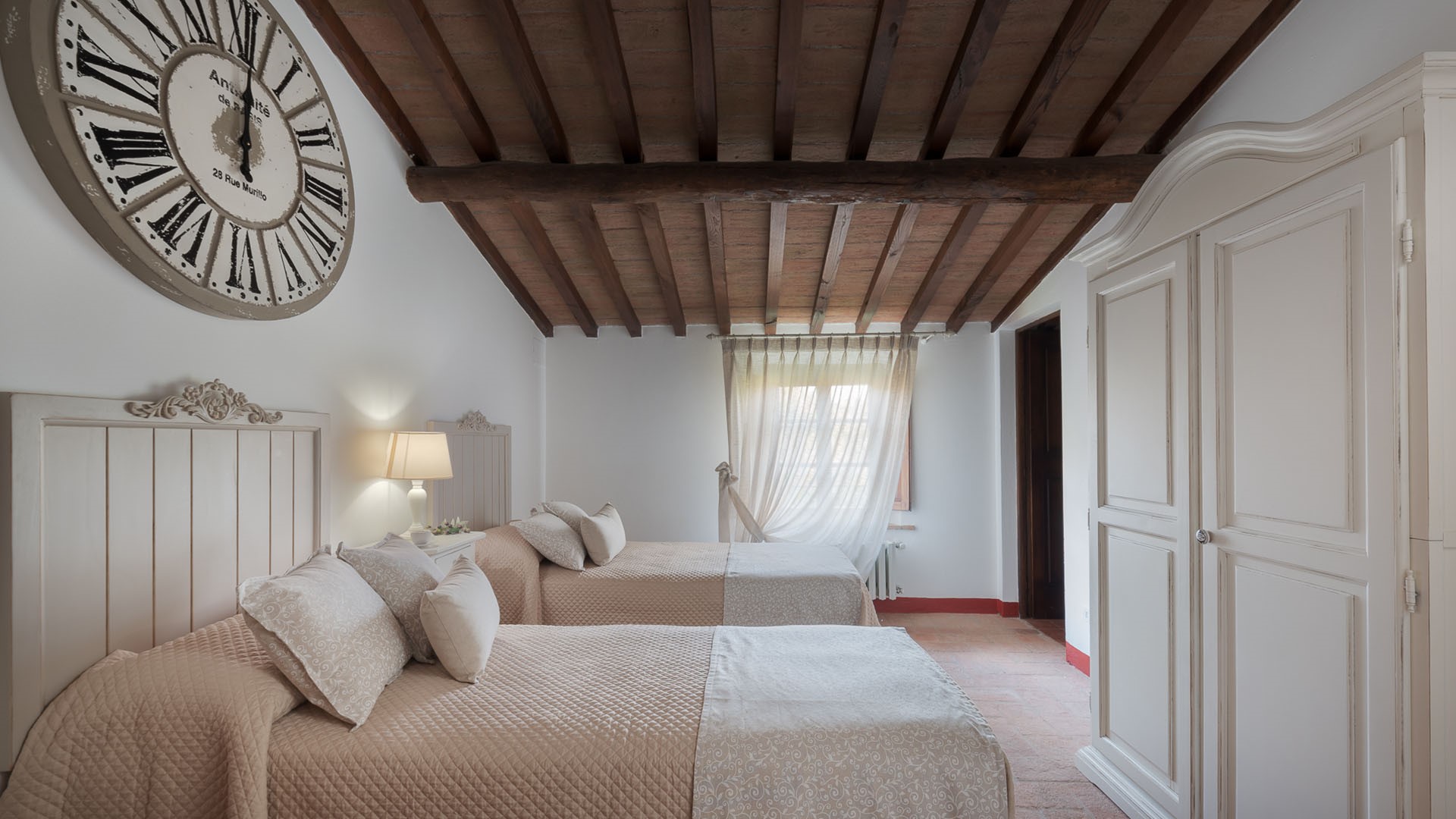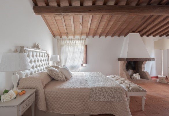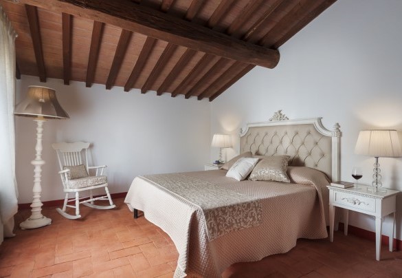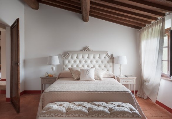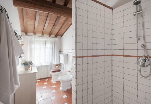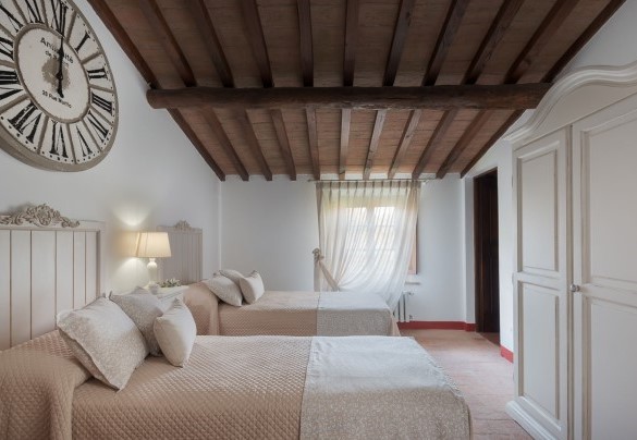 The house has two floors; an external stone staircase goes up to the old watchtower where there is today a small porticoed terrace, ideal for enjoying a good glass of wine and which also has access from the inside in correspondence to the small relax room. The main entrance on the ground floor leads into a hallway communicating with a large room that extends along the length of the villa and inside which is a billiard table, a seating area in front of the historic ornamental fireplace and a large dining room communicating with the beautiful, fully-equipped kitchen. Also on the ground floor is a sitting room with TV and, up two steps, a bathroom with shower and laundry. A terracotta staircase goes up to the first floor with three double bedrooms with ensuite bathroom, two bedrooms with single, joinable beds with ensuite bathroom, one double bedrooms with ensuite bathroom and one double with french bed ensuite bathroom.