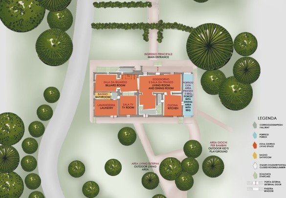 Please notice that photos are taken in spring, therefore flower blossoming, and the colours of the gardens' grass could be different at the moment of your arrival at the villa.