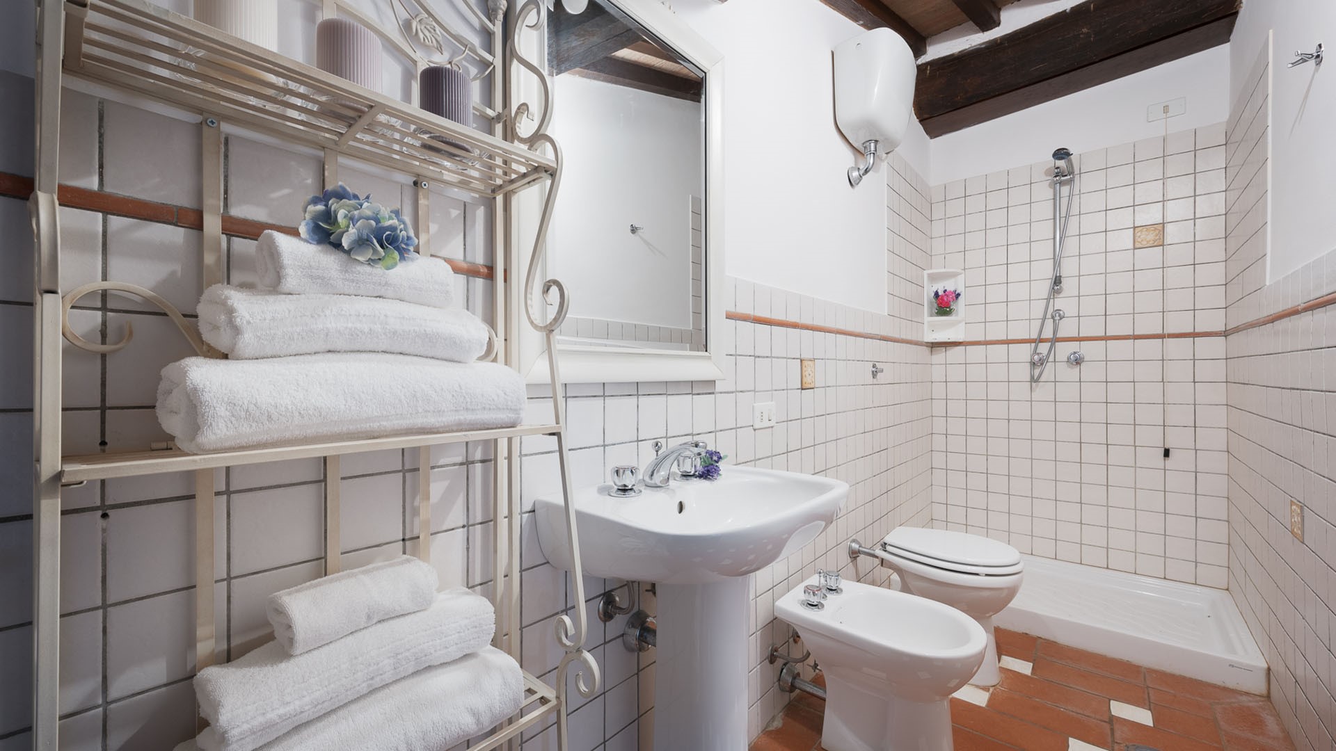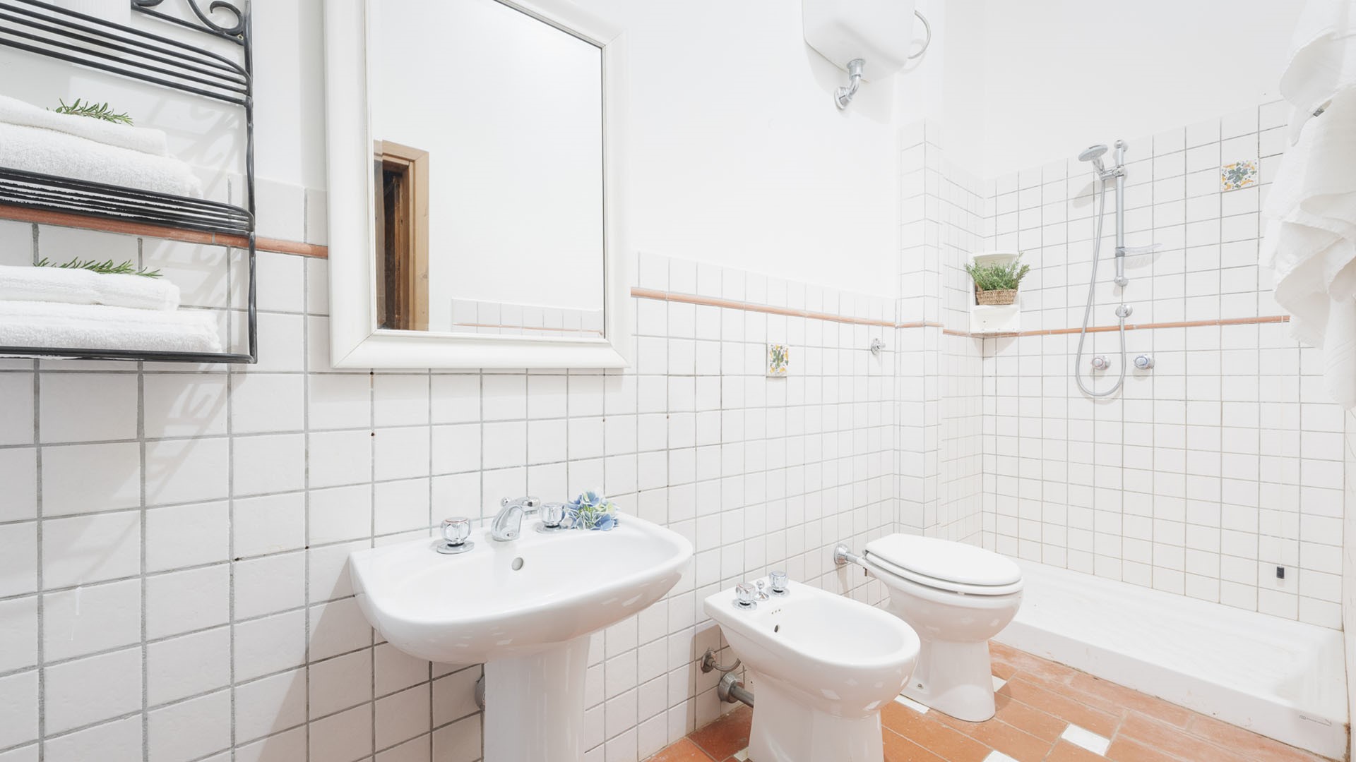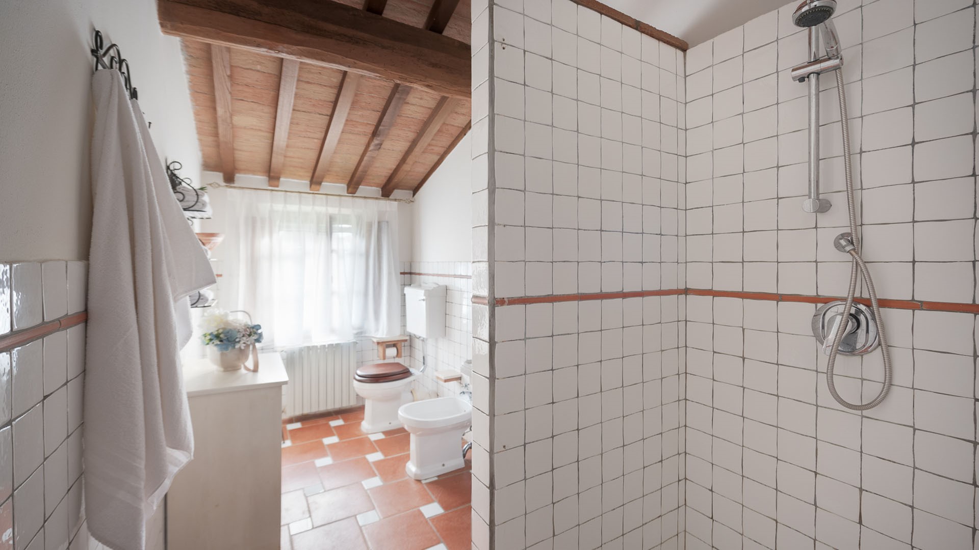 A short, cypress-lined driveway takes you from the entrance gate to the parking area near the villa. The property is surrounded by about 2000 sq m of manicured lawn, framed by holm oaks, pines, and old larches that provide shade and relief from the heat on hot summer days. Everything is embellished by shrubs of medicinal plants and bushes of roses and geraniums that lend a touch of colour to this green, tranquil oasis. The house has a beautiful portico accessed from the kitchen French window, set up with table and chairs, ideal for pleasant breakfasts as well as alfresco lunches and dinners. Guests have at their disposal a large stone barbecue where they can prepare tasty grills accompanied by a good glass of Tuscan red wine. In addition to the fenced-in lawn that surrounds the property, the remaining 5000 sq m of park adapts to the hilly morphology of the territory and merges into a vast property where olive and fruit trees, pines, willows and larches alternate in the green wooded setting where it is not rare to encounter fallow deer, roe deer, wild boar and squirrels.